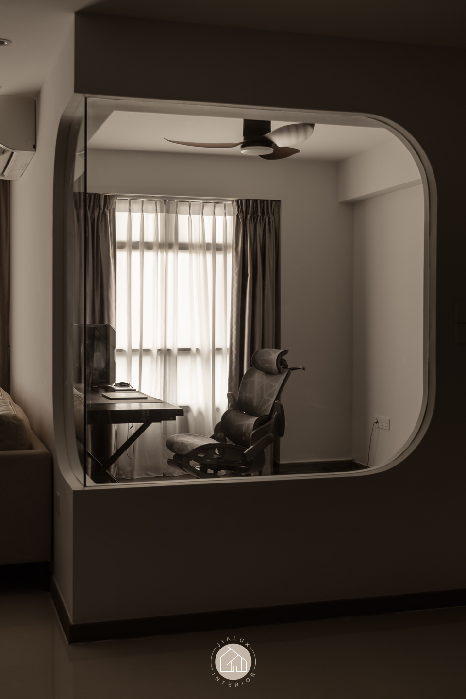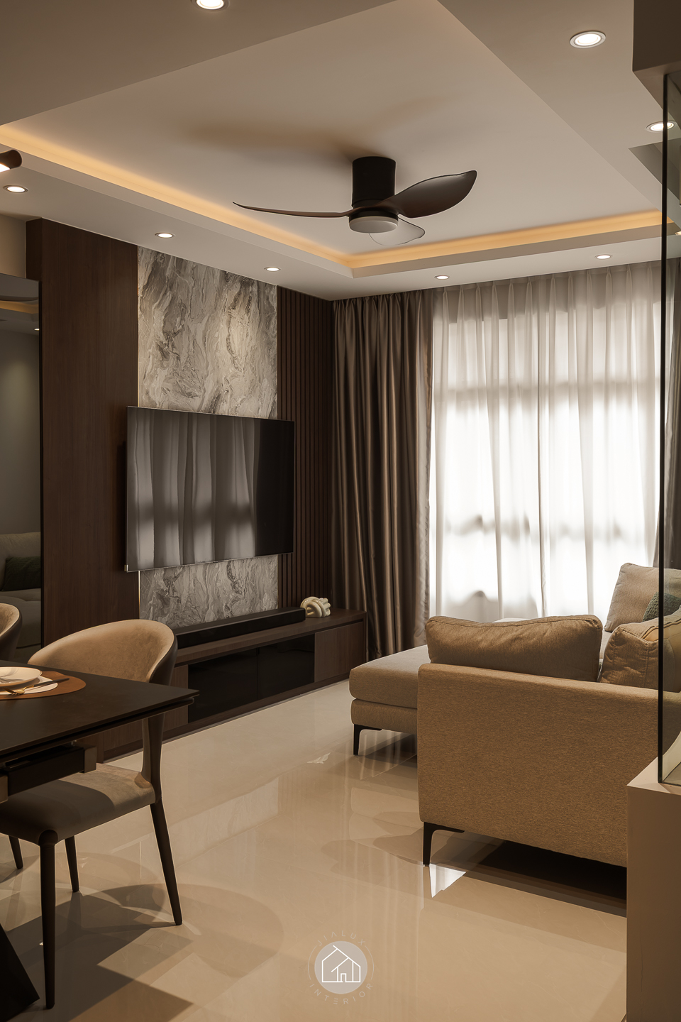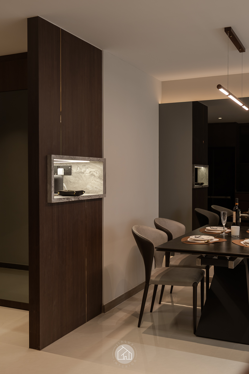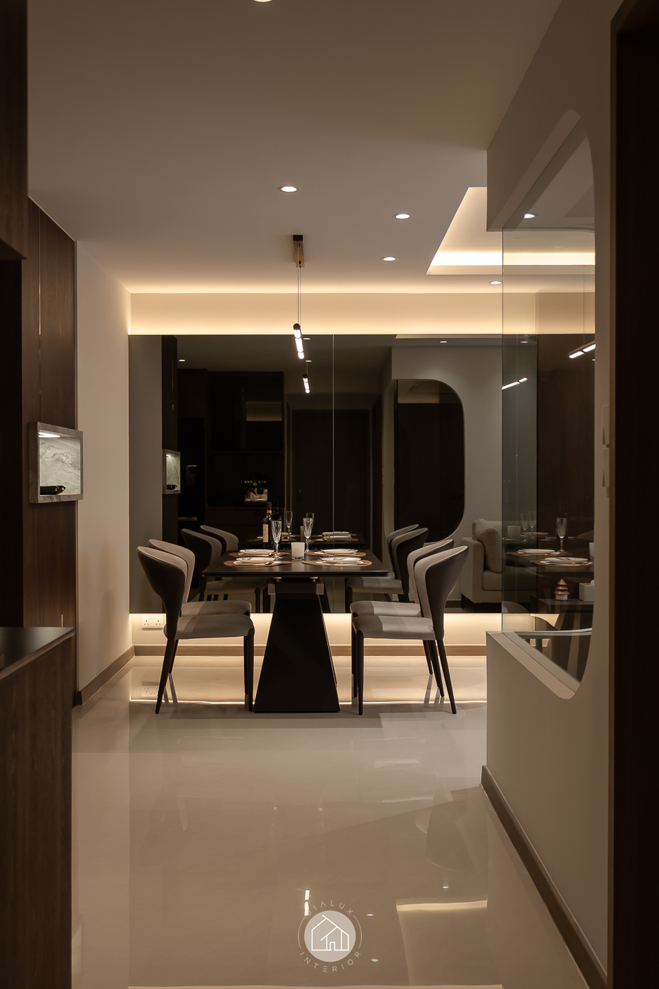 This modern contemporary home does not try to impress loudly. It earns attention through restraint, proportion, and detail. The palette is intentionally composed, where warm walnut tones are grounded by charcoal accents, and softened with clean, light walls that keep the overall mood calm and elevated. Across the main living zones, architectural lines stay crisp and purposeful. A stone feature wall frames the TV with quiet confidence, while layered lighting, including cove illumination and warm downlights, adds depth without visual clutter. In the dining area, the reflective backdrop amplifies space and glow, turning everyday meals into a more considered experience. A distinctive curved glass enclosure introduces a modern “room within a room” concept, creating a focused work zone that still feels connected to the home. Overall, the design prioritises clarity, storage, and comfort, delivered with a polished, understated finish.
