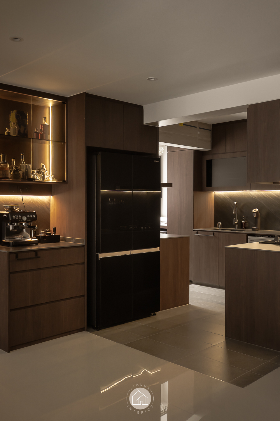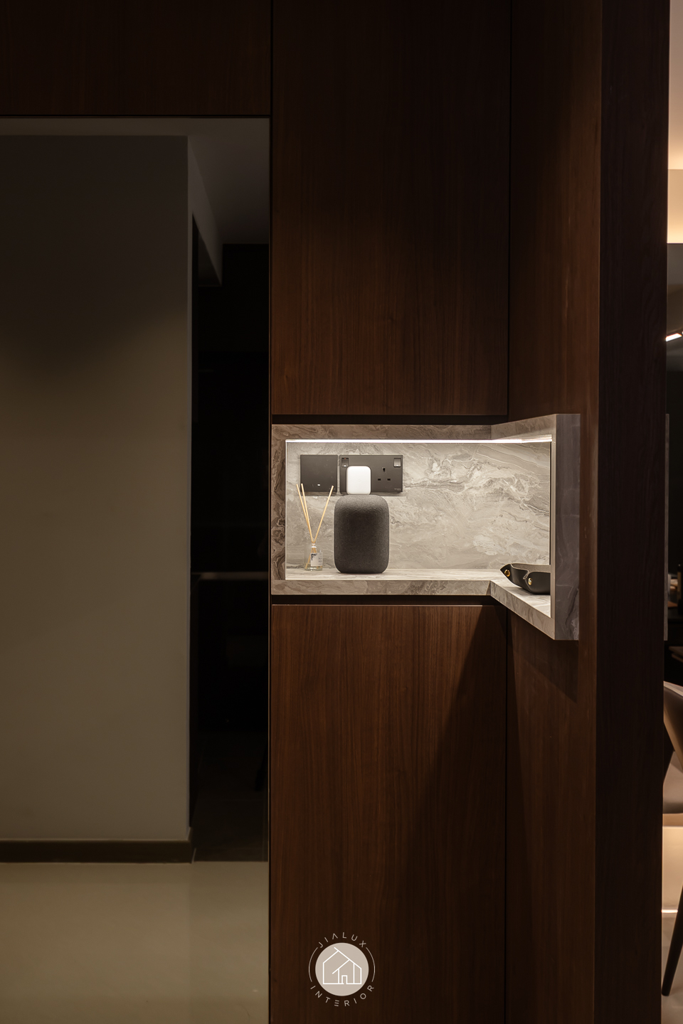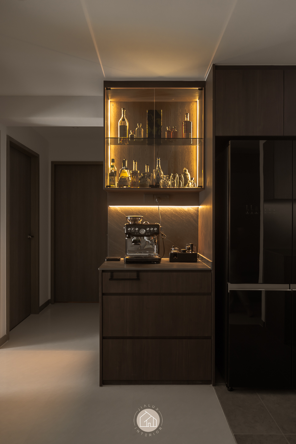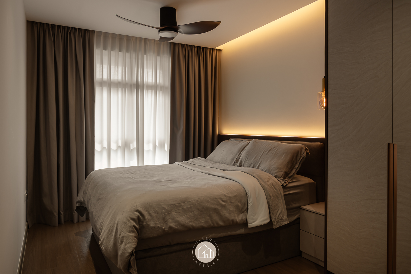 This modern contemporary home does not try to impress loudly. It earns attention through restraint, proportion, and detail. The palette is intentionally composed, where warm walnut tones are grounded by charcoal accents, and softened with clean, light walls that keep the overall mood calm and elevated. Across the main living zones, architectural lines stay crisp and purposeful. A stone feature wall frames the TV with quiet confidence, while layered lighting, including cove illumination and warm downlights, adds depth without visual clutter. In the dining area, the reflective backdrop amplifies space and glow, turning everyday meals into a more considered experience. A distinctive curved glass enclosure introduces a modern “room within a room” concept, creating a focused work zone that still feels connected to the home. Overall, the design prioritises clarity, storage, and comfort, delivered with a polished, understated finish.