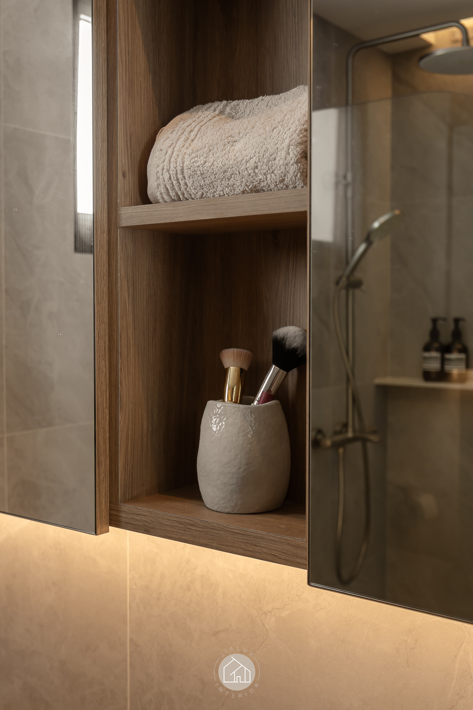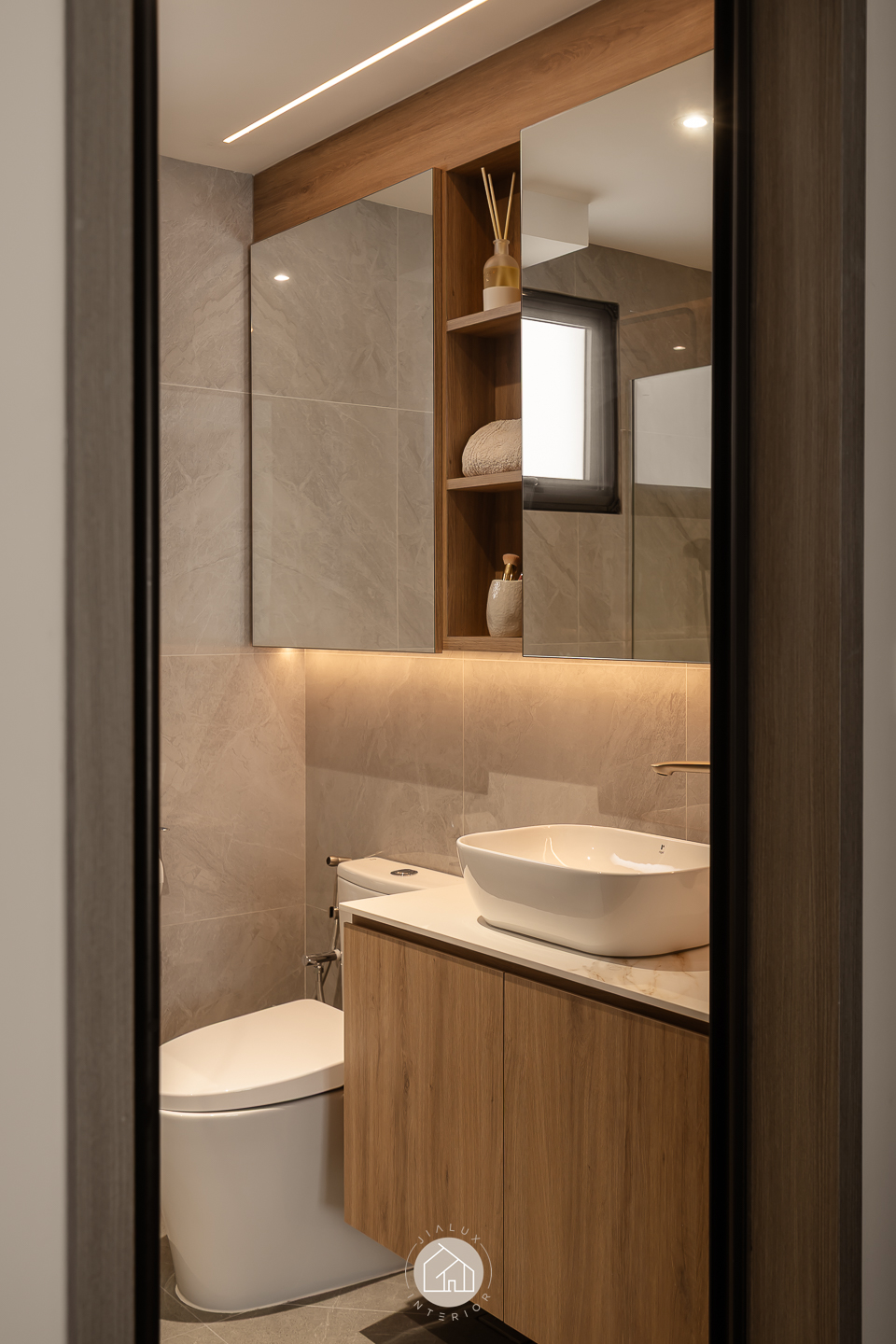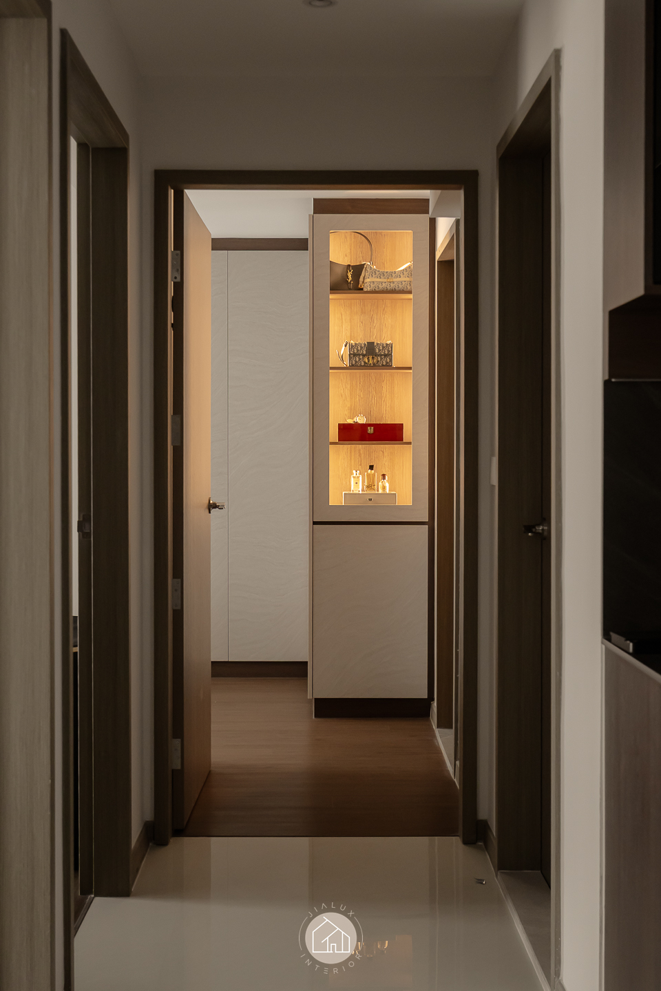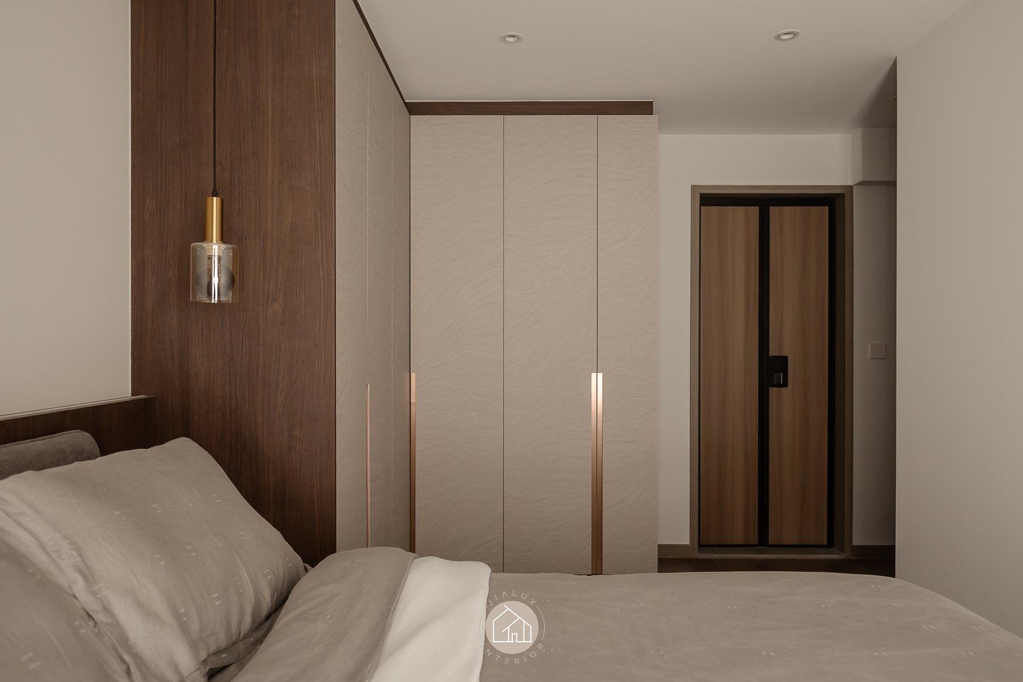 This modern contemporary home does not try to impress loudly. It earns attention through restraint, proportion, and detail. The palette is intentionally composed, where warm walnut tones are grounded by charcoal accents, and softened with clean, light walls that keep the overall mood calm and elevated. Across the main living zones, architectural lines stay crisp and purposeful. A stone feature wall frames the TV with quiet confidence, while layered lighting, including cove illumination and warm downlights, adds depth without visual clutter. In the dining area, the reflective backdrop amplifies space and glow, turning everyday meals into a more considered experience. A distinctive curved glass enclosure introduces a modern “room within a room” concept, creating a focused work zone that still feels connected to the home. Overall, the design prioritises clarity, storage, and comfort, delivered with a polished, understated finish.