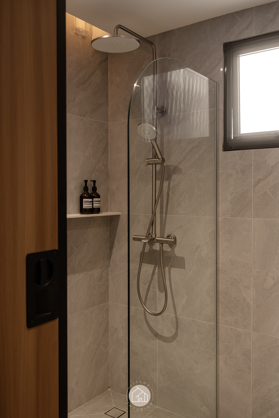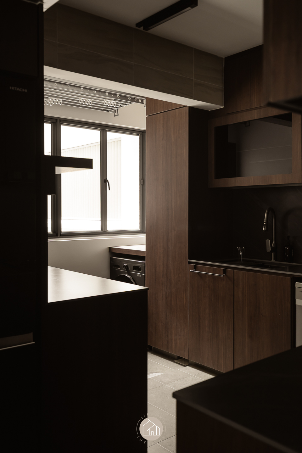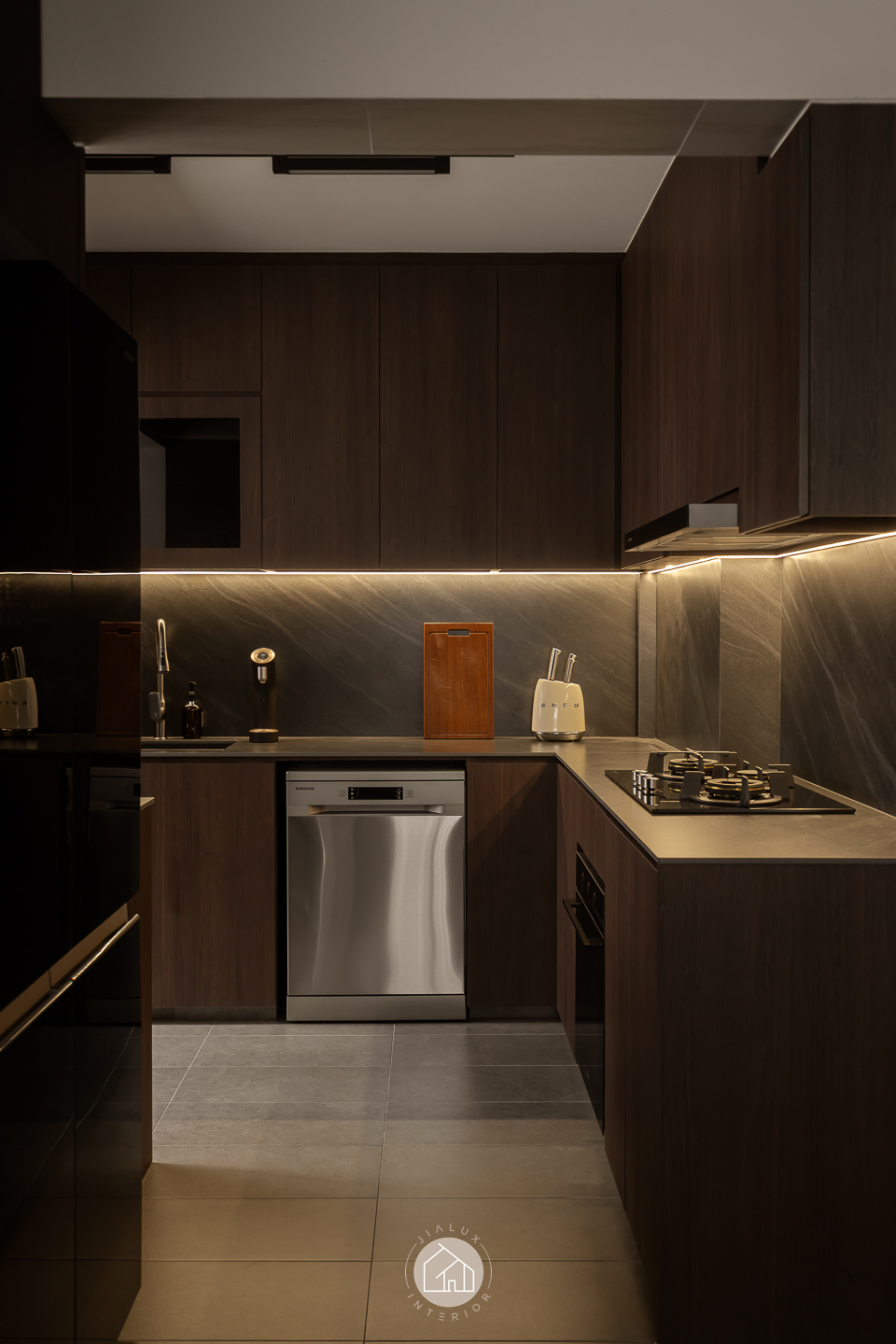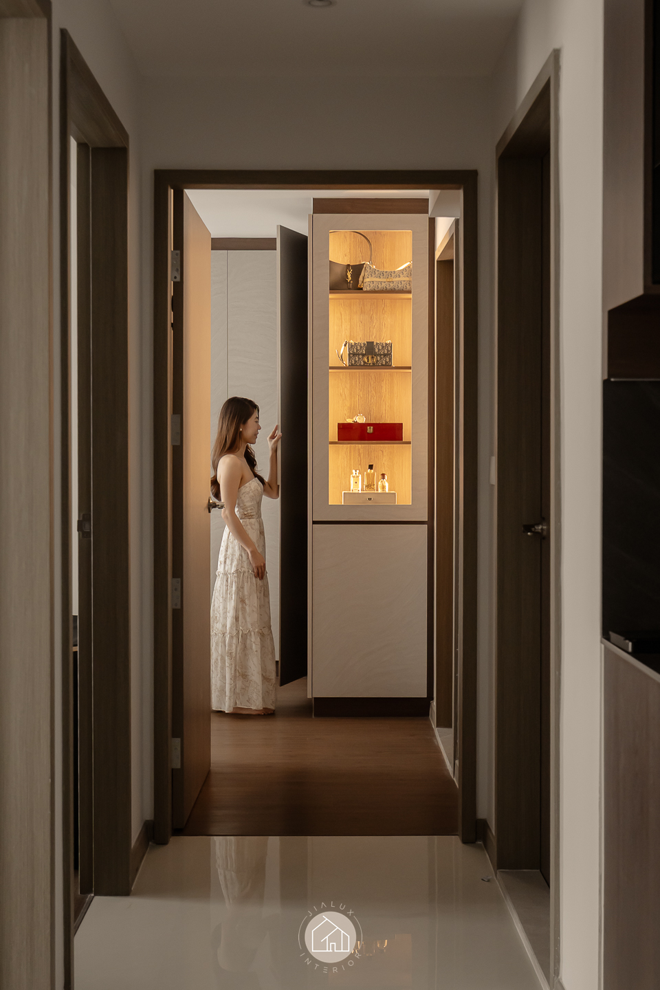 This modern contemporary home does not try to impress loudly. It earns attention through restraint, proportion, and detail. The palette is intentionally composed, where warm walnut tones are grounded by charcoal accents, and softened with clean, light walls that keep the overall mood calm and elevated. Across the main living zones, architectural lines stay crisp and purposeful. A stone feature wall frames the TV with quiet confidence, while layered lighting, including cove illumination and warm downlights, adds depth without visual clutter. In the dining area, the reflective backdrop amplifies space and glow, turning everyday meals into a more considered experience. A distinctive curved glass enclosure introduces a modern “room within a room” concept, creating a focused work zone that still feels connected to the home. Overall, the design prioritises clarity, storage, and comfort, delivered with a polished, understated finish.