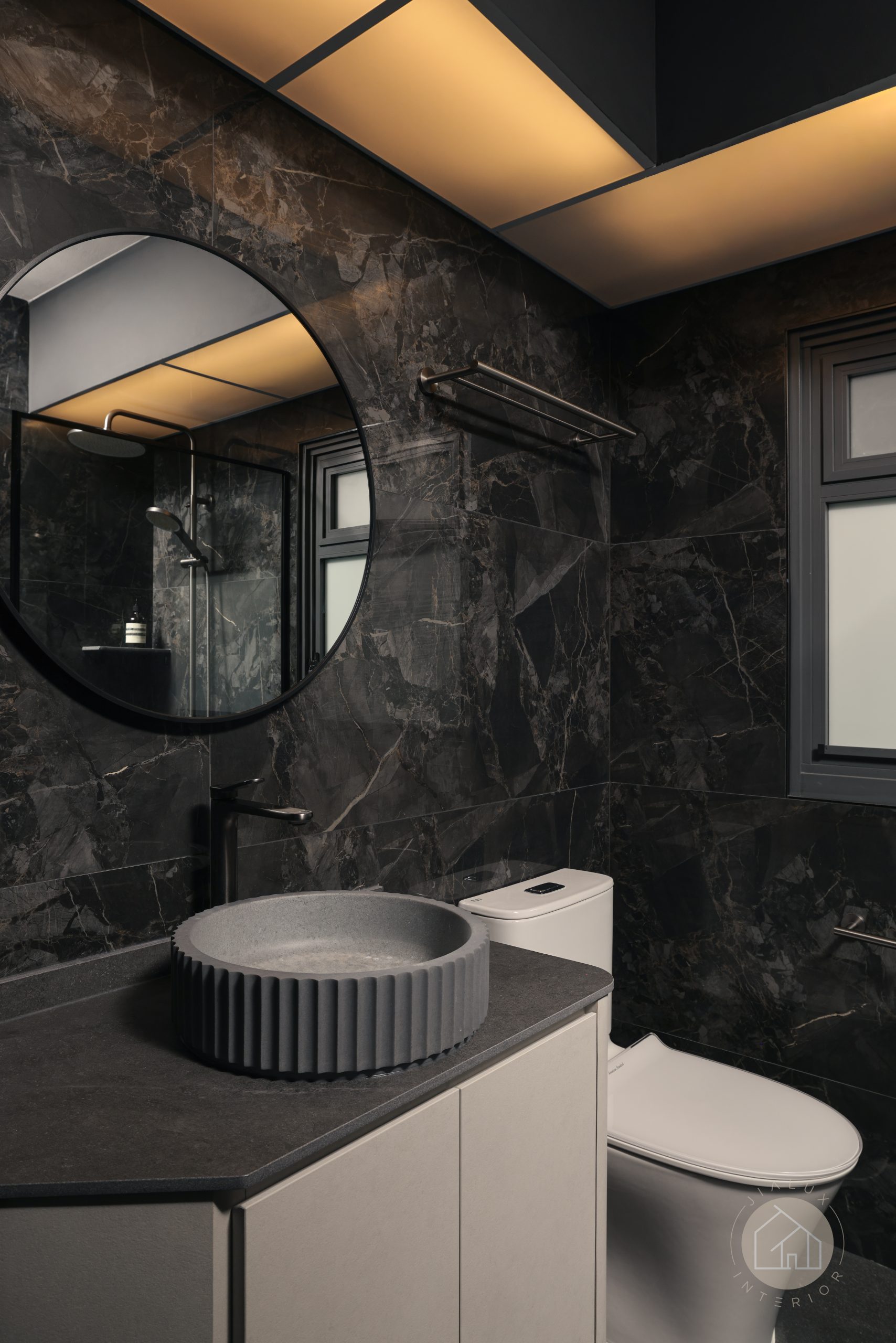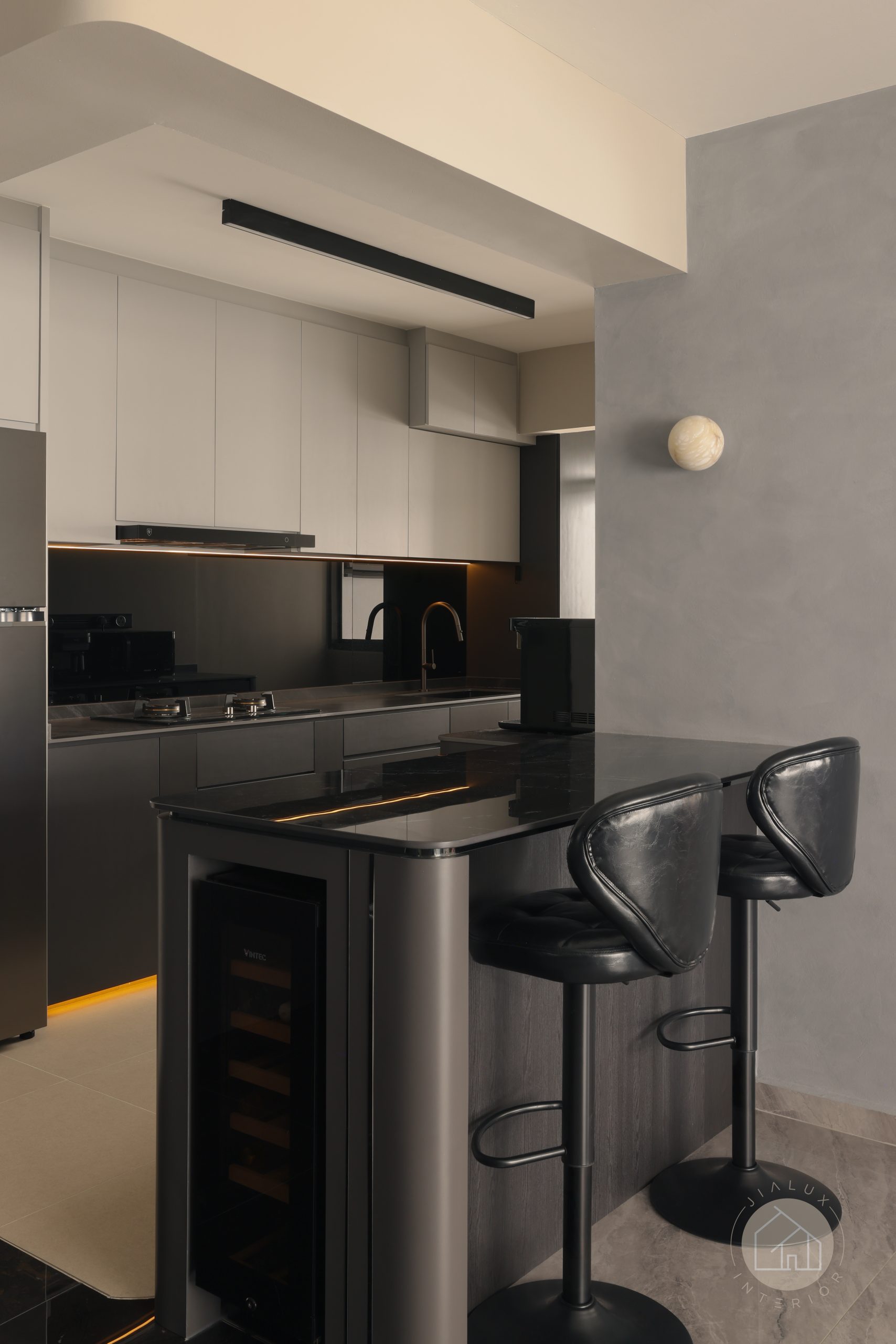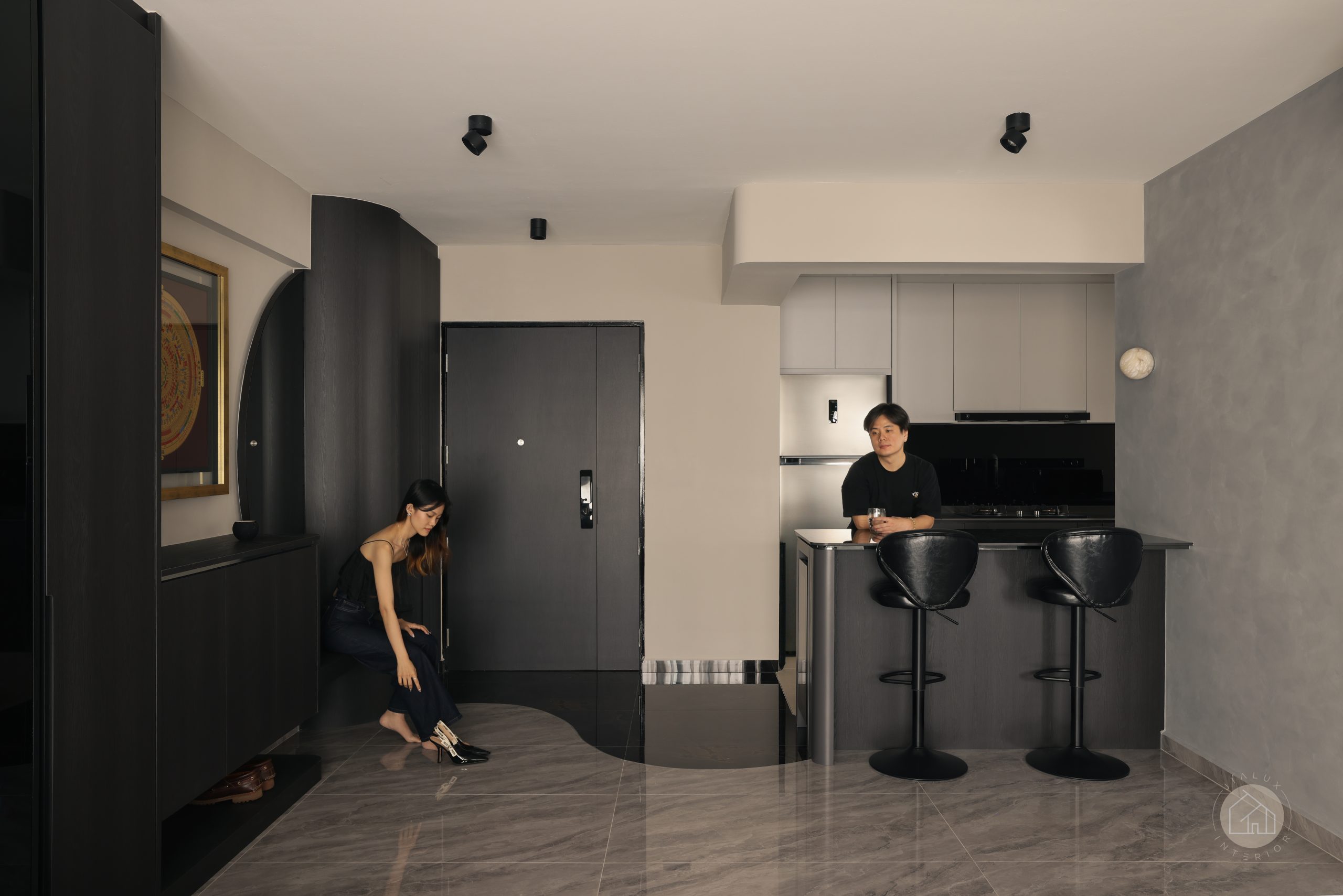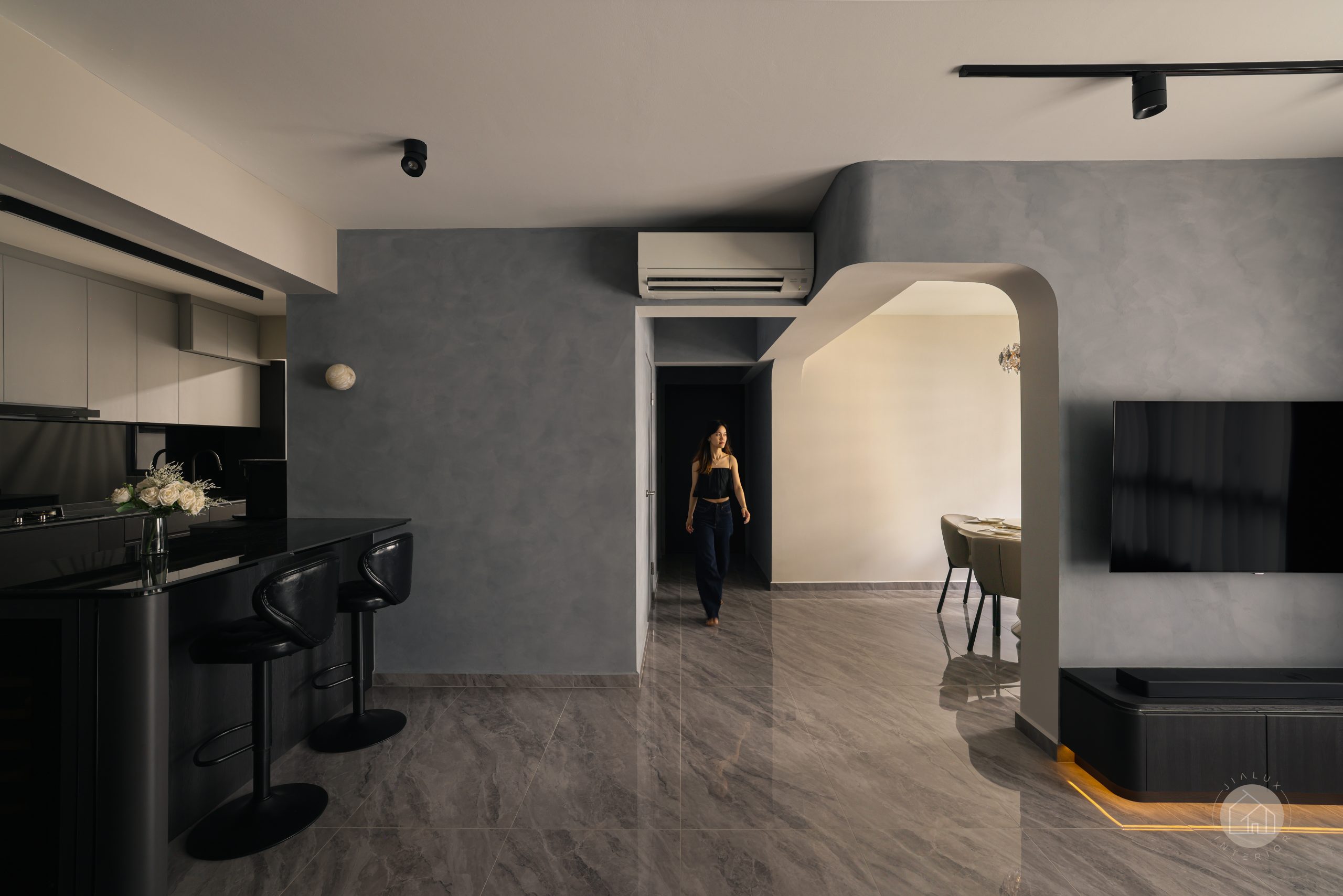 This home brings a dark modern theme to life without letting the space feel heavy or enclosed. Greys and black accents set a sleek foundation, softened with wood and marble-like textures to create a calm, modern sense of luxury.