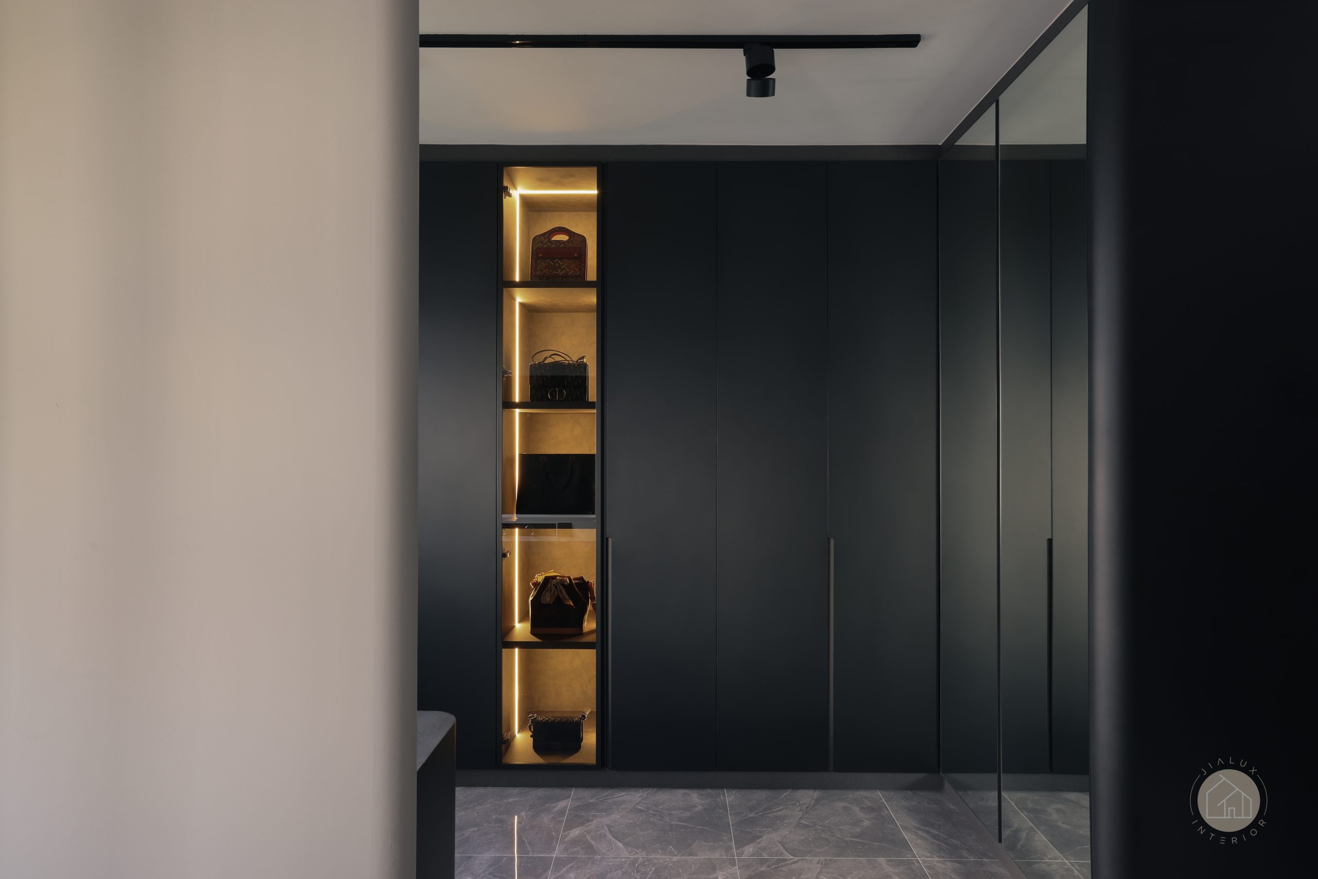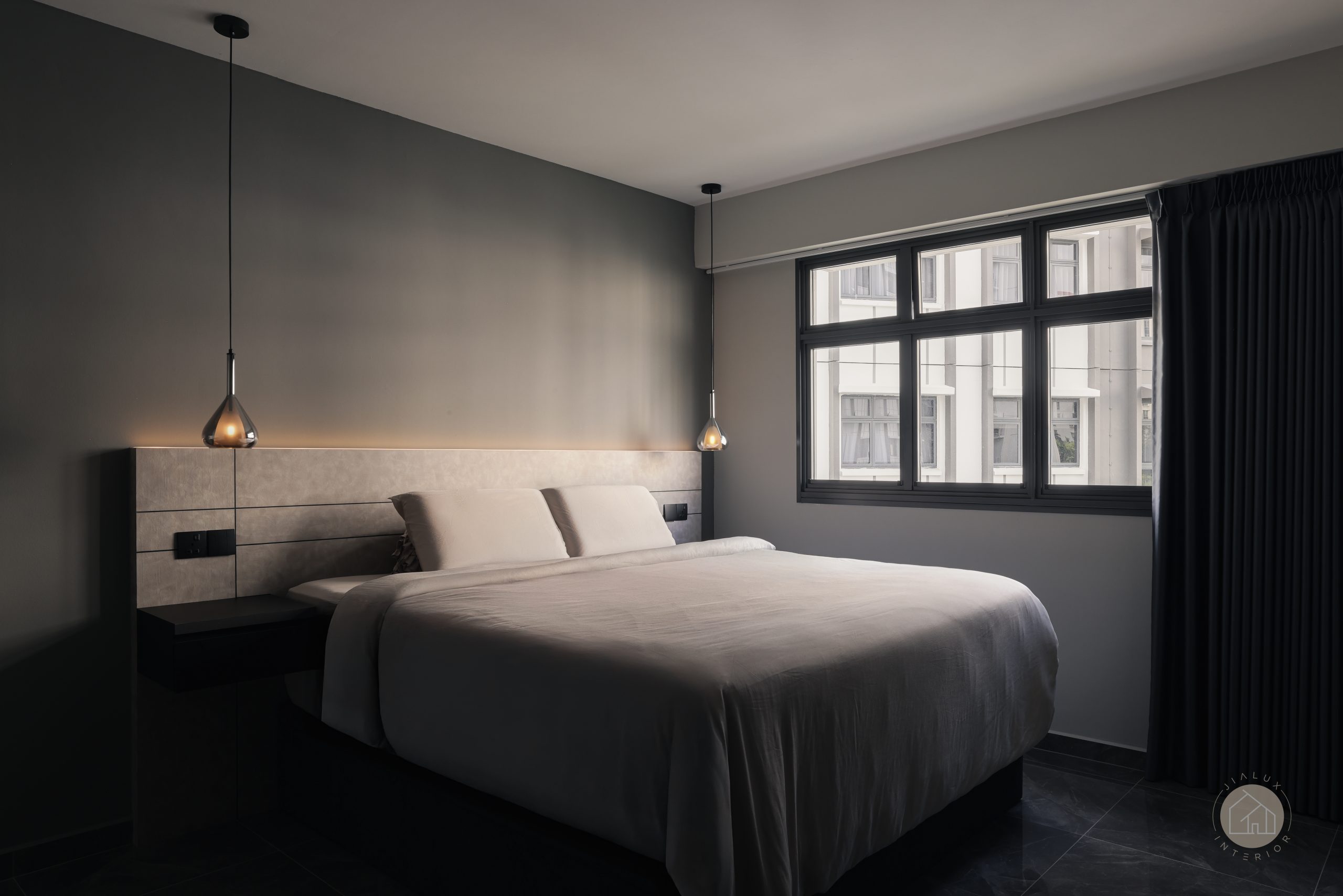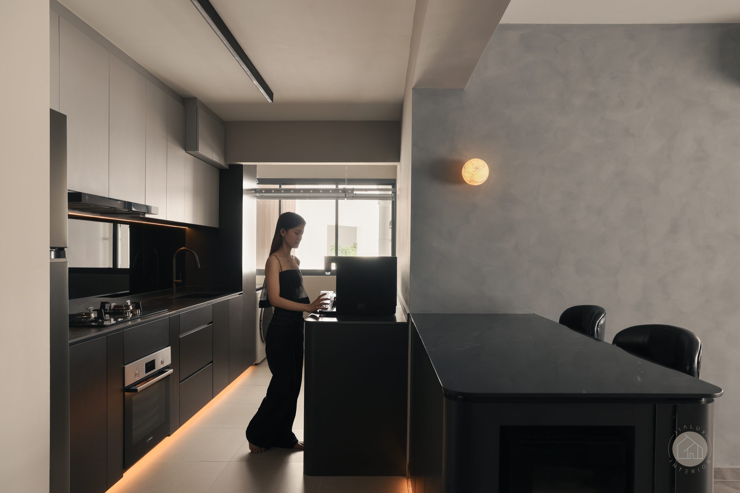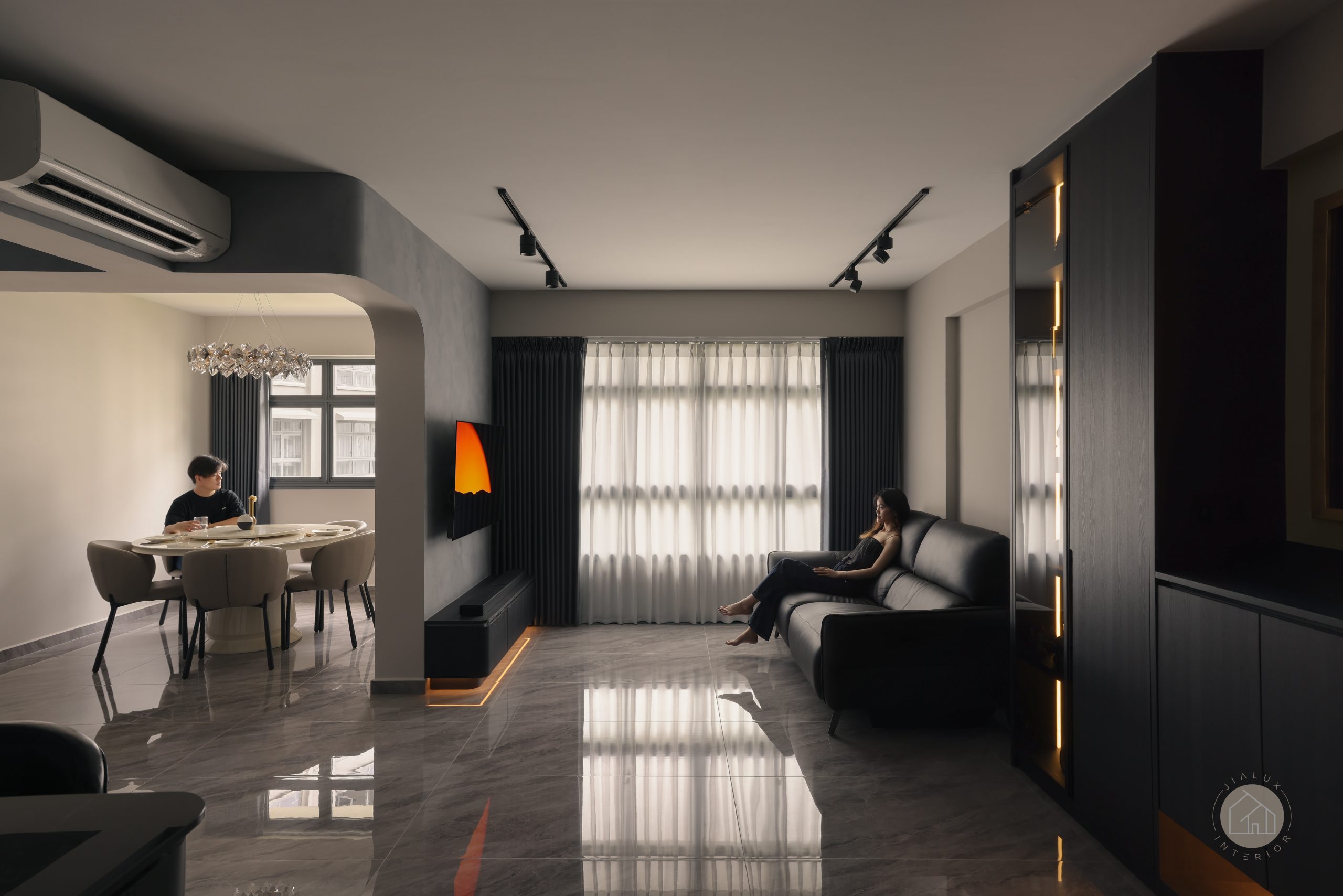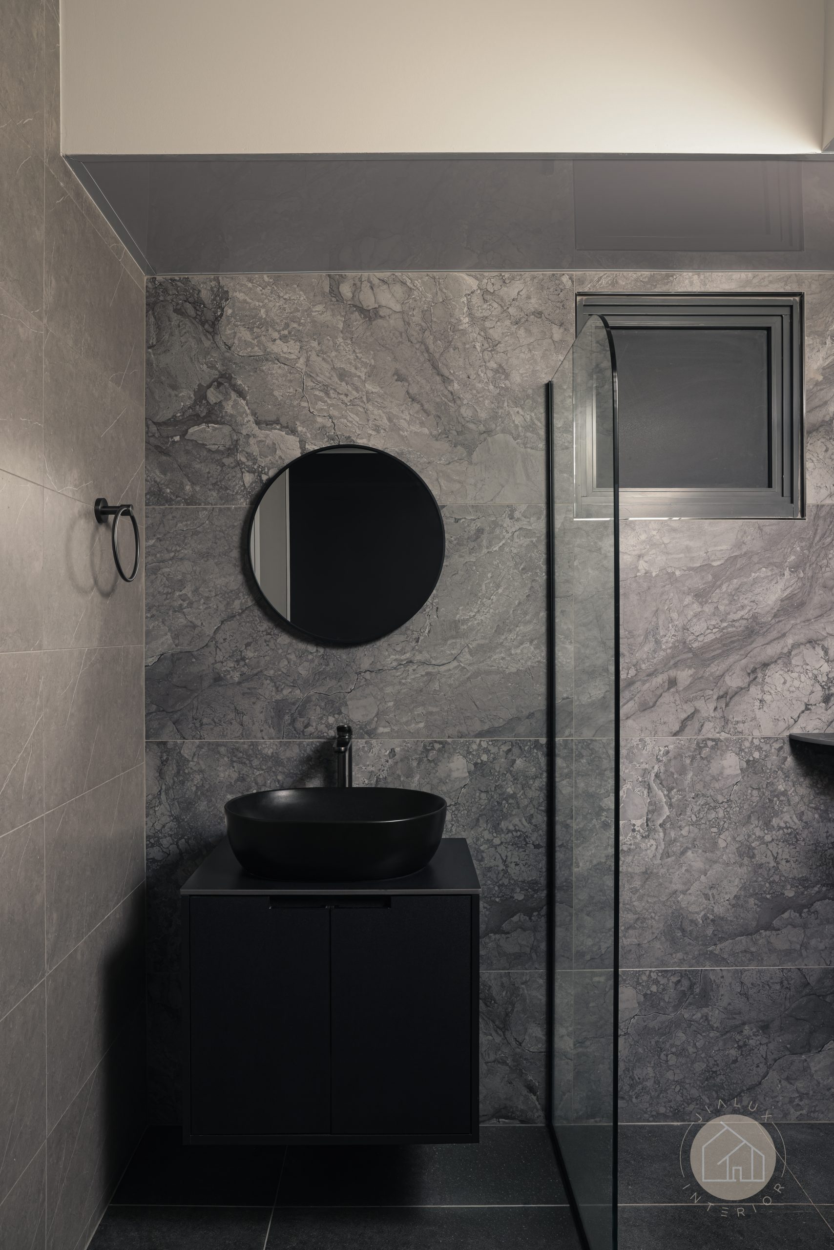 This home brings a dark modern theme to life without letting the space feel heavy or enclosed. Greys and black accents set a sleek foundation, softened with wood and marble-like textures to create a calm, modern sense of luxury.
