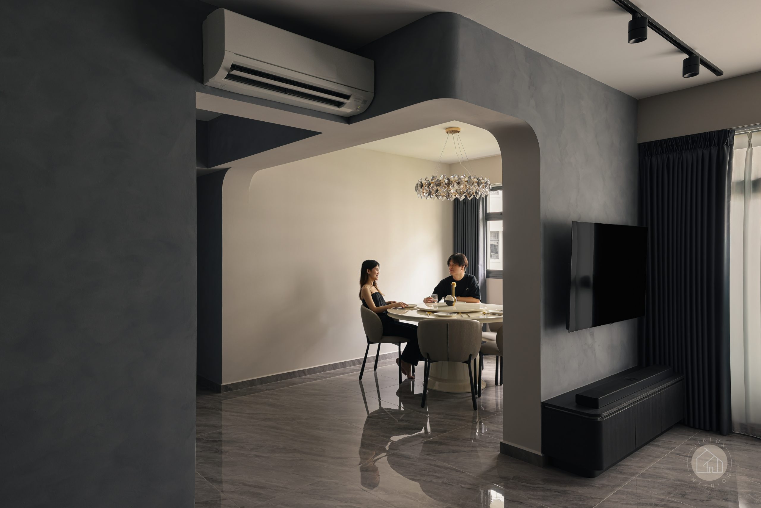 To keep the layout cohesive, the dining area is treated as a natural extension of the living space, finished with limewash texture and a curved opening that echoes the home’s softer forms. Throughout, varied carpentry heights and rounded details deliver ample storage without a boxed-in feel, resulting in a home that is refined, functional, and quietly elevated.
