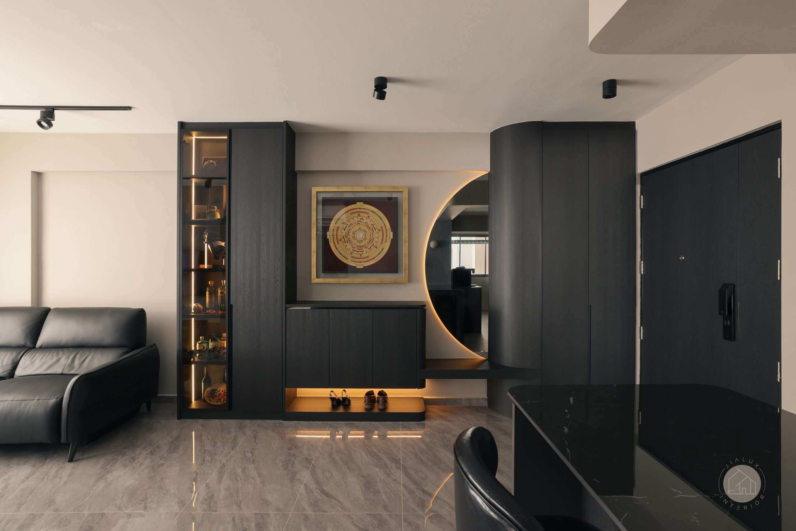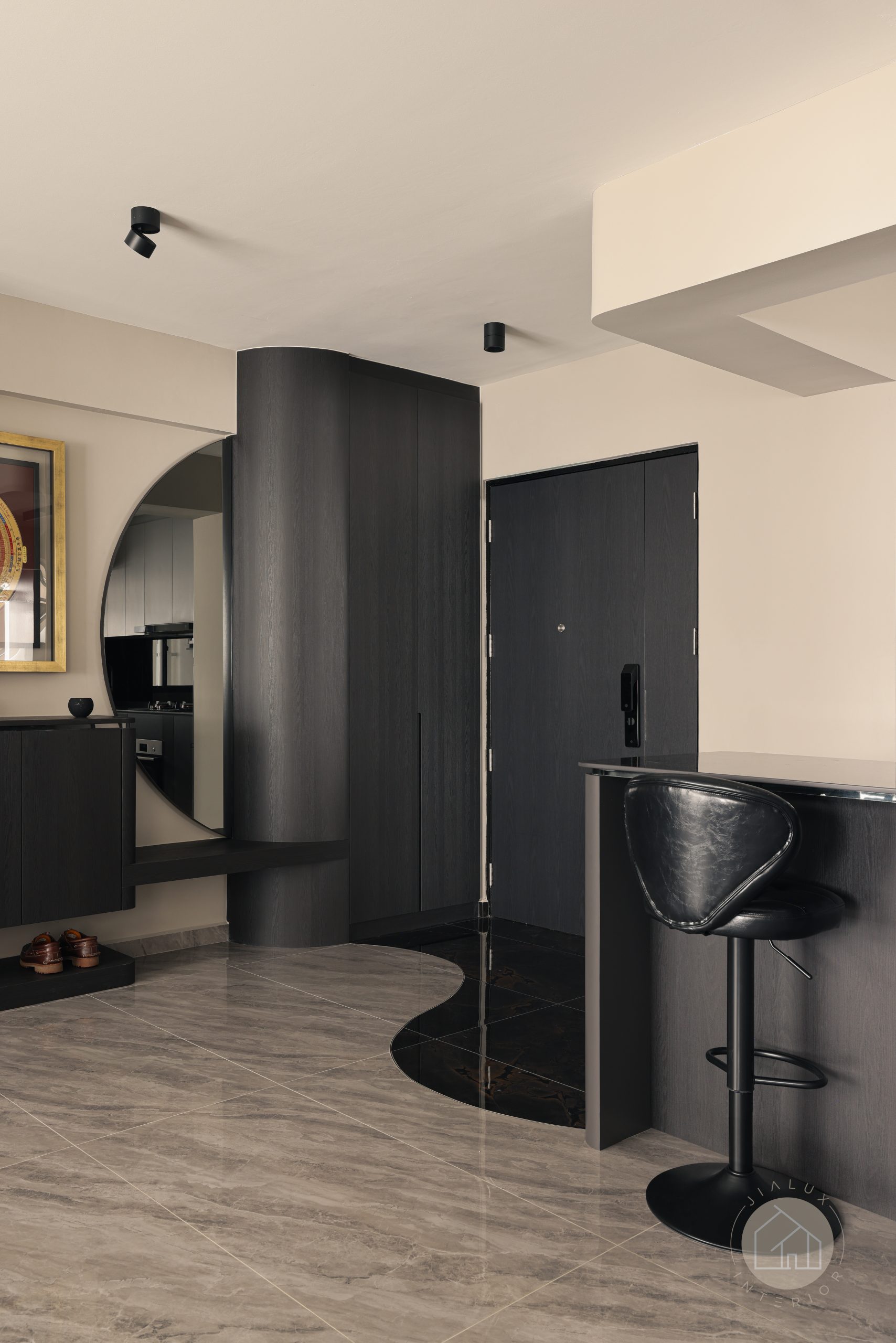 At the entrance, curved elements break away from the usual rigid foyer. A statement curved mirror and a flowing tile transition create a gentler first impression, while contrasting floor finishes clearly zone the foyer from the living area. Large-format tiles keep the look clean and expansive by reducing visual breaks.