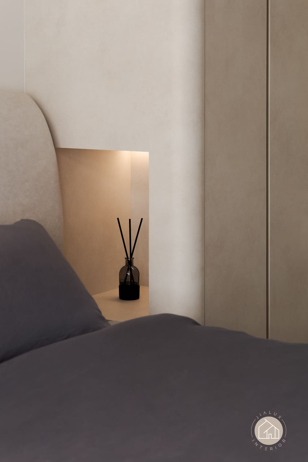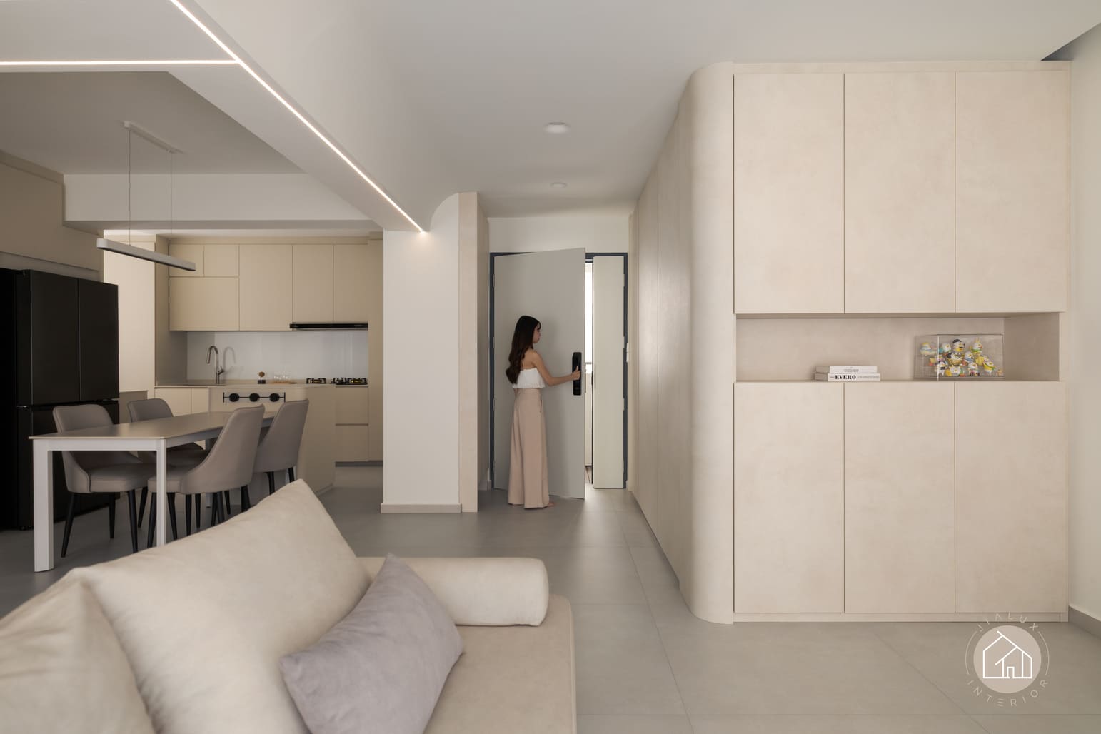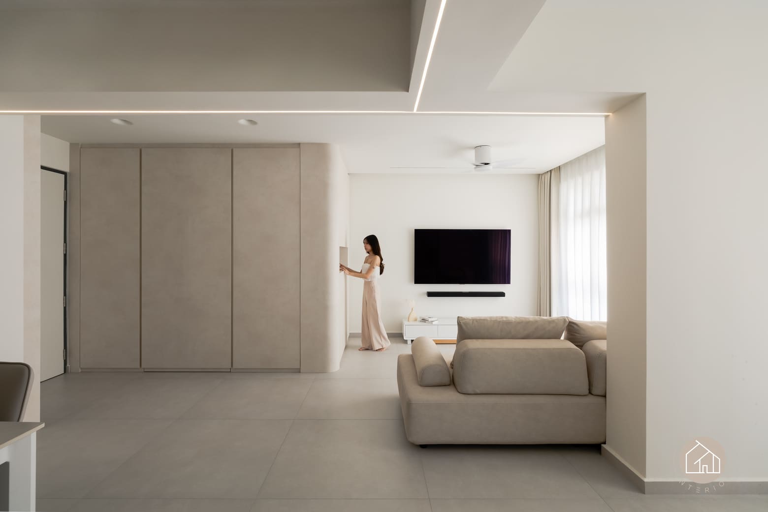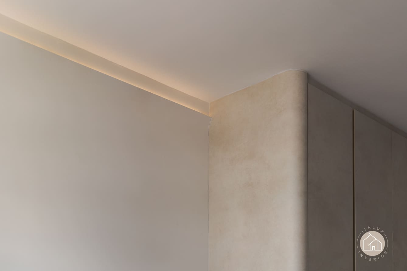 Curved built-ins form the key design language throughout, softening edges, improving circulation, and integrating generous concealed storage to maintain clean sightlines. Lighting is treated as an architectural layer, with linear ceiling details and warm cove illumination adding depth and gentle zoning without visual clutter.