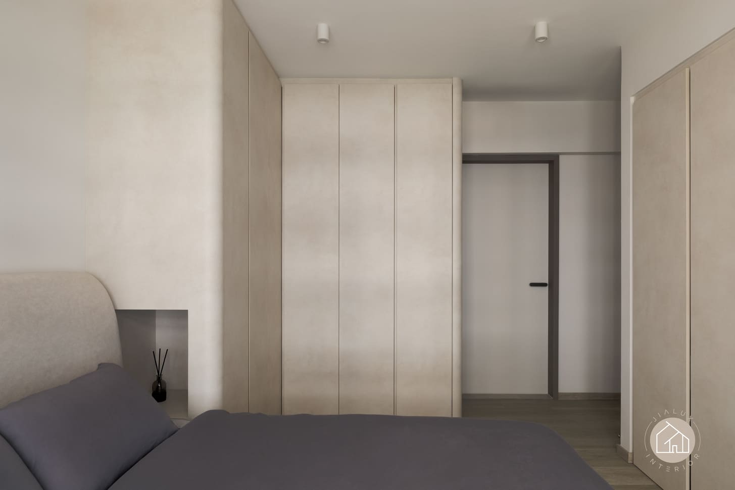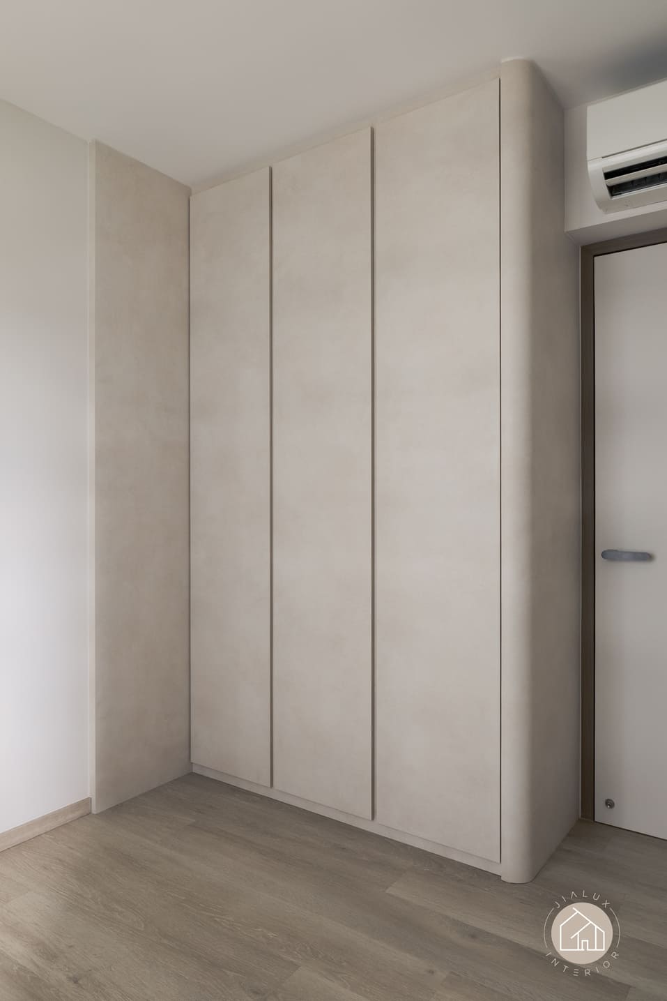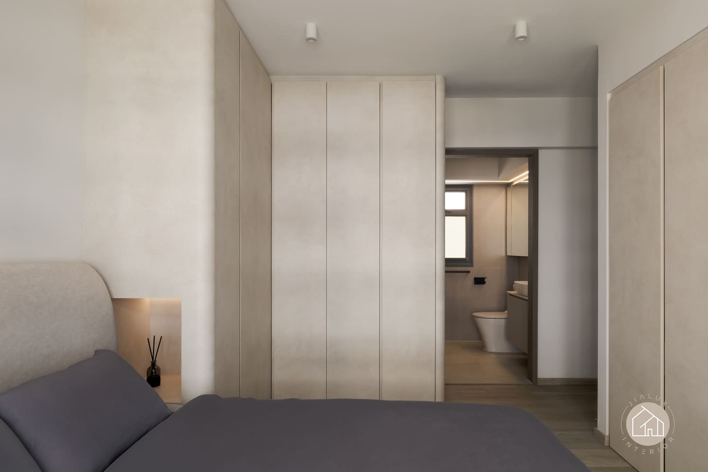 Curved built-ins form the key design language throughout, softening edges, improving circulation, and integrating generous concealed storage to maintain clean sightlines. Lighting is treated as an architectural layer, with linear ceiling details and warm cove illumination adding depth and gentle zoning without visual clutter.