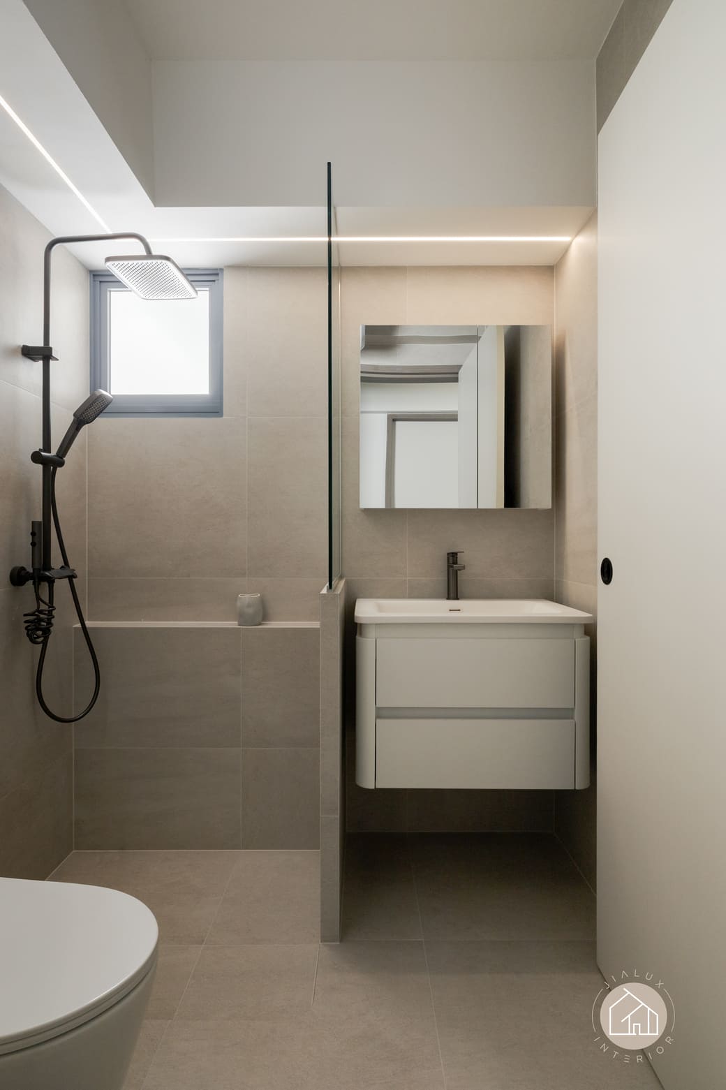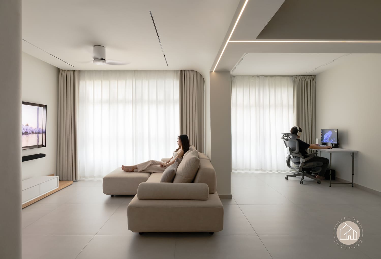 A warm minimal and quietly luxurious concept defines this home, shaped around the homeowners’ preference for visual calm and everyday functionality. A soft neutral palette, large format flooring, and full height curtains maximise natural light and keep the space feeling airy and timeless.