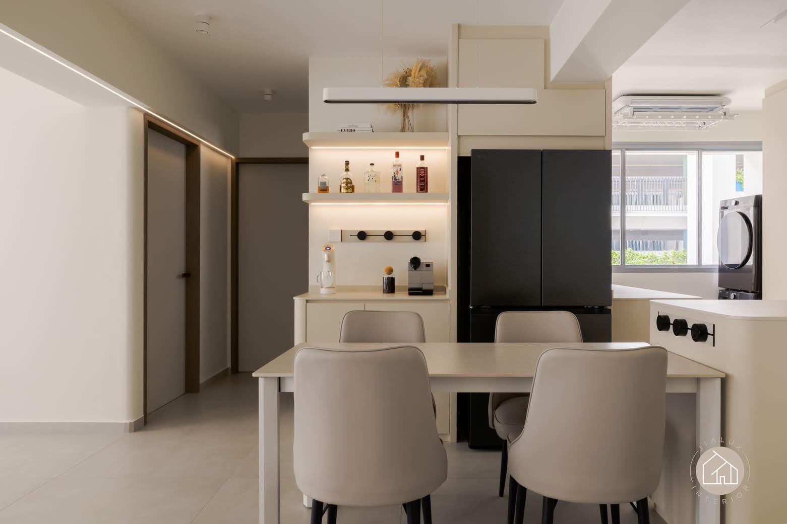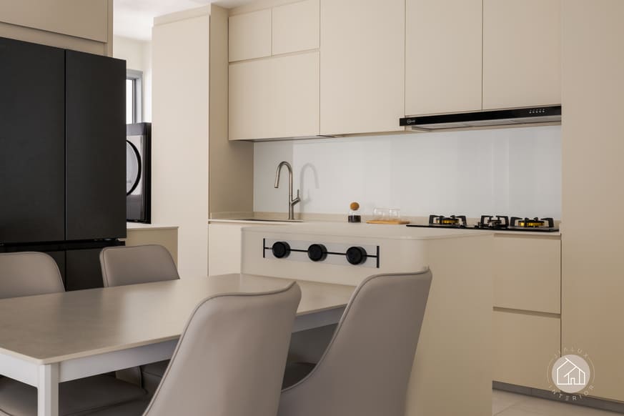 The kitchen and dining area shifts slightly more contemporary, pairing streamlined cabinetry with subtle matte black accents for definition, while a discreet work corner is kept cohesive through consistent tones and flush detailing. Overall, the home is designed to feel effortless, refined, and enduring from day to night.