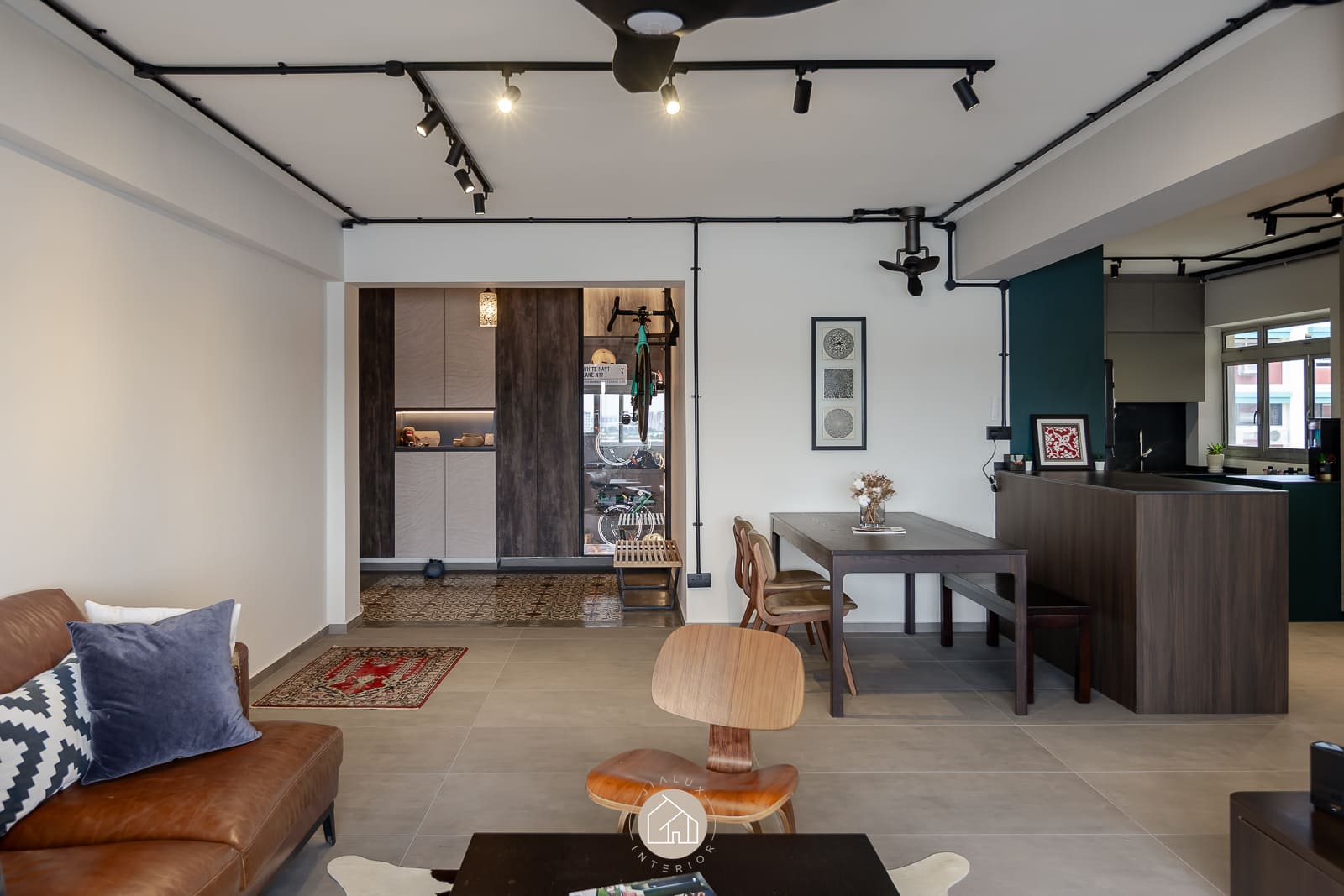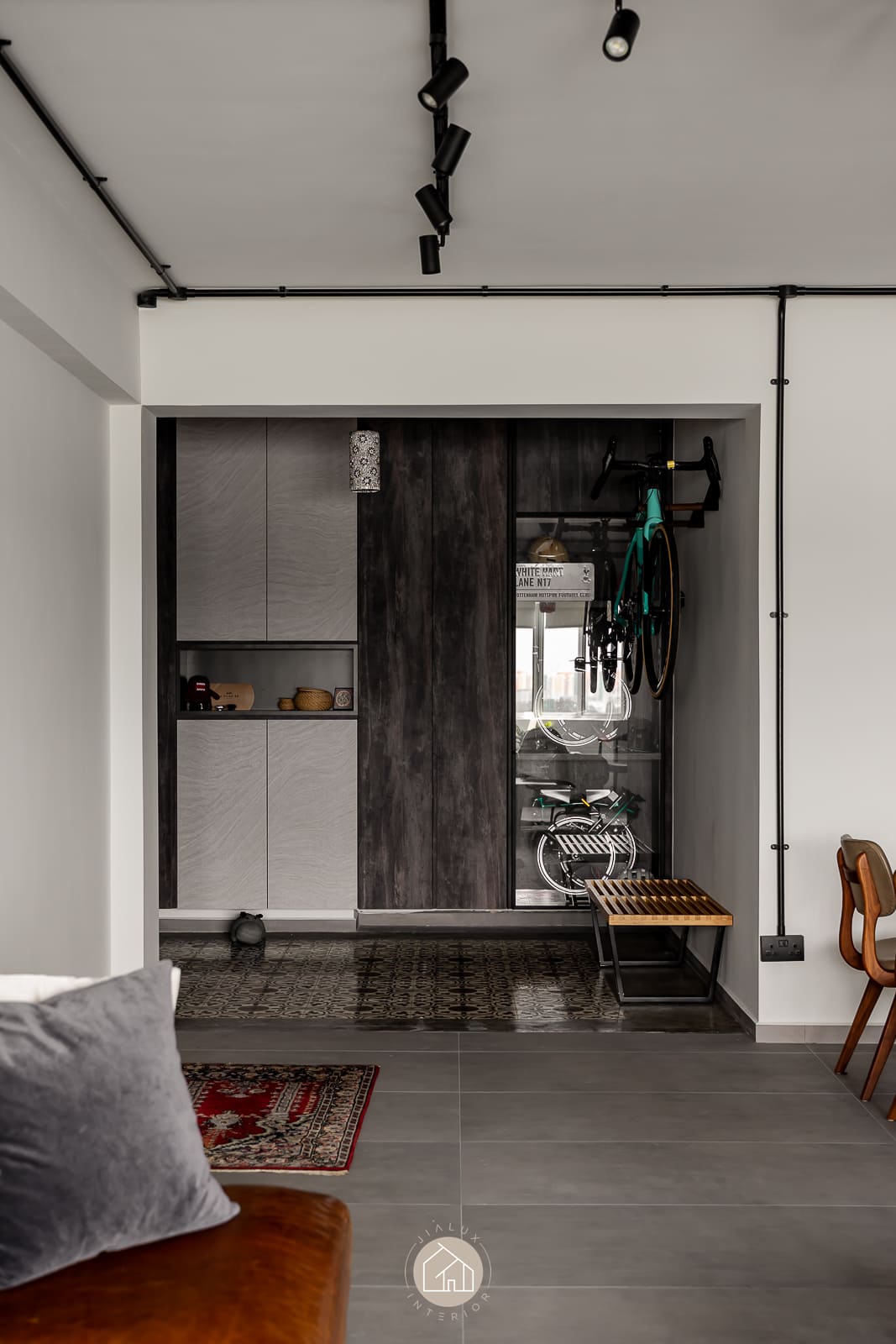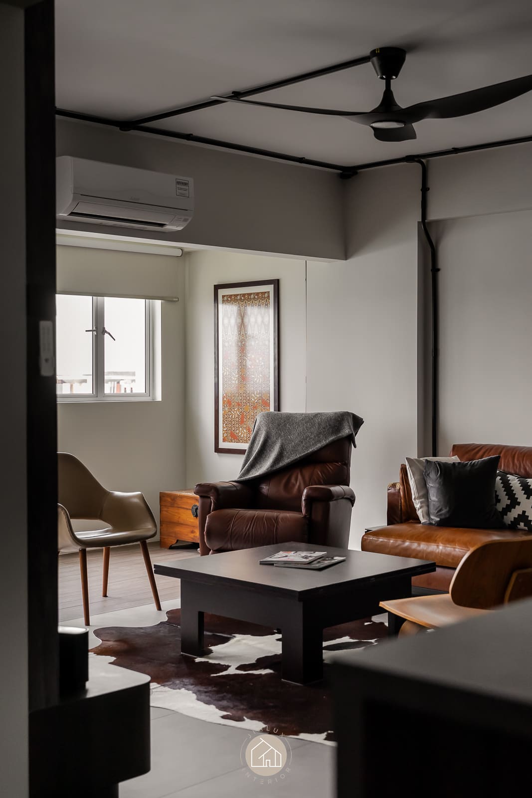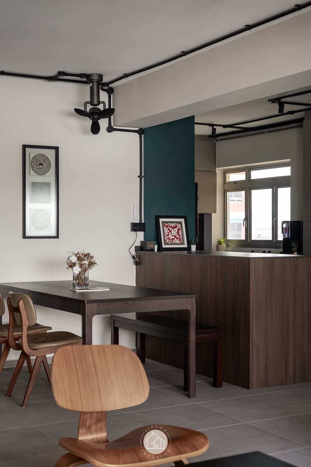A combination of rustic textures and cool tones in the house Shifu creates a modern yet industrial feel theme.