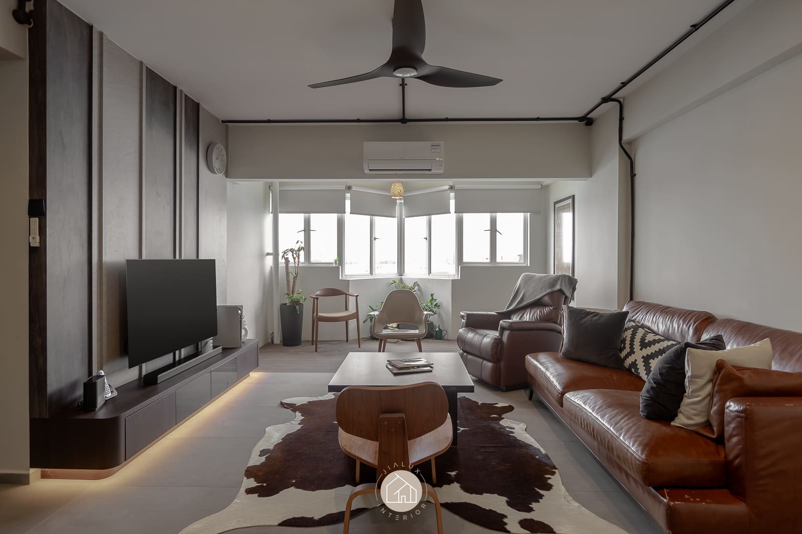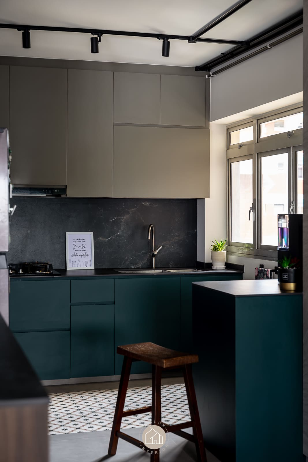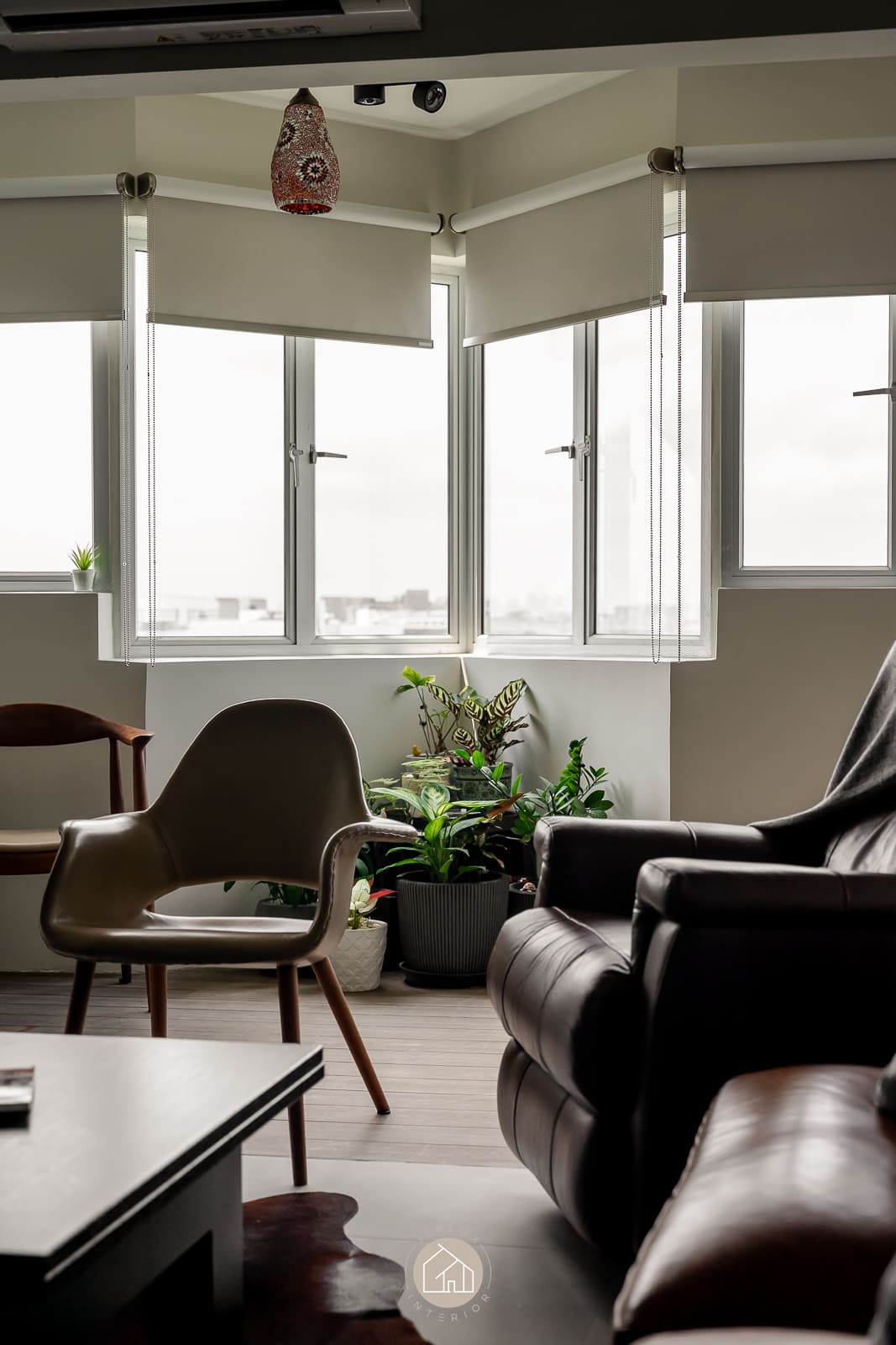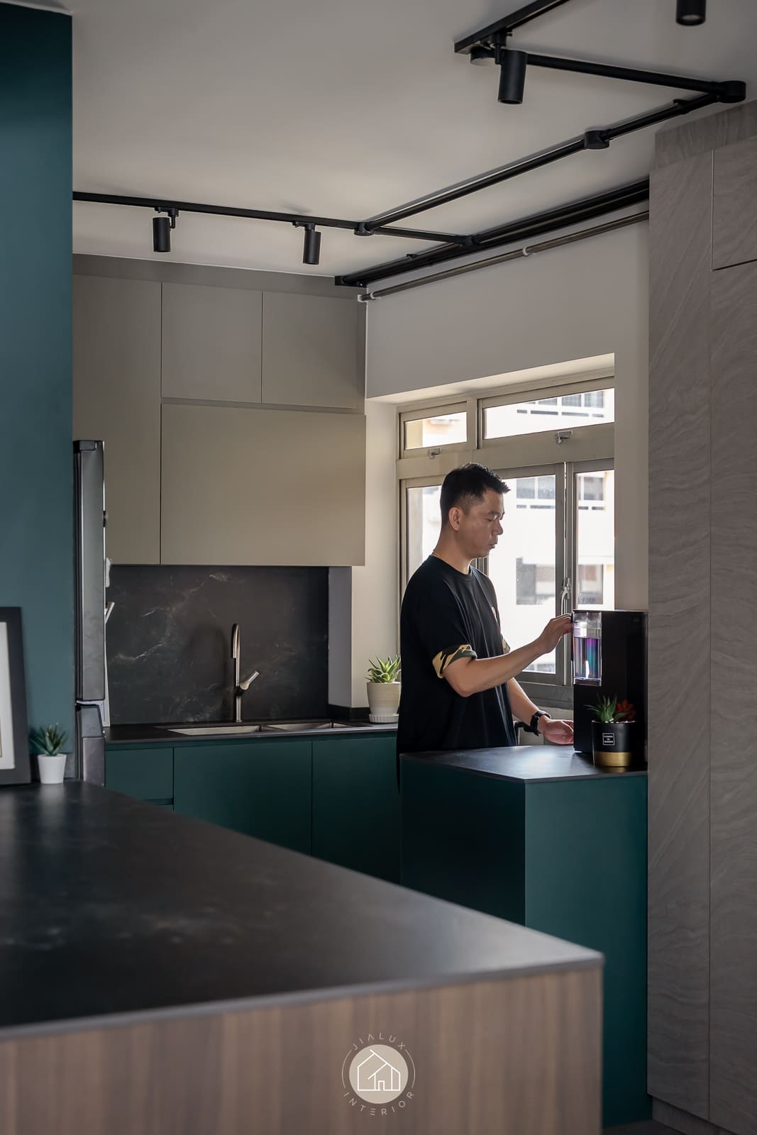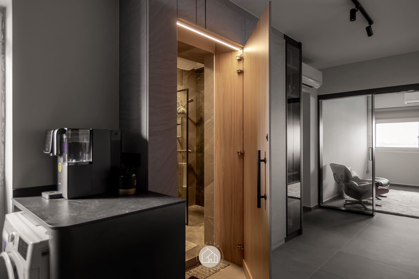 A combination of rustic textures and cool tones in the house Shifu creates a modern yet industrial feel theme.