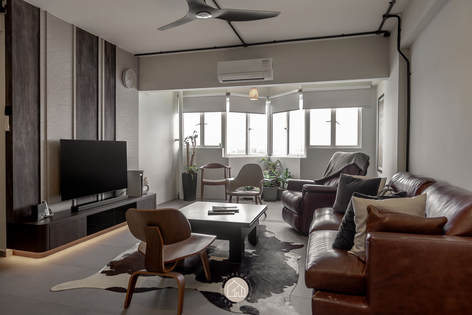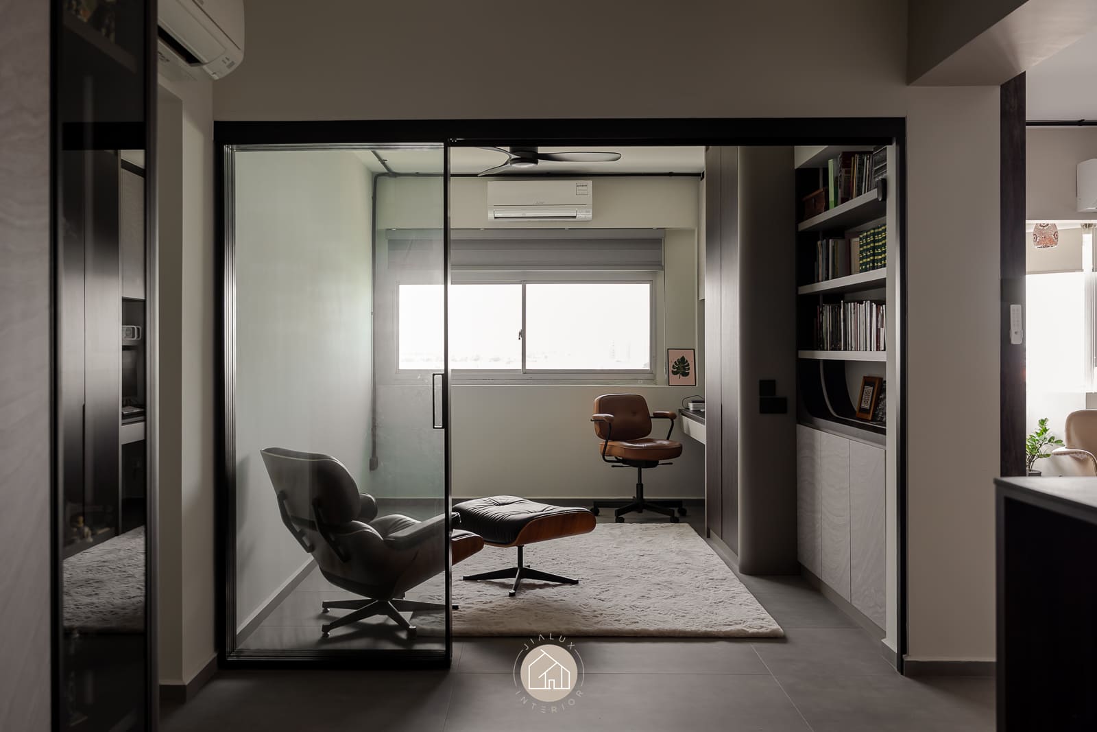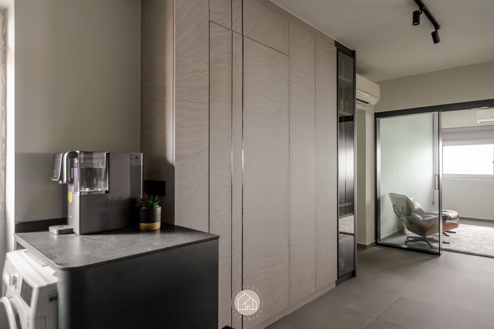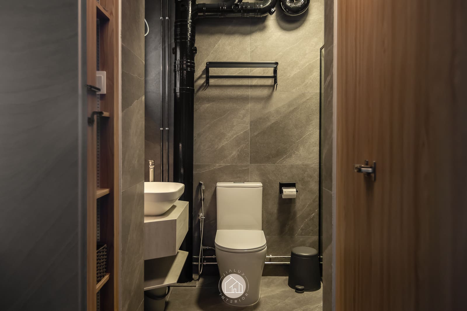 A combination of rustic textures and cool tones in the house Shifu creates a modern yet industrial feel theme.