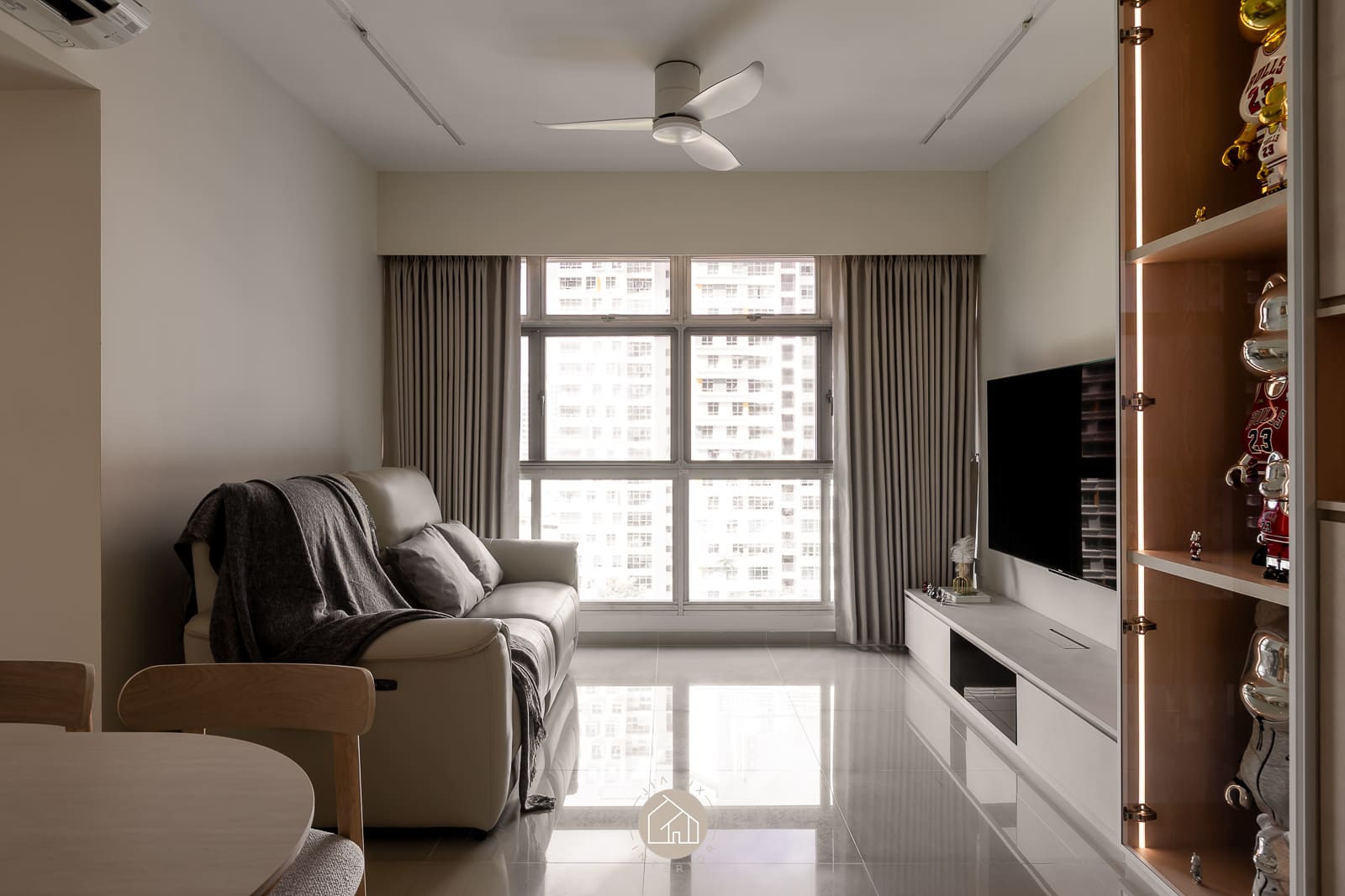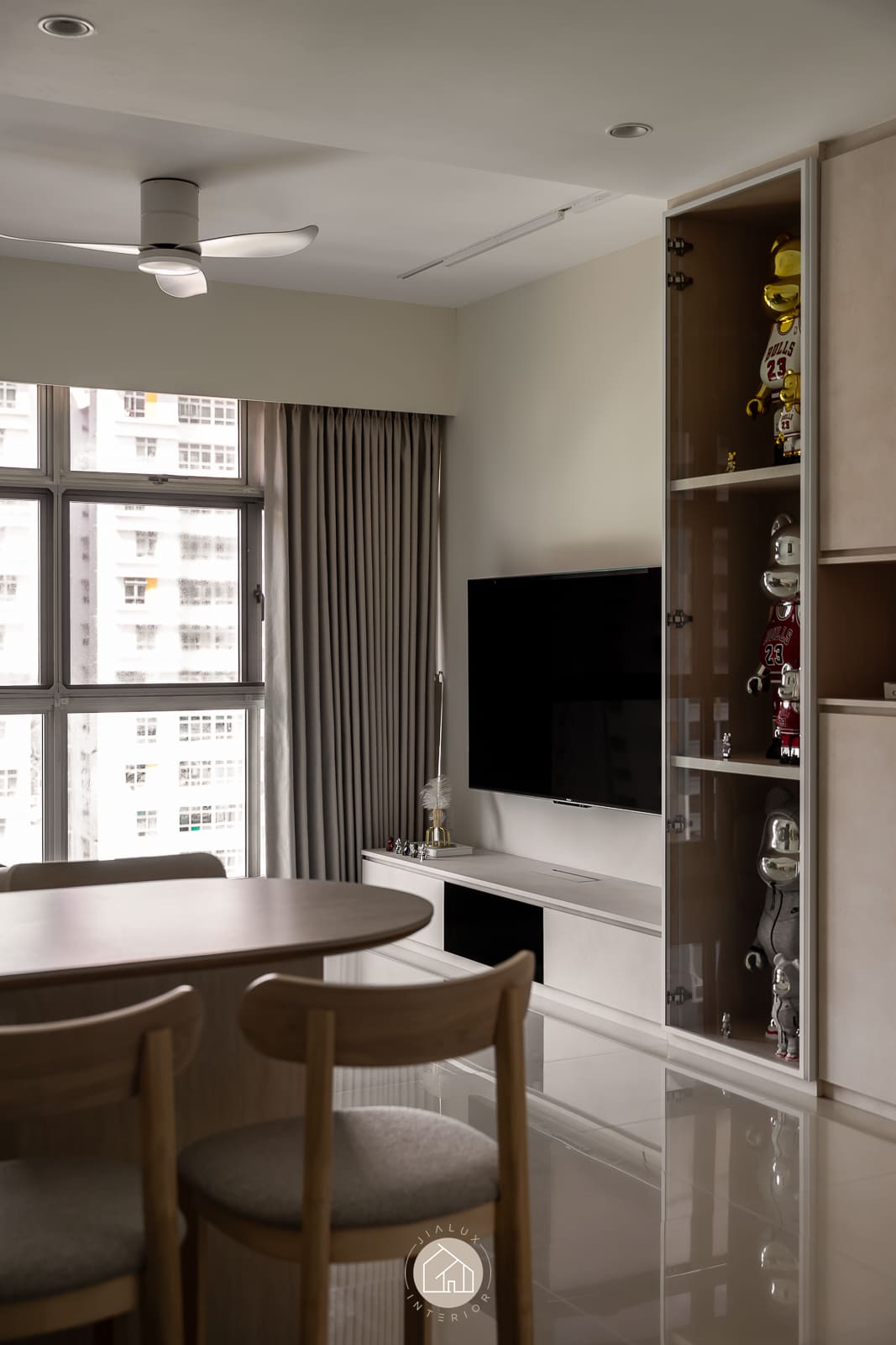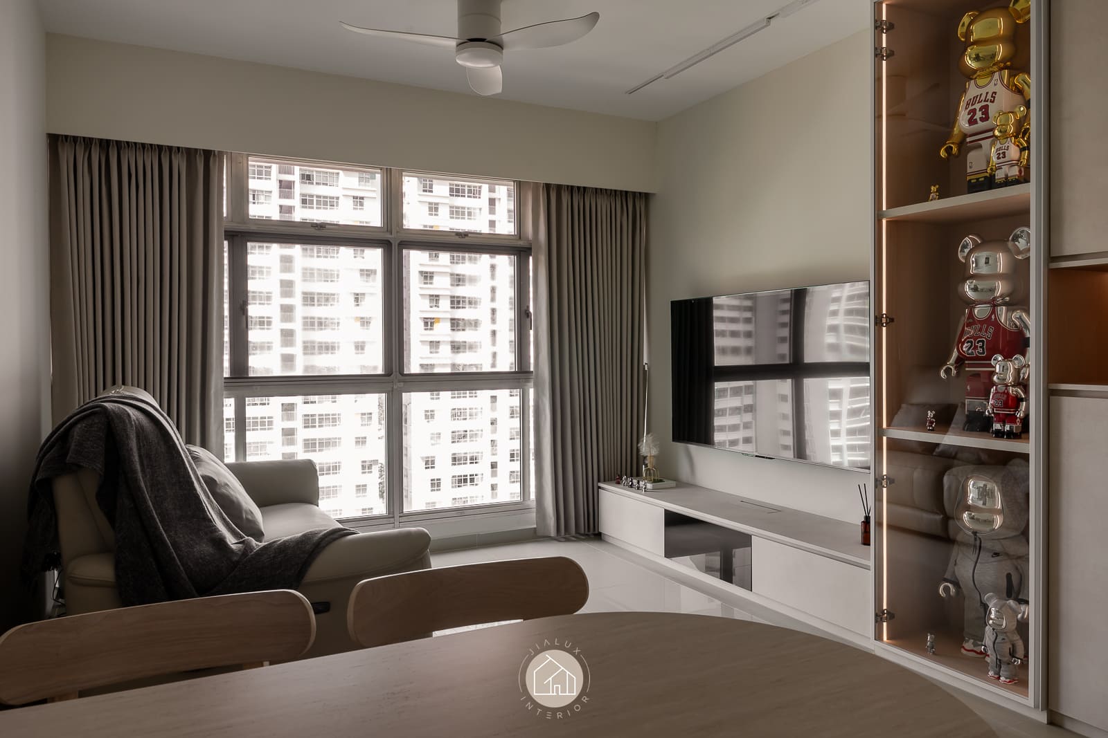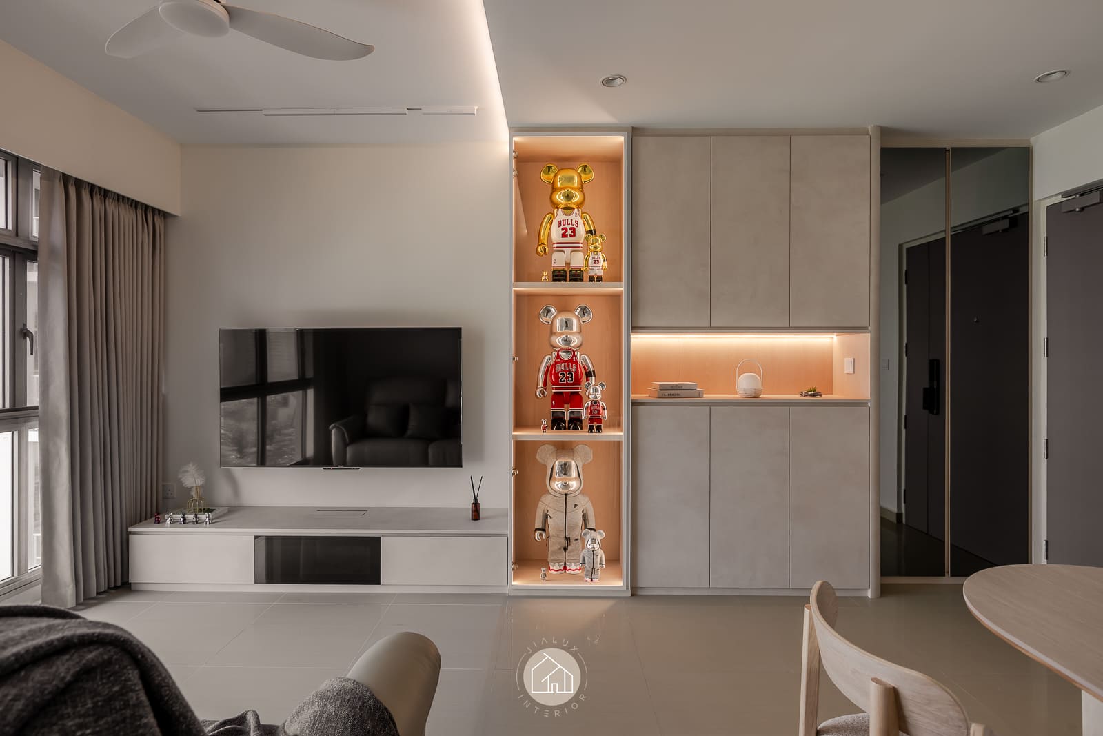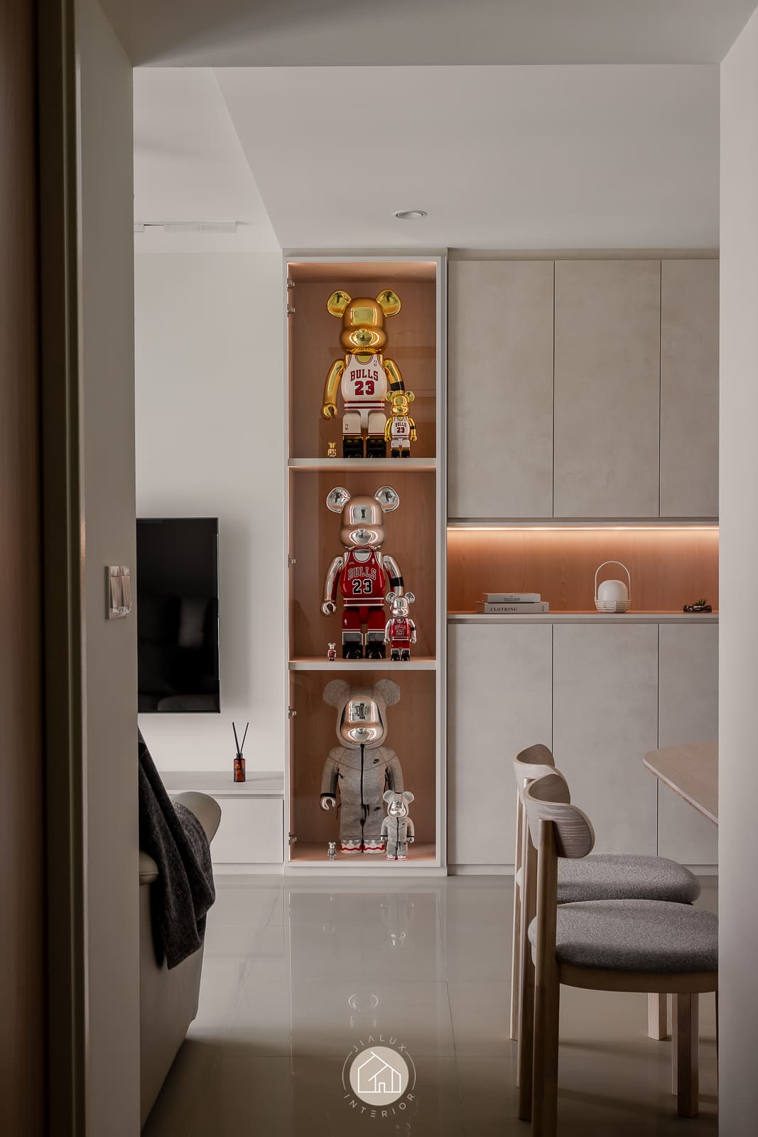 A modern minimalist residence articulated with a softer, more curated sensibility. The living zone is anchored by disciplined carpentry: a low-profile media console and a full-height storage wall that balances closed volumes with a recessed display vitrine. Warm, concealed lighting adds depth and quietly spotlights the owners’ collectibles, introducing character while preserving a clean visual line.
