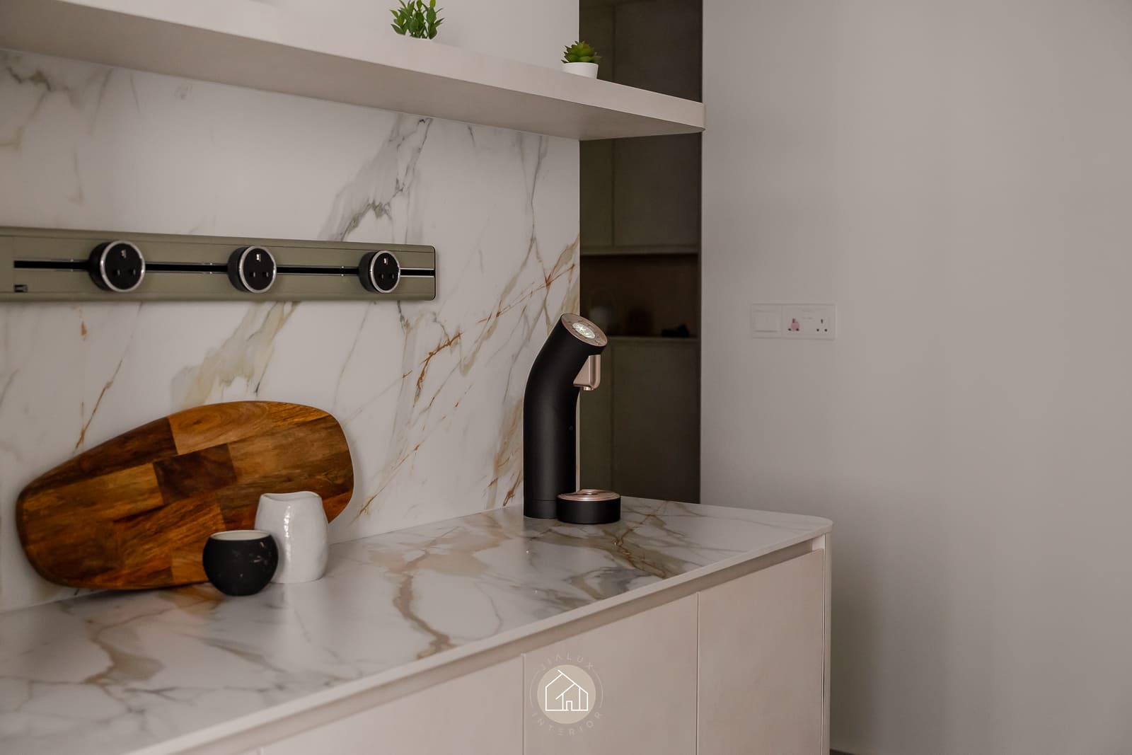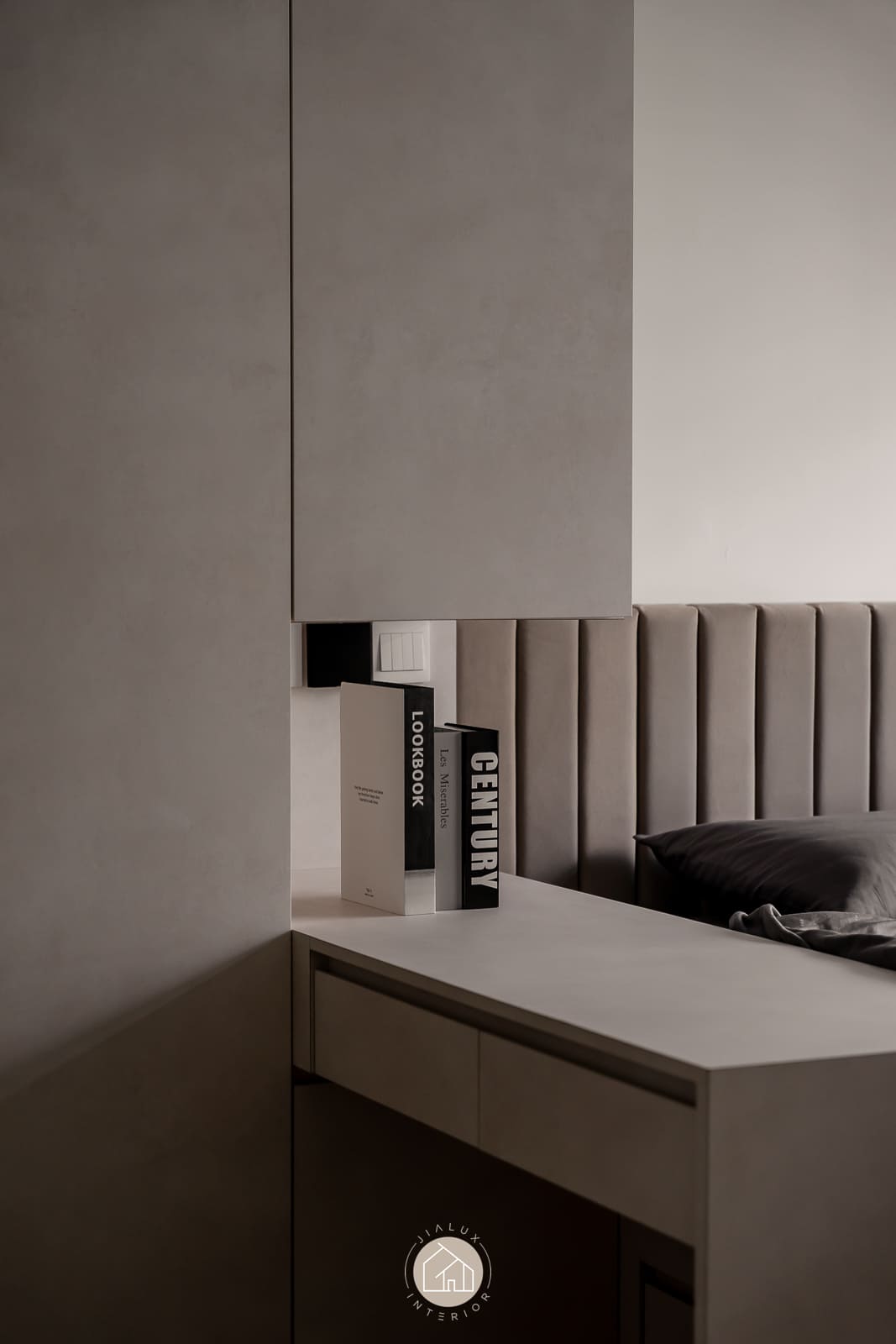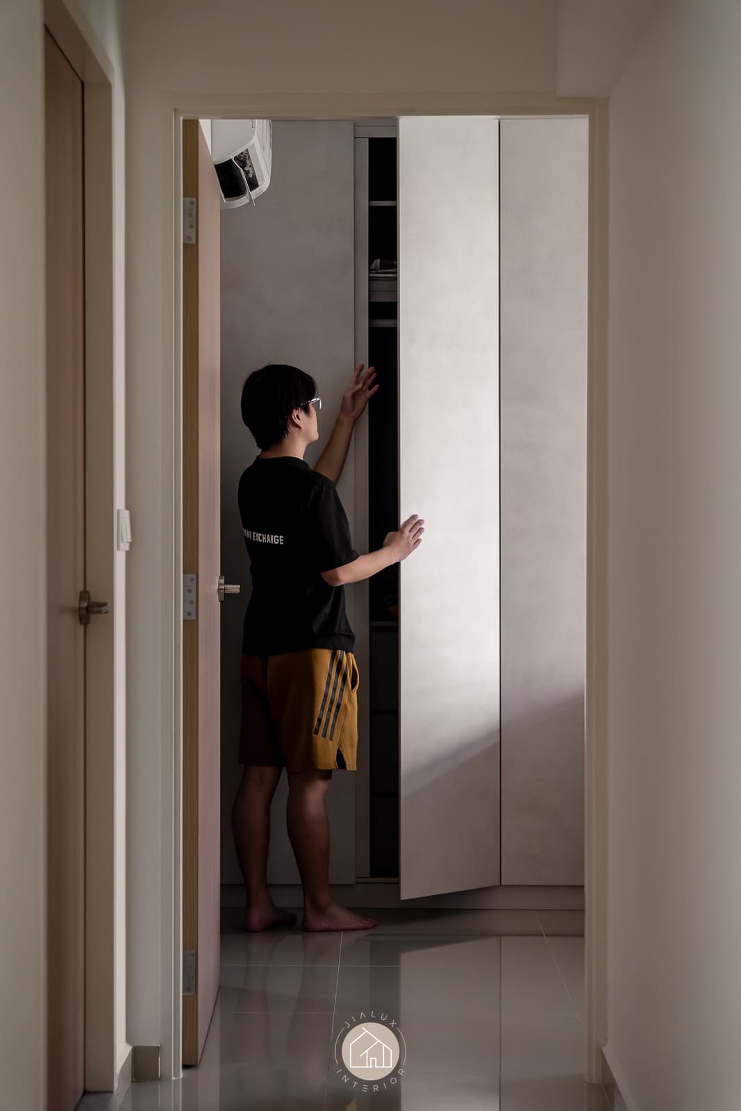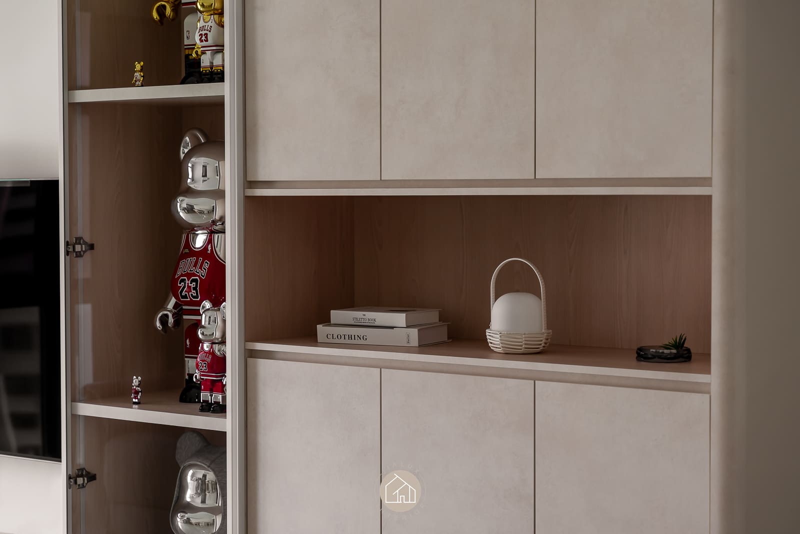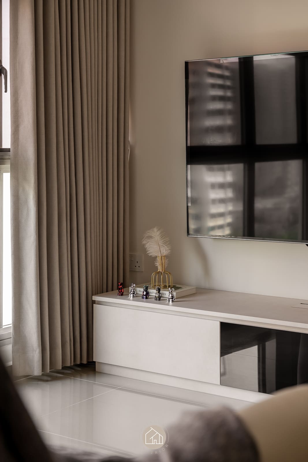 A modern minimalist residence articulated with a softer, more curated sensibility. The living zone is anchored by disciplined carpentry: a low-profile media console and a full-height storage wall that balances closed volumes with a recessed display vitrine. Warm, concealed lighting adds depth and quietly spotlights the owners’ collectibles, introducing character while preserving a clean visual line.