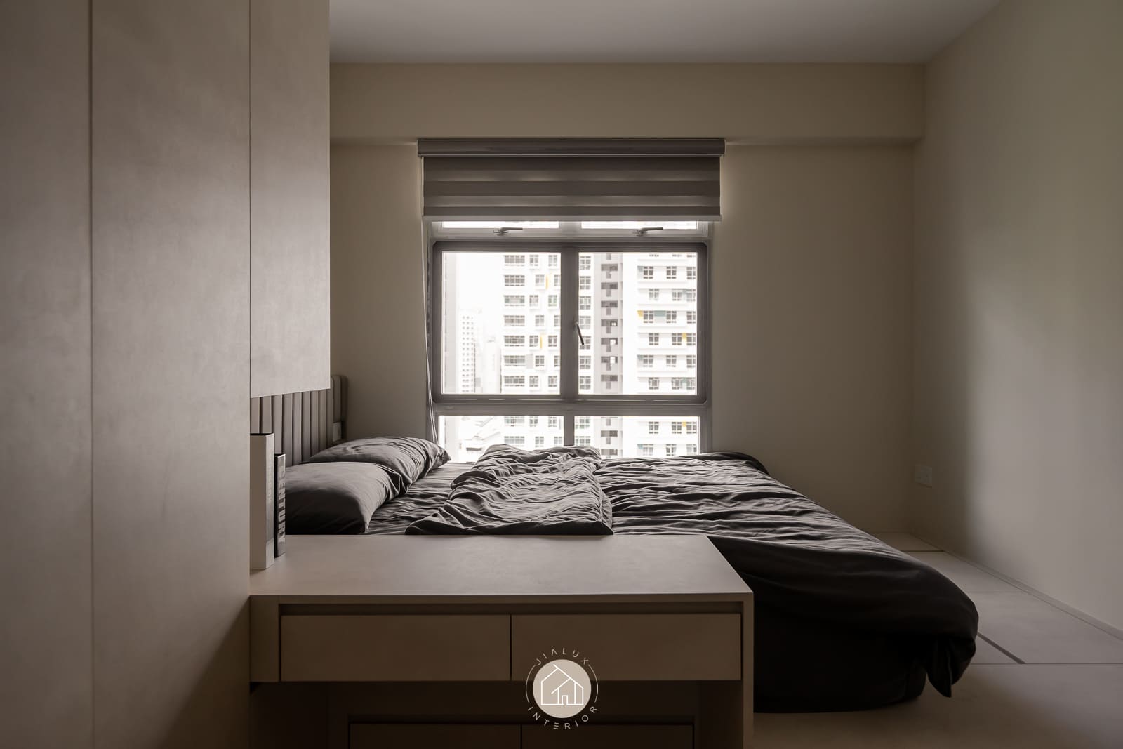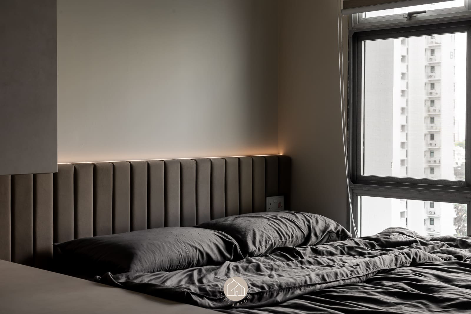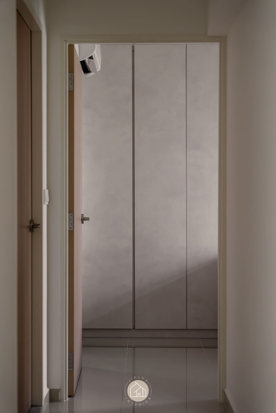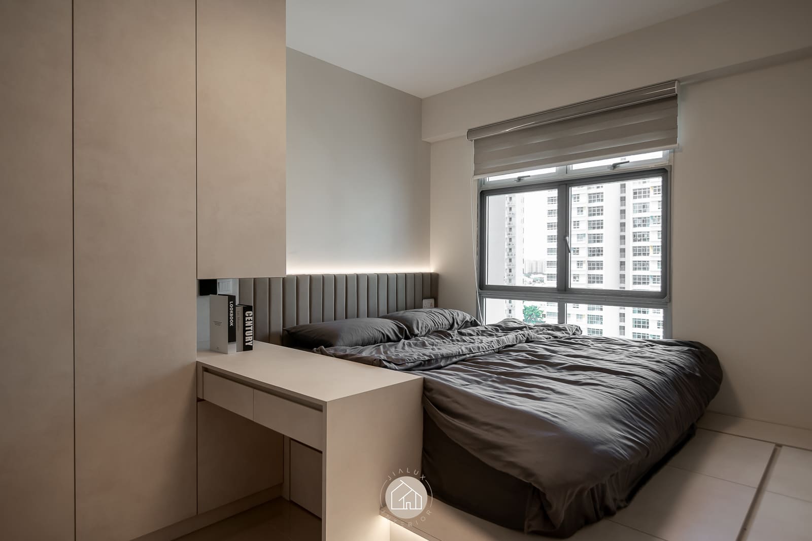 A restrained palette of warm whites, stone-textured laminates, and timber accents keeps the home calm and cohesive, while the glossy flooring gently amplifies daylight from the expansive windows. In the kitchen, the marble-look backsplash, streamlined cabinetry, and pared-back fittings create a crisp, efficient workspace with an elevated finish. The bedroom continues the same language through a ribbed upholstered headboard and integrated ledge that reads bespoke yet uncluttered. Completing the narrative, the bathroom adopts a contemporary hotel tone with large-format grey tiles, matte black fixtures, and a minimalist vanity designed for clarity and easy upkeep.