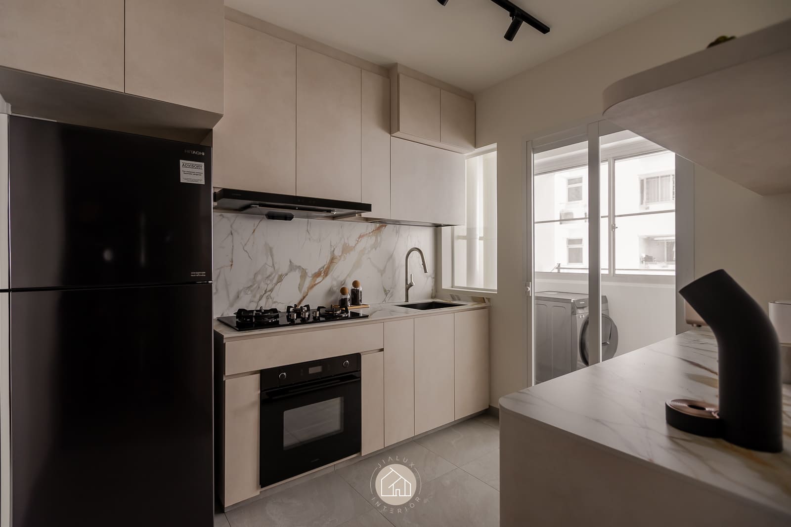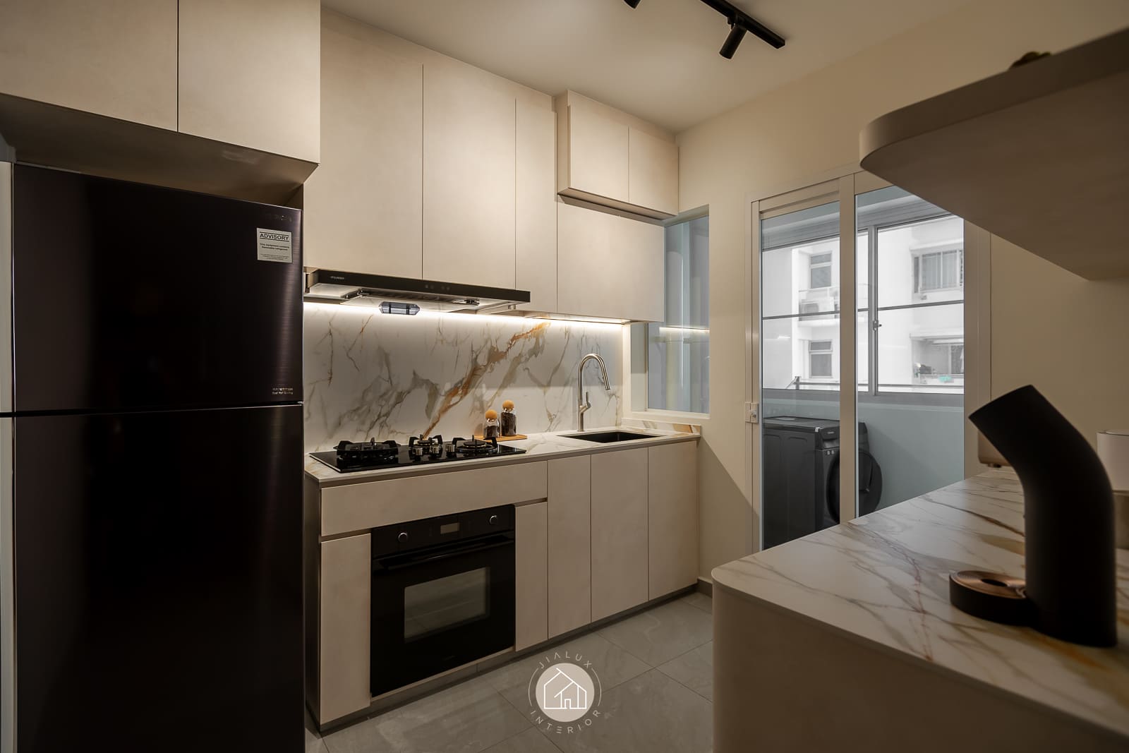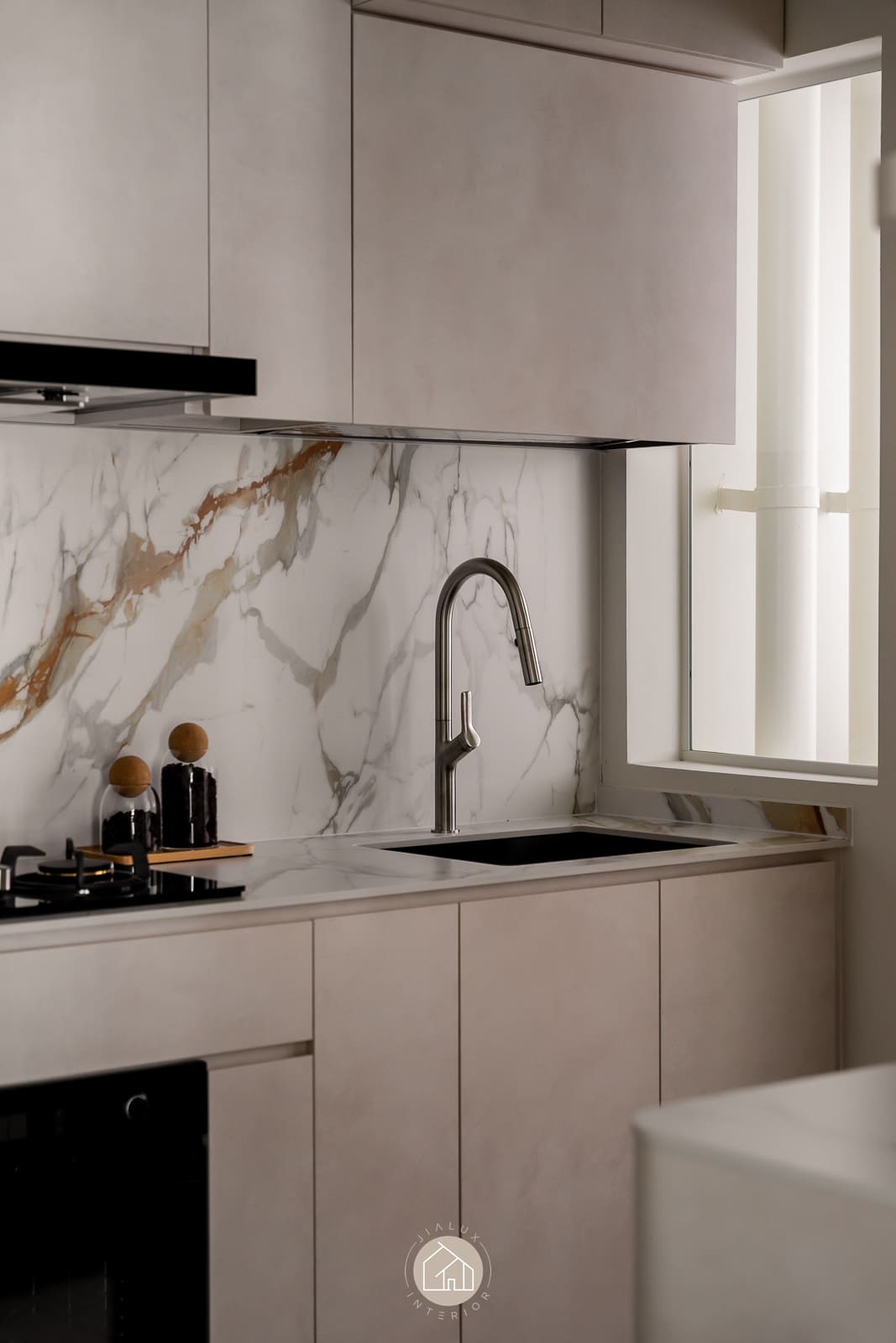 A restrained palette of warm whites, stone-textured laminates, and timber accents keeps the home calm and cohesive, while the glossy flooring gently amplifies daylight from the expansive windows. In the kitchen, the marble-look backsplash, streamlined cabinetry, and pared-back fittings create a crisp, efficient workspace with an elevated finish. The bedroom continues the same language through a ribbed upholstered headboard and integrated ledge that reads bespoke yet uncluttered. Completing the narrative, the bathroom adopts a contemporary hotel tone with large-format grey tiles, matte black fixtures, and a minimalist vanity designed for clarity and easy upkeep.