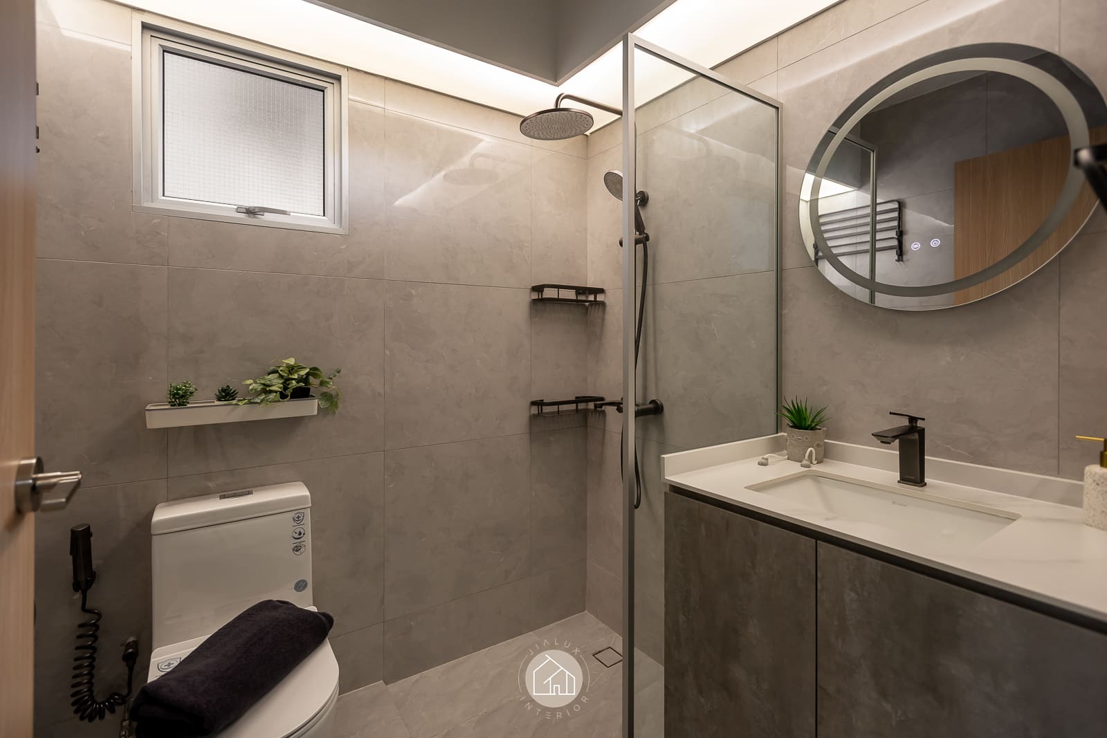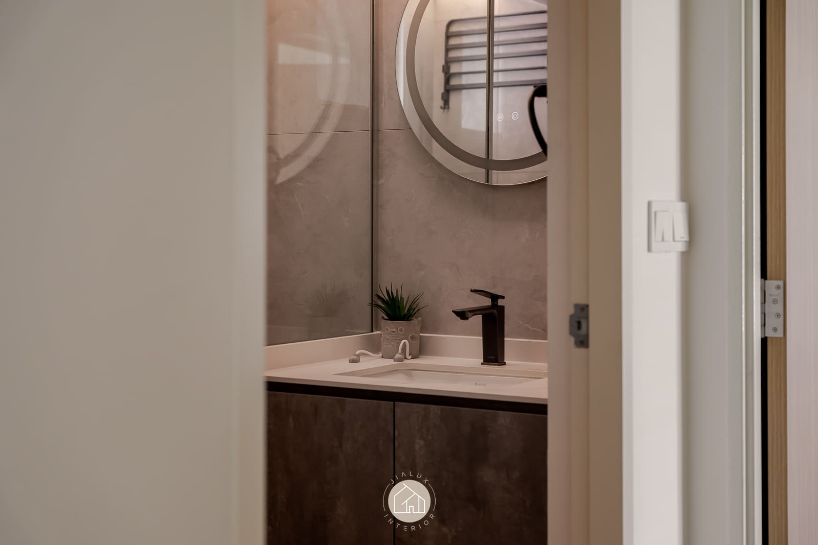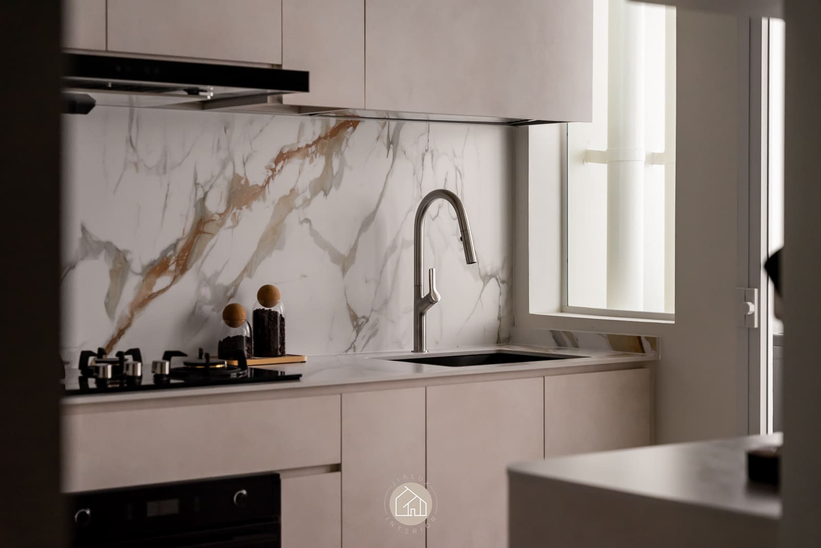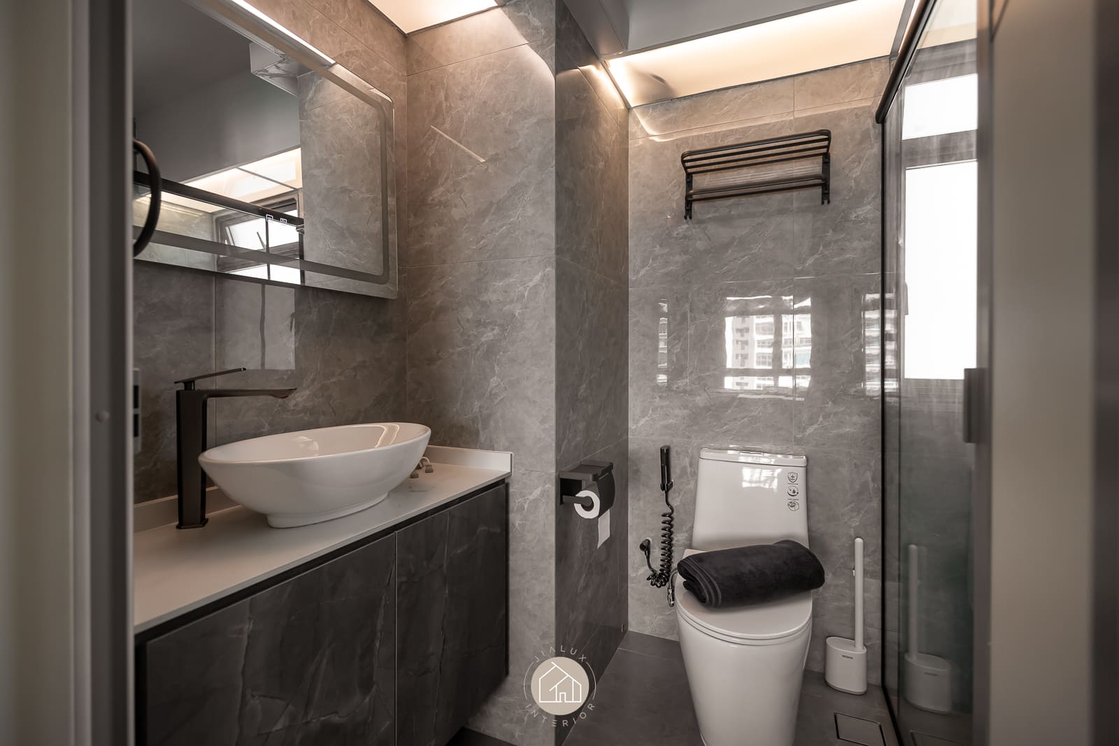 A restrained palette of warm whites, stone-textured laminates, and timber accents keeps the home calm and cohesive, while the glossy flooring gently amplifies daylight from the expansive windows. In the kitchen, the marble-look backsplash, streamlined cabinetry, and pared-back fittings create a crisp, efficient workspace with an elevated finish. The bedroom continues the same language through a ribbed upholstered headboard and integrated ledge that reads bespoke yet uncluttered. Completing the narrative, the bathroom adopts a contemporary hotel tone with large-format grey tiles, matte black fixtures, and a minimalist vanity designed for clarity and easy upkeep.