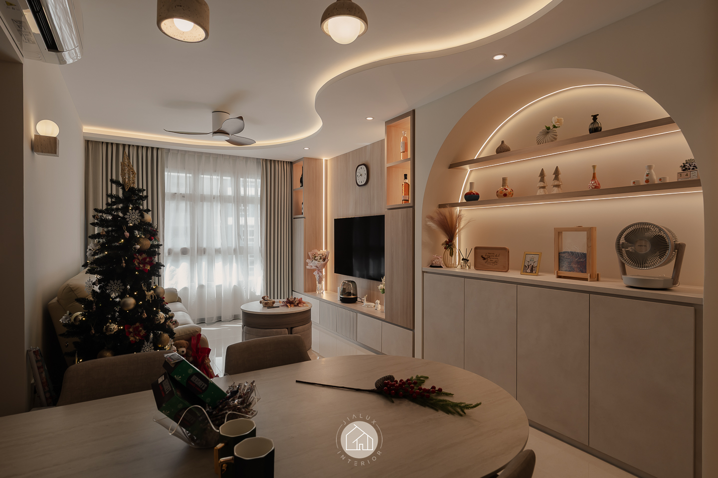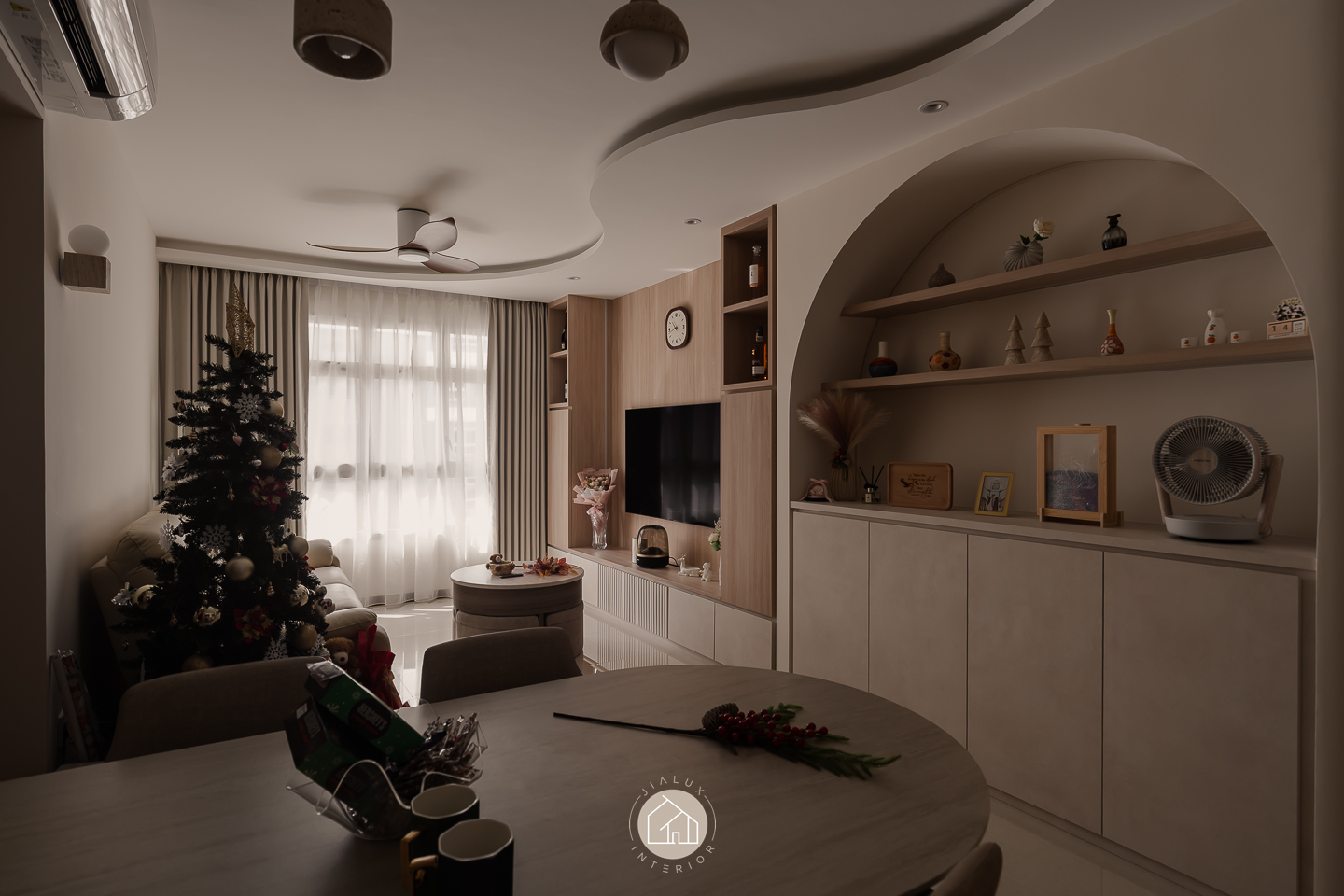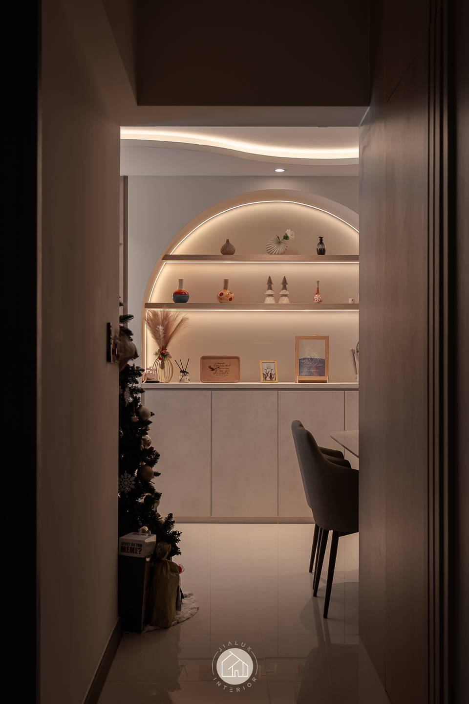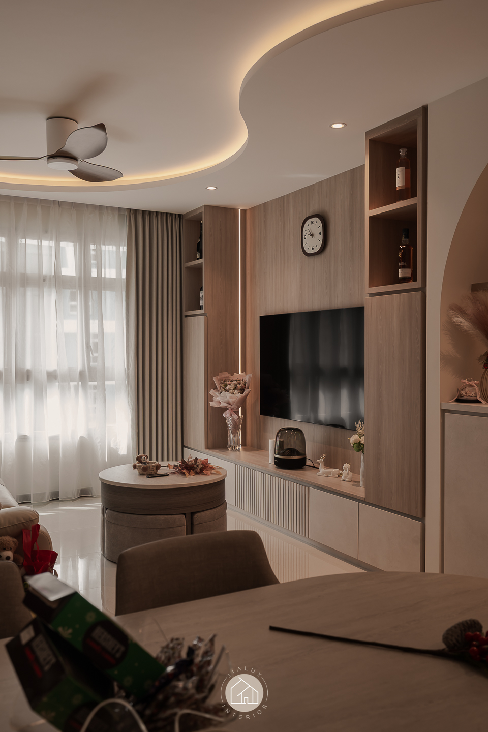 In the living and dining area, full-height cabinetry and a streamlined TV feature wall create a tidy focal point, paired with fluted detailing and understated décor. Curved ceiling profiles with cove lighting soften the space, while sheer curtains filter daylight for a relaxed ambience. The arched display niche adds character without clutter, and the bedrooms carry through the same palette with integrated storage and warm backlighting for a restful finish.
