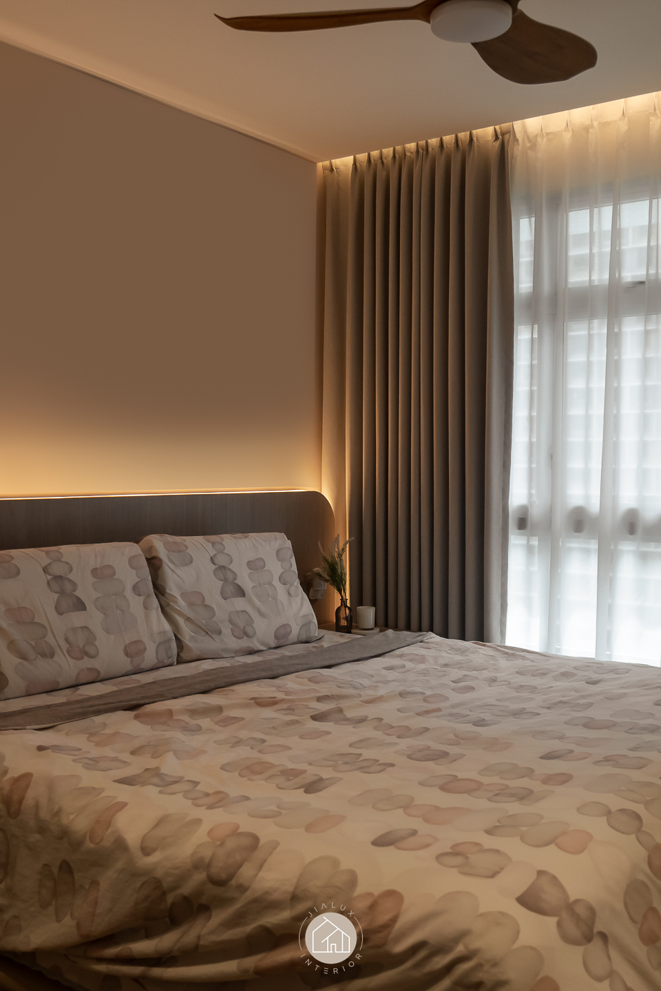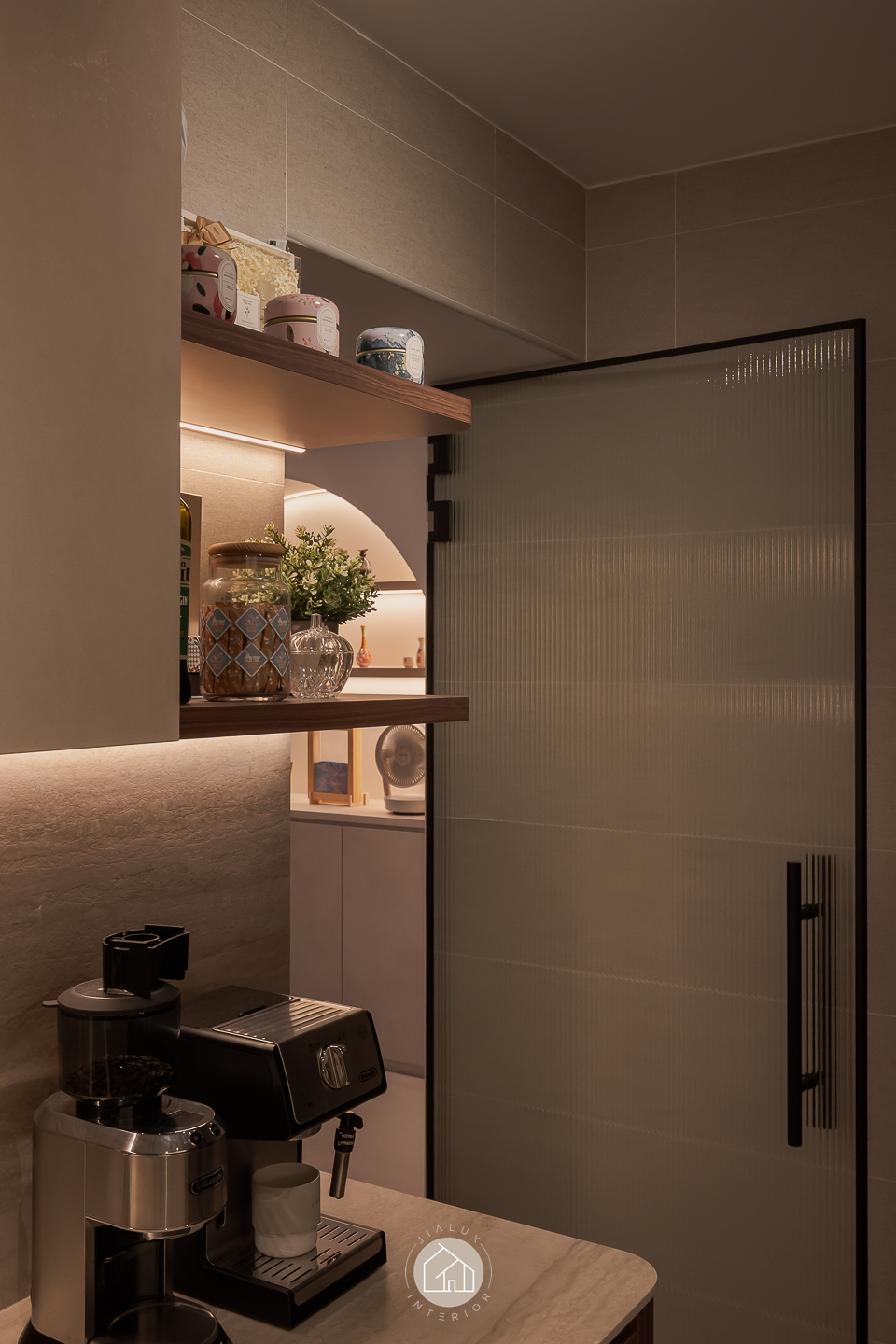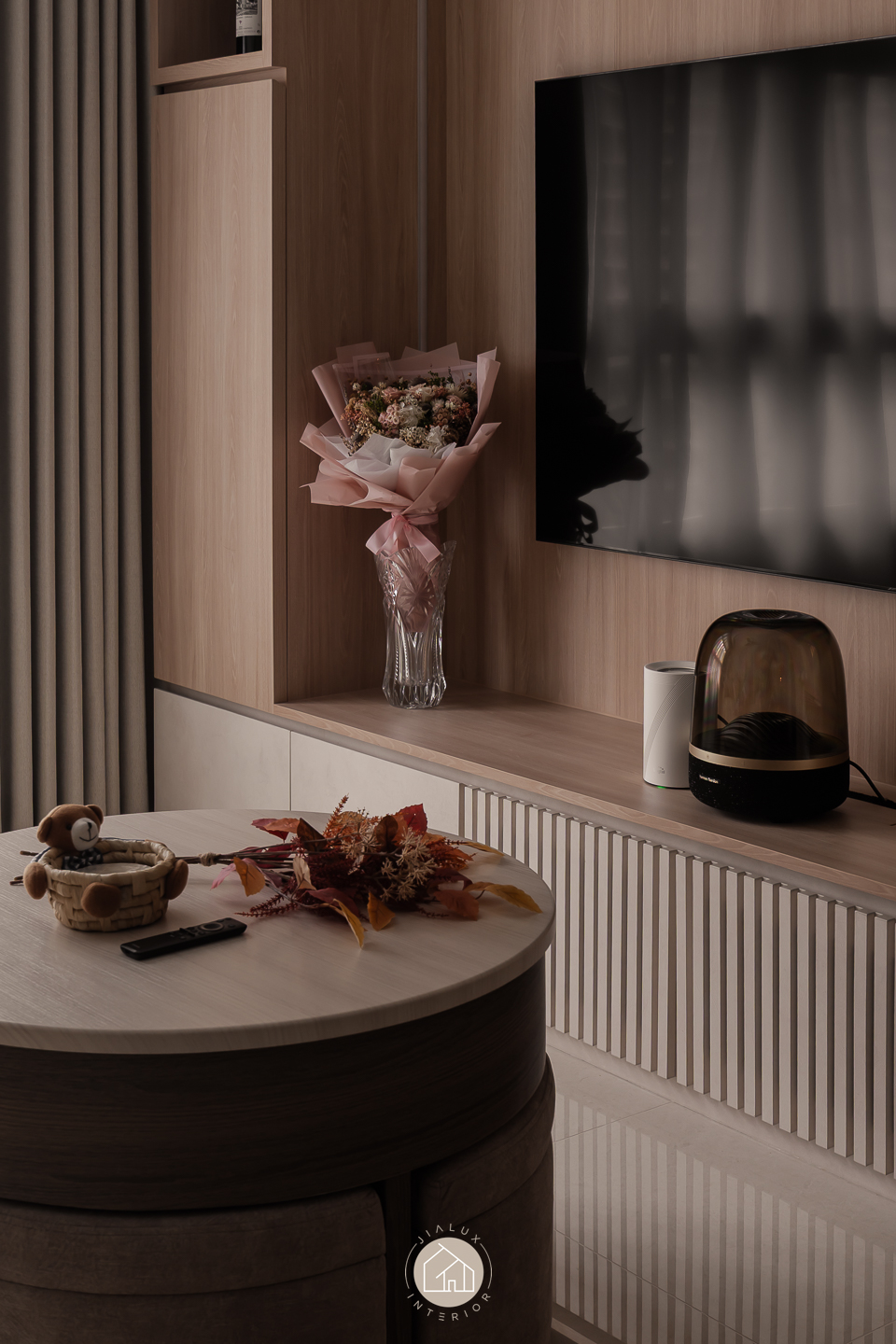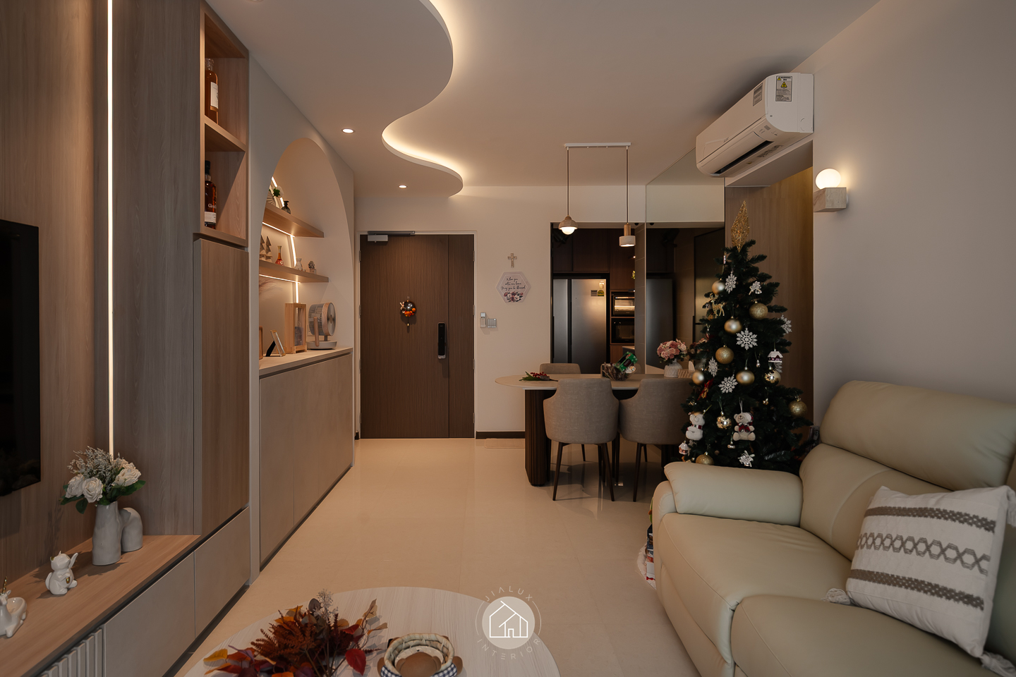 In the living and dining area, full-height cabinetry and a streamlined TV feature wall create a tidy focal point, paired with fluted detailing and understated décor. Curved ceiling profiles with cove lighting soften the space, while sheer curtains filter daylight for a relaxed ambience. The arched display niche adds character without clutter, and the bedrooms carry through the same palette with integrated storage and warm backlighting for a restful finish.