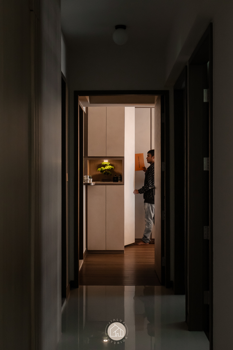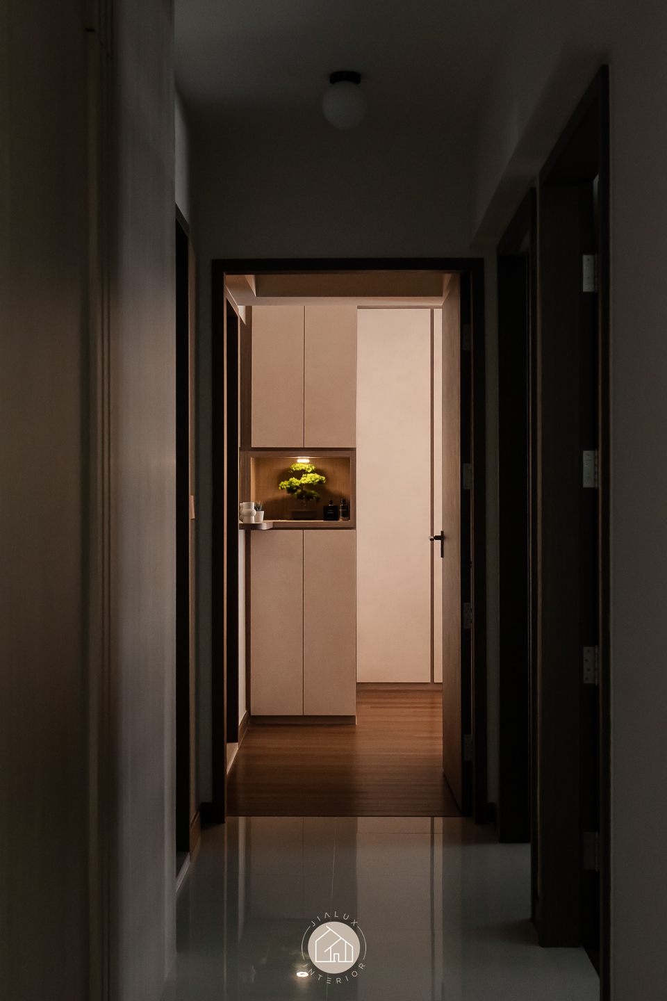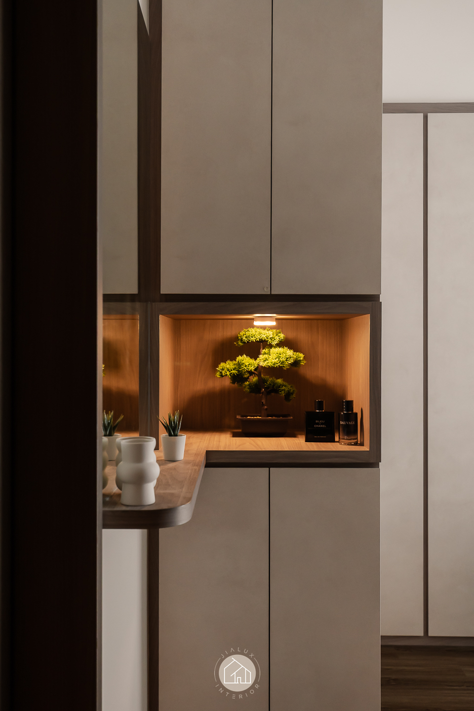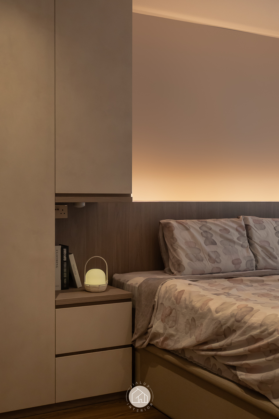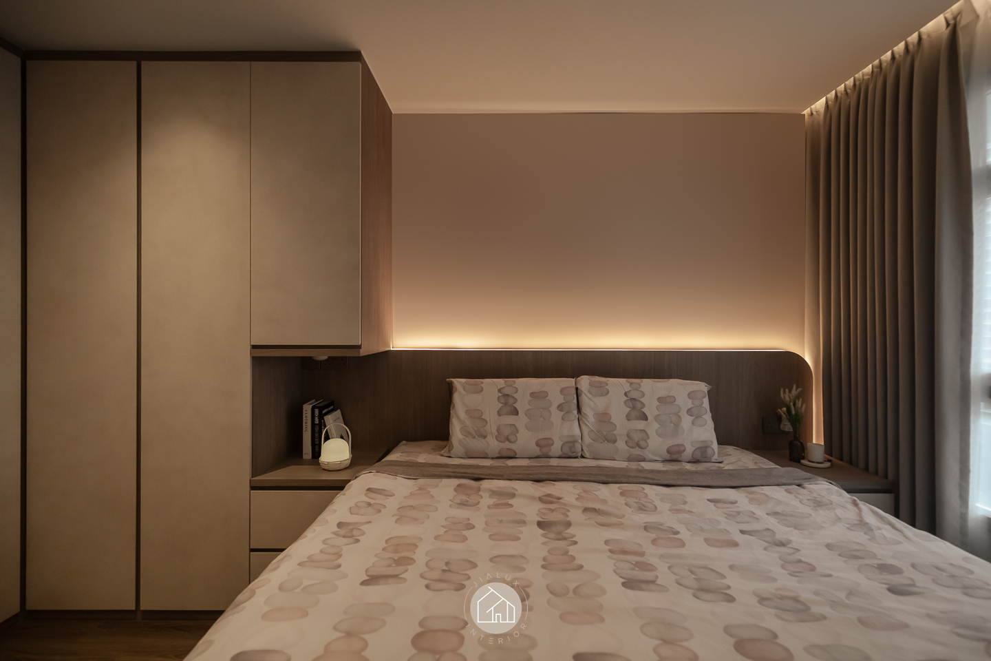 In the living and dining area, full-height cabinetry and a streamlined TV feature wall create a tidy focal point, paired with fluted detailing and understated décor. Curved ceiling profiles with cove lighting soften the space, while sheer curtains filter daylight for a relaxed ambience. The arched display niche adds character without clutter, and the bedrooms carry through the same palette with integrated storage and warm backlighting for a restful finish.