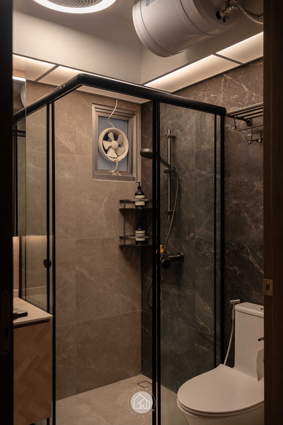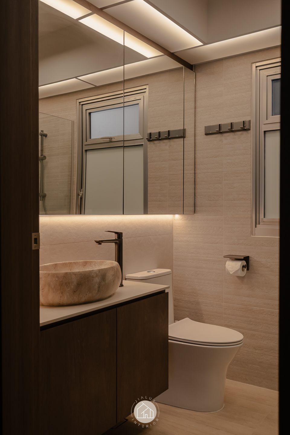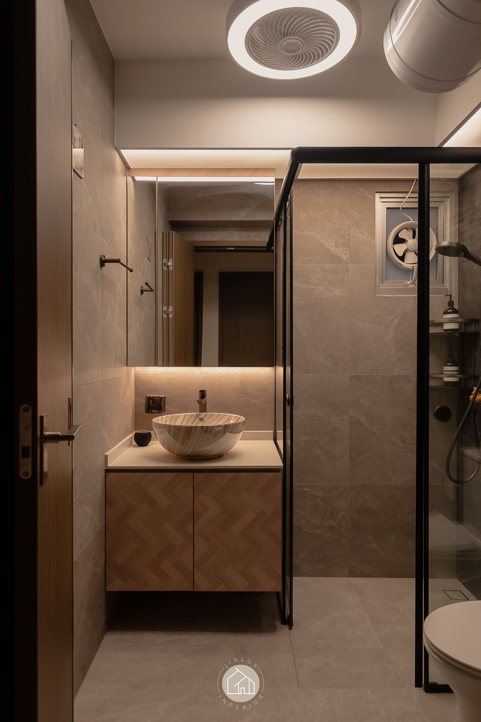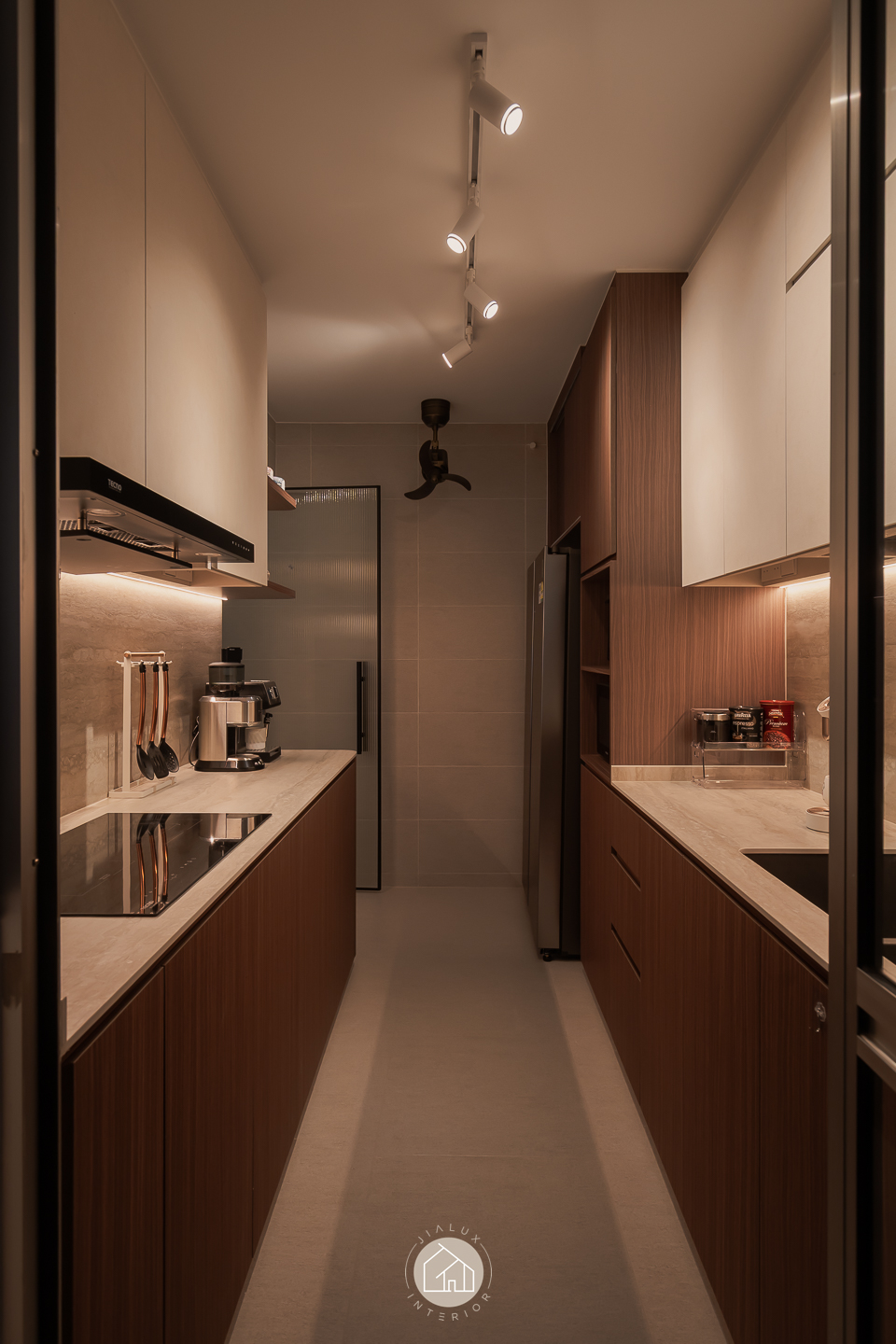 In the living and dining area, full-height cabinetry and a streamlined TV feature wall create a tidy focal point, paired with fluted detailing and understated décor. Curved ceiling profiles with cove lighting soften the space, while sheer curtains filter daylight for a relaxed ambience. The arched display niche adds character without clutter, and the bedrooms carry through the same palette with integrated storage and warm backlighting for a restful finish.