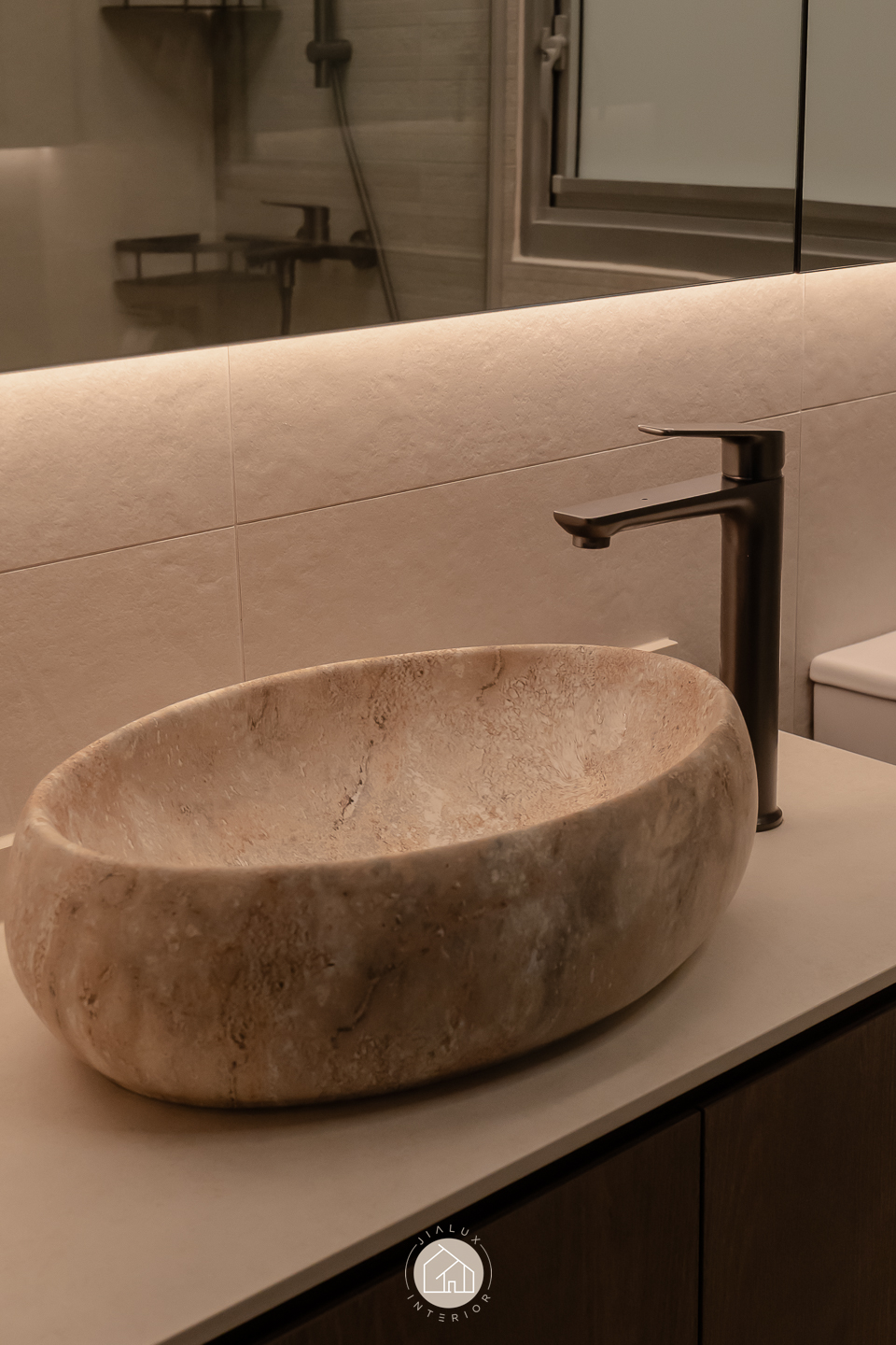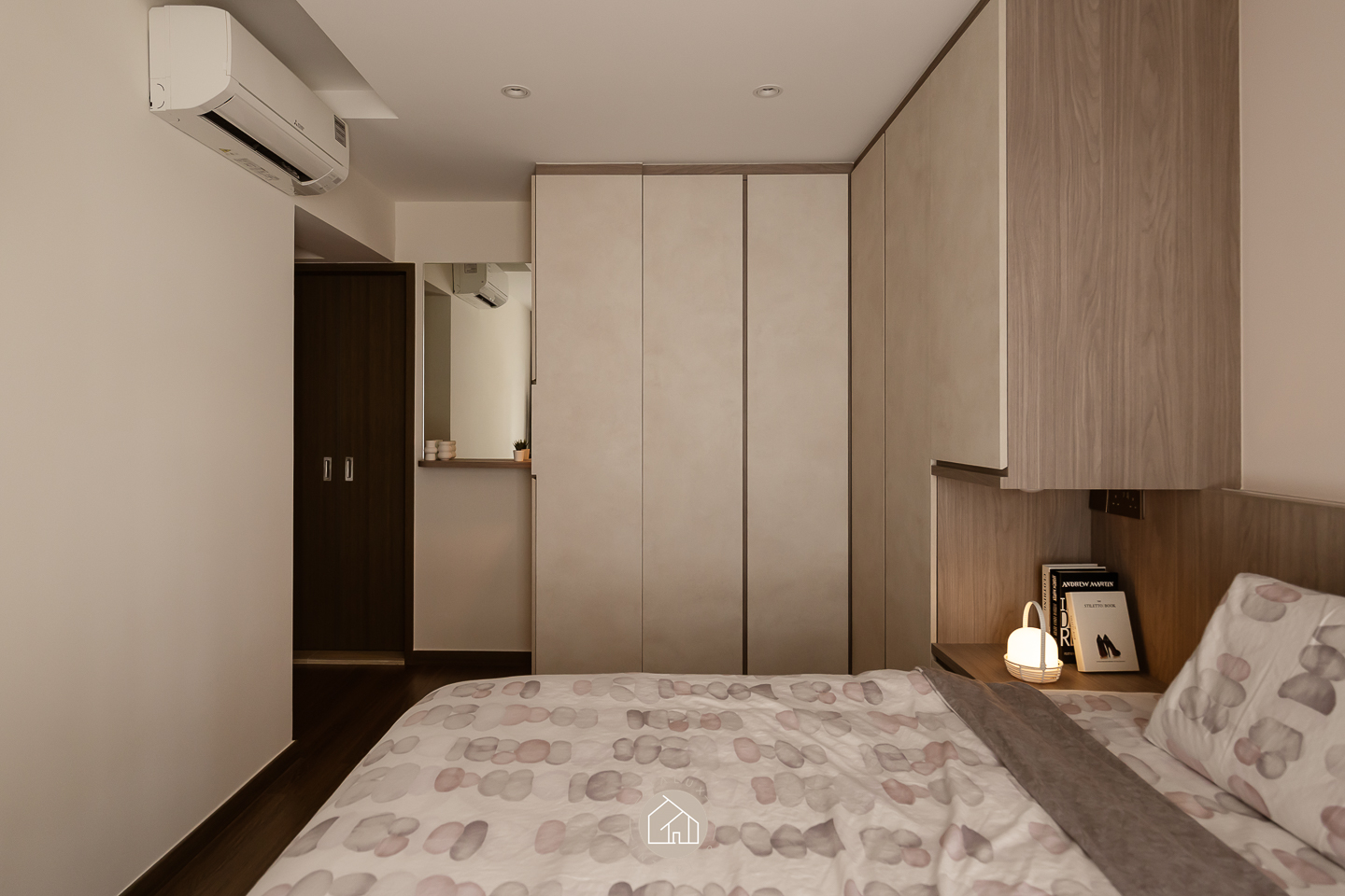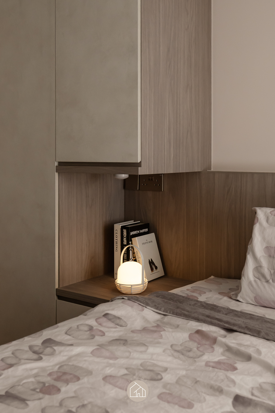A warm, minimalist concept defines this home, with soft curves, light timber tones and a calm neutral palette. Clean built-ins keep the space visually airy, while warm lighting and gentle textures add a cosy, lived-in feel.