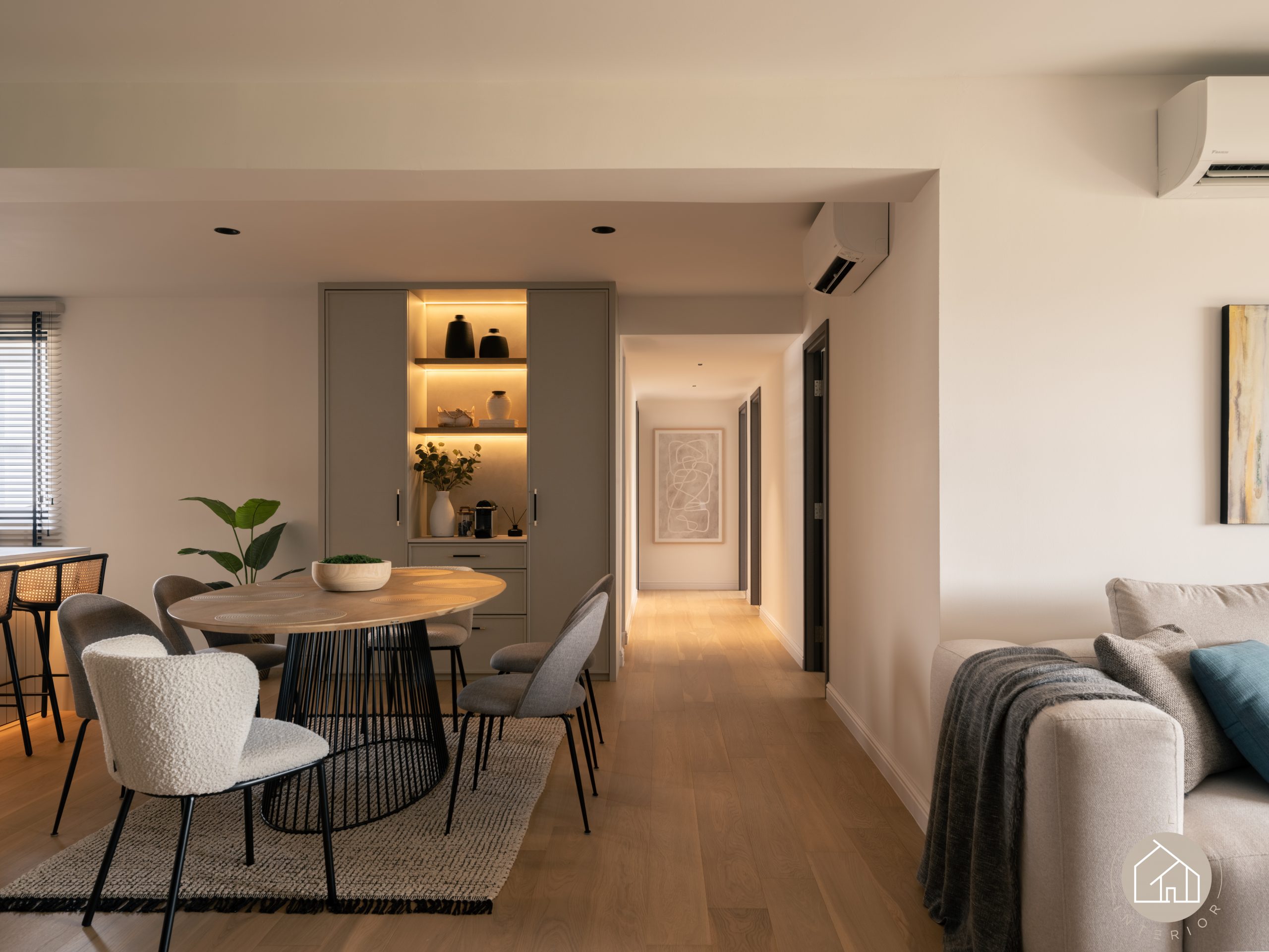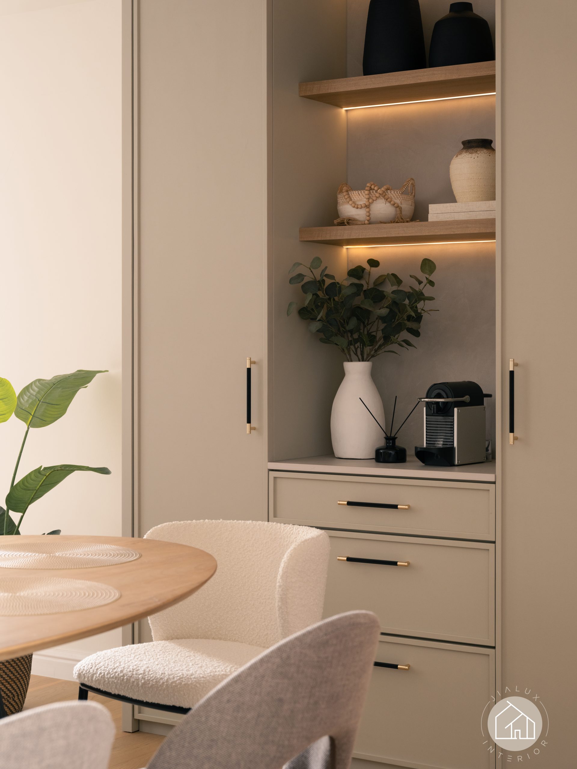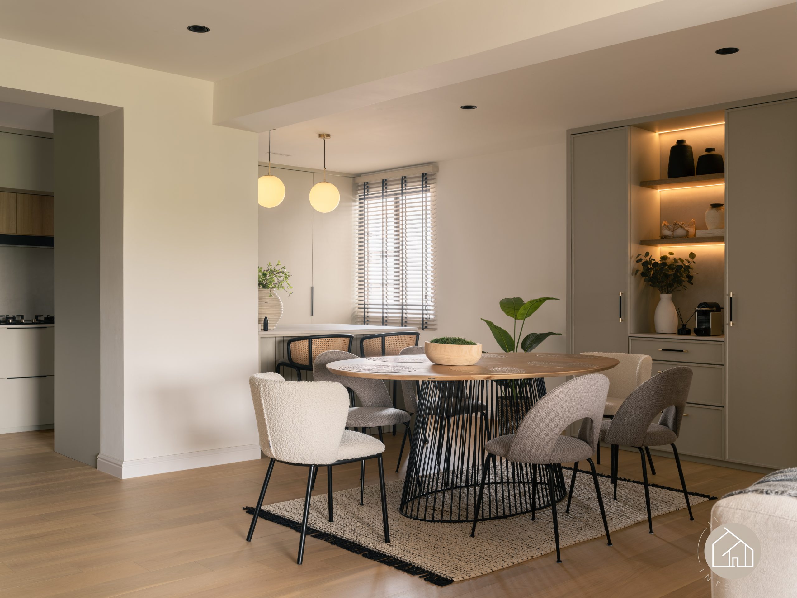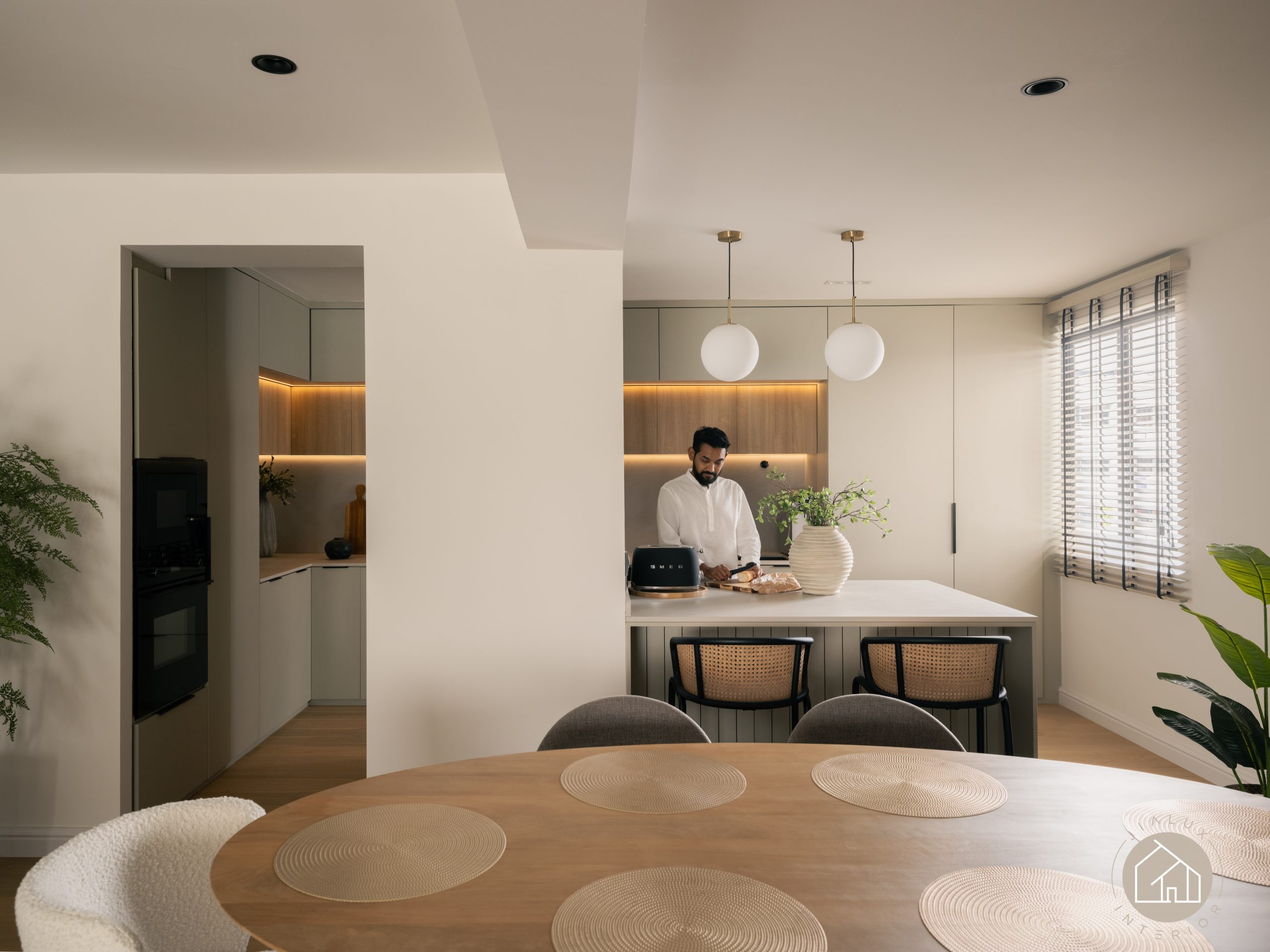 Step closer and the details do the talking. Built in carpentry keeps the visual noise low while still making room for display moments. The living room stays airy and balanced, the dining and kitchen connect seamlessly for everyday ease, and every corner feels considered, not crowded. Even the bathroom brings in a touch of personality through patterned tiles, while staying clean and timeless.