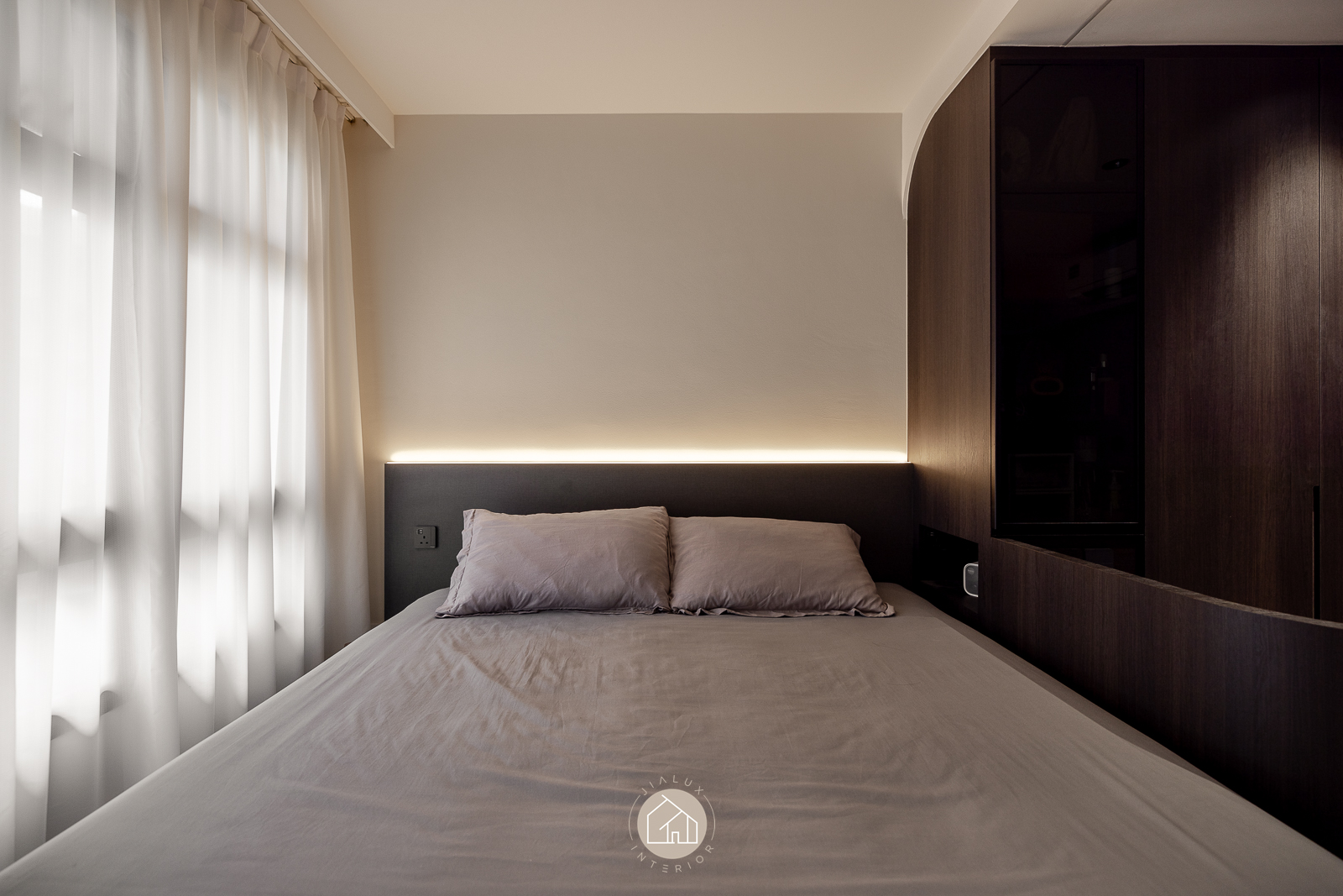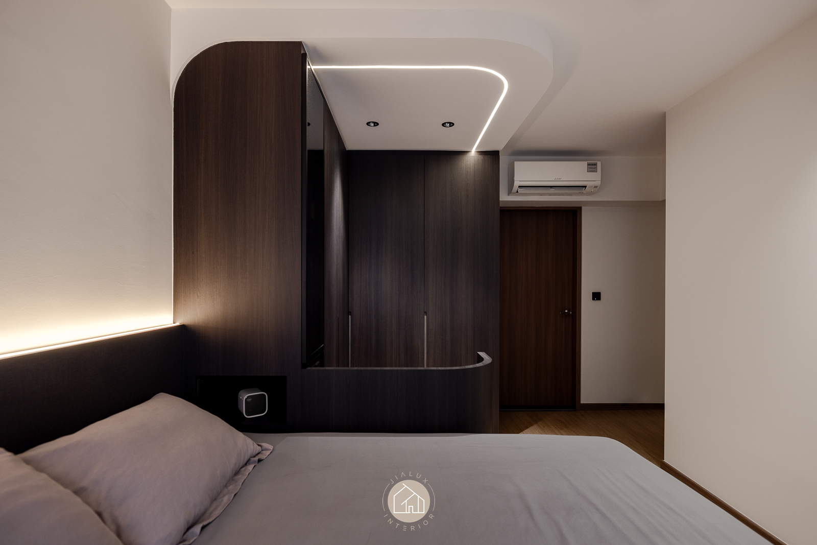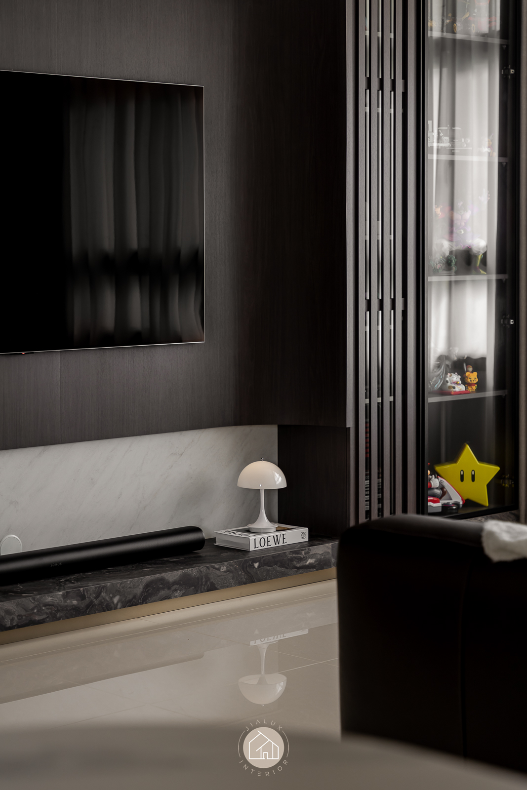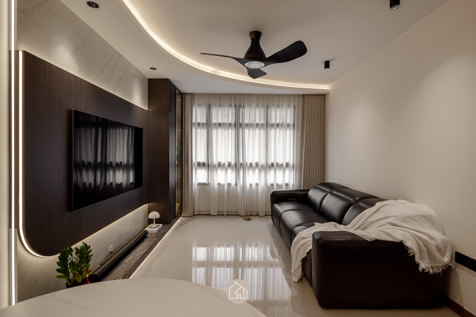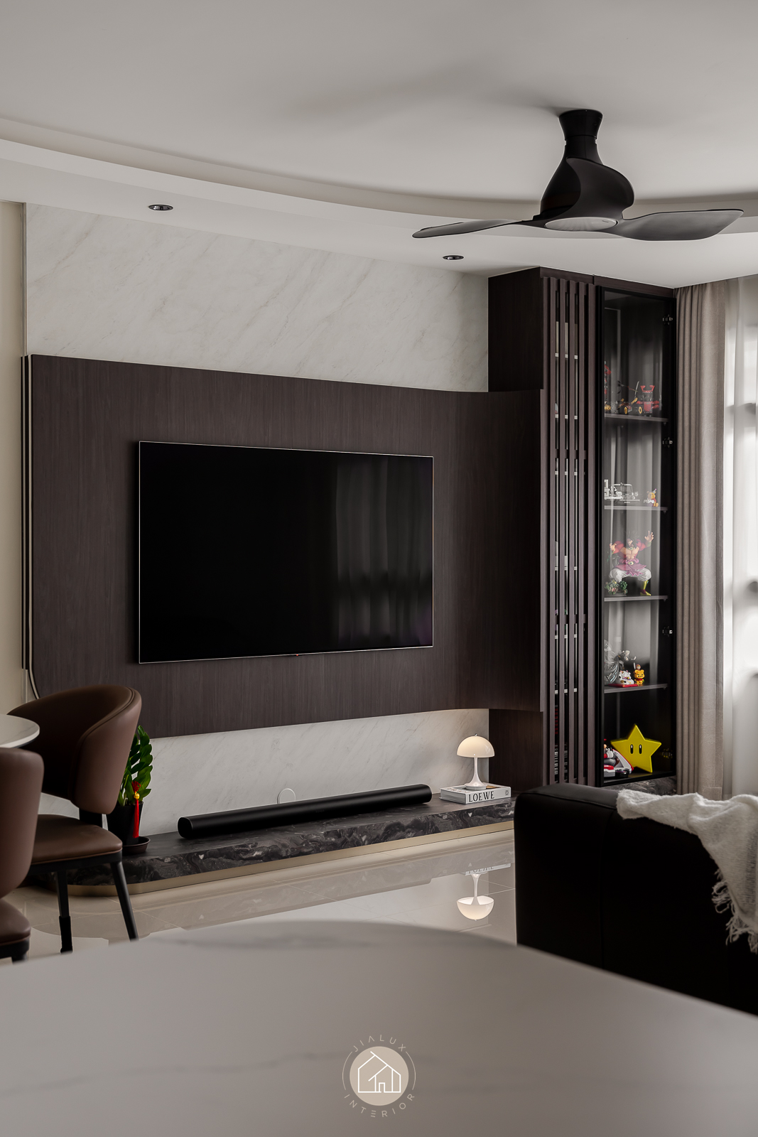 The statement piece is the TV feature wall, where dark timber and marble textures add depth and definition. A continuous ceiling cove light, linked to the TV LED, extends the glow across the room for a seamless, ambient finish that elevates the atmosphere from day to night.
