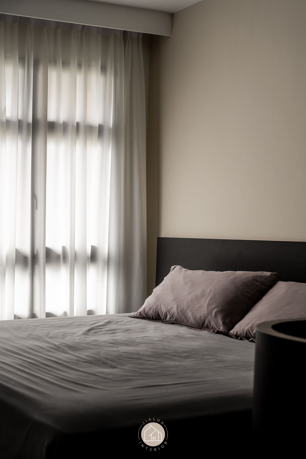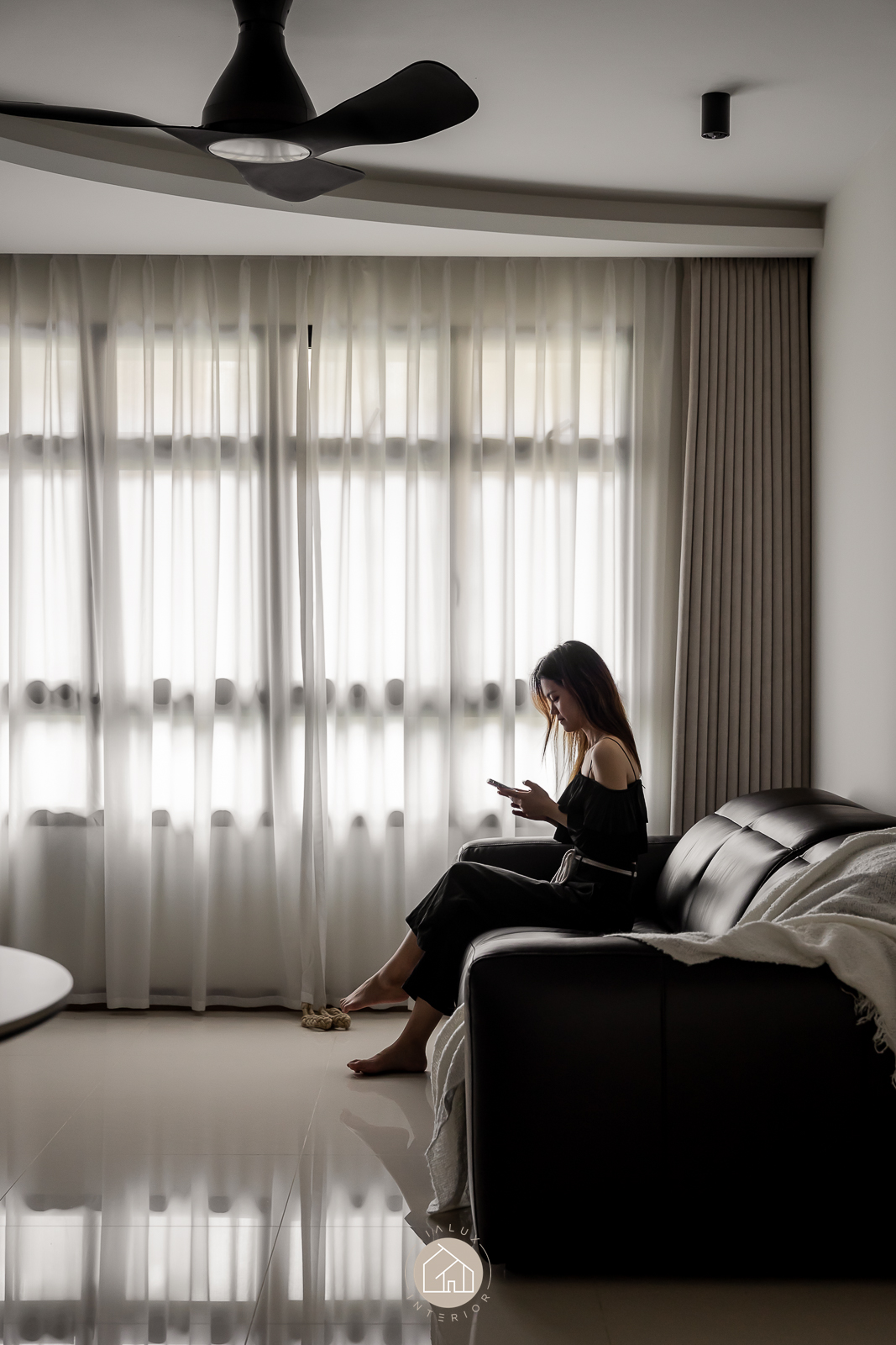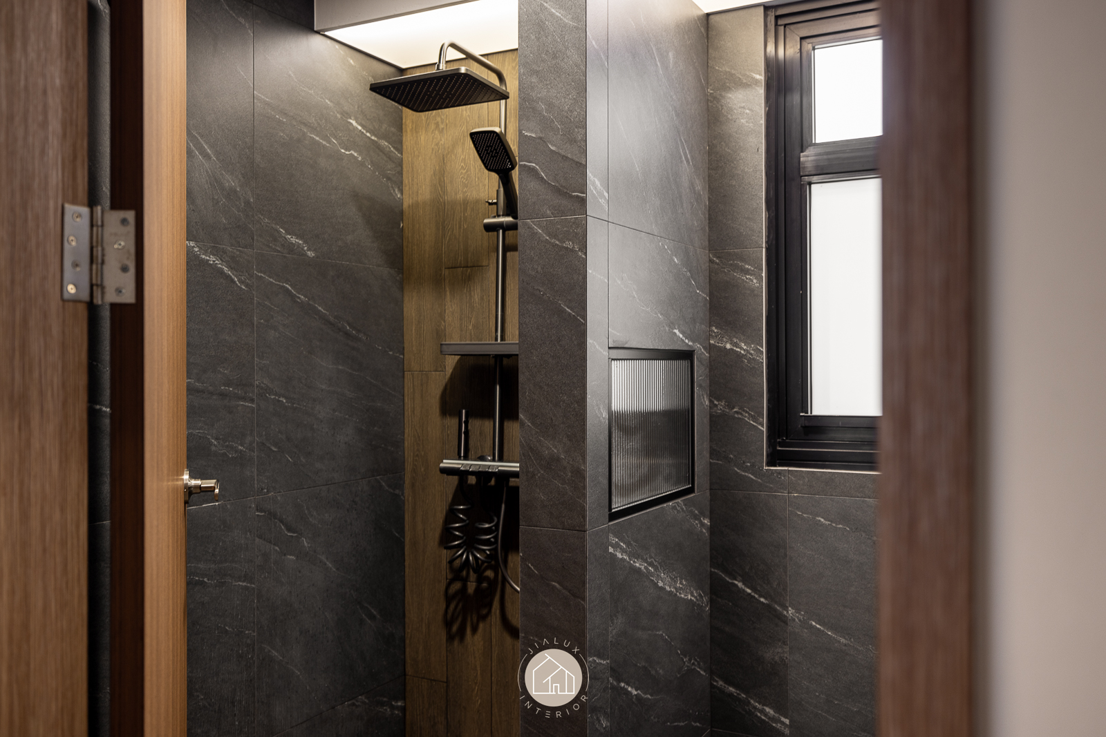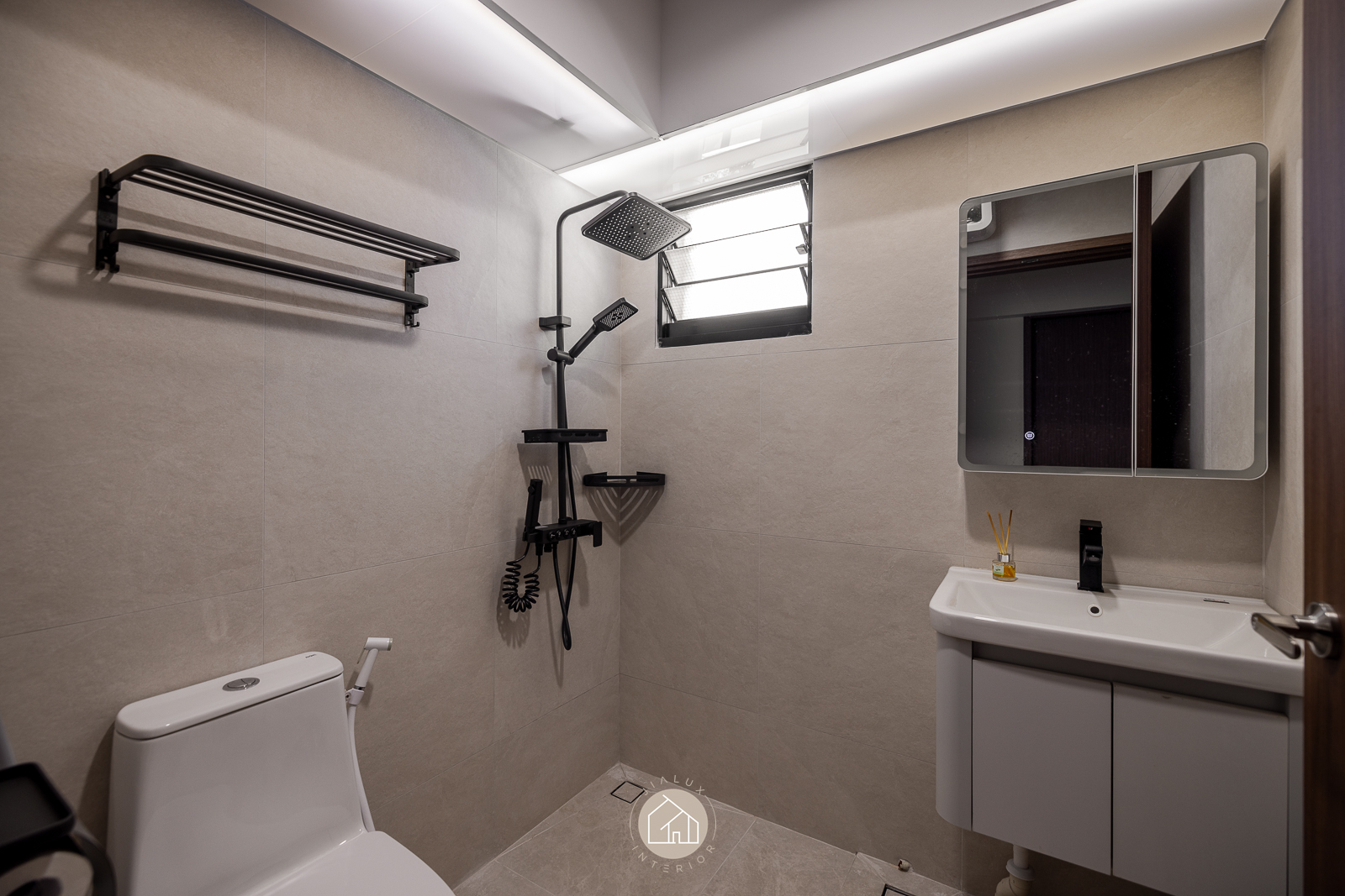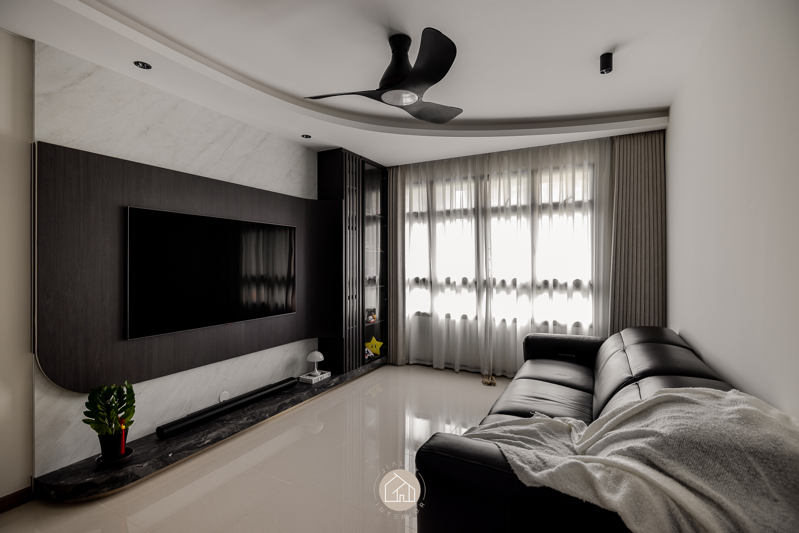 The statement piece is the TV feature wall, where dark timber and marble textures add depth and definition. A continuous ceiling cove light, linked to the TV LED, extends the glow across the room for a seamless, ambient finish that elevates the atmosphere from day to night.