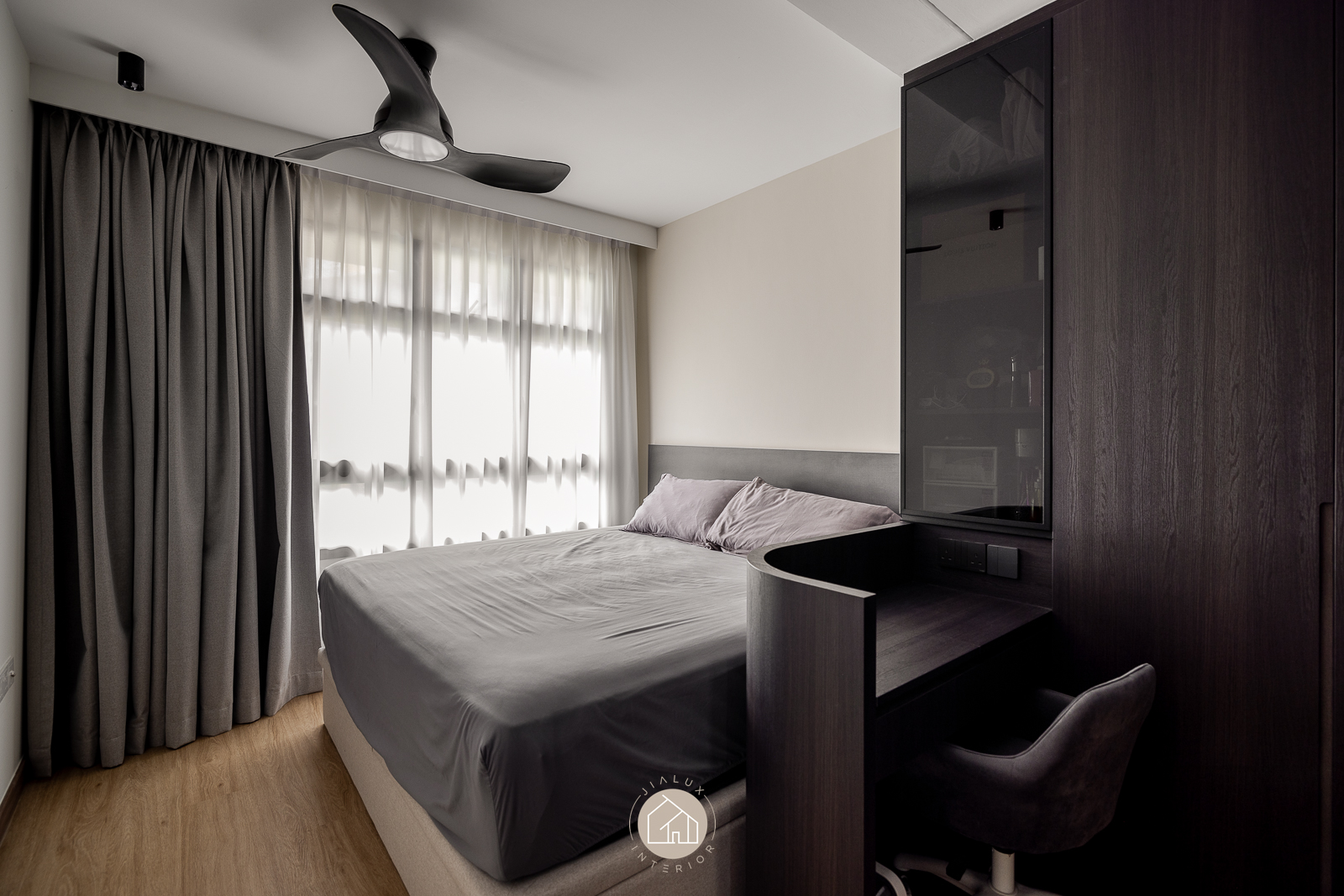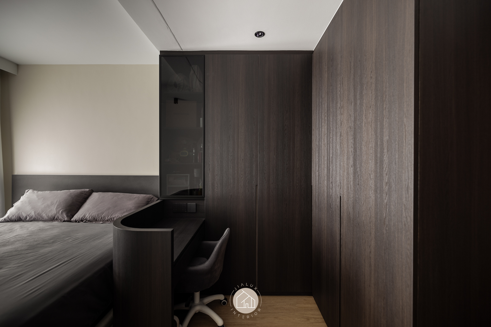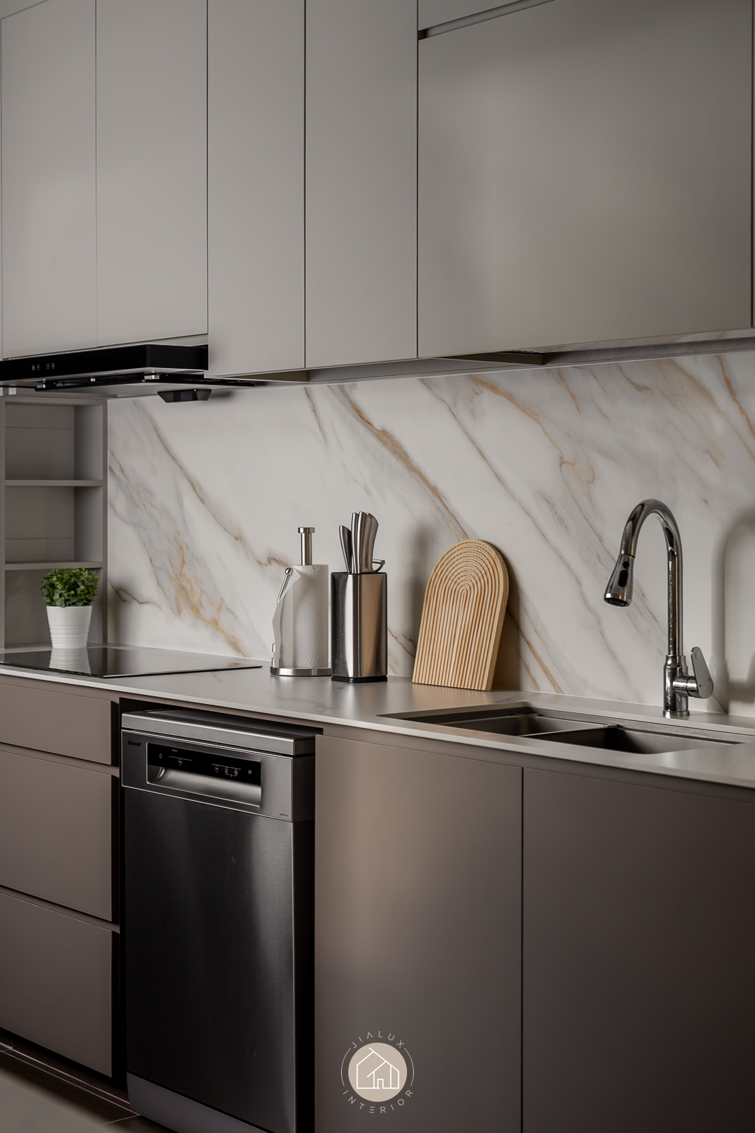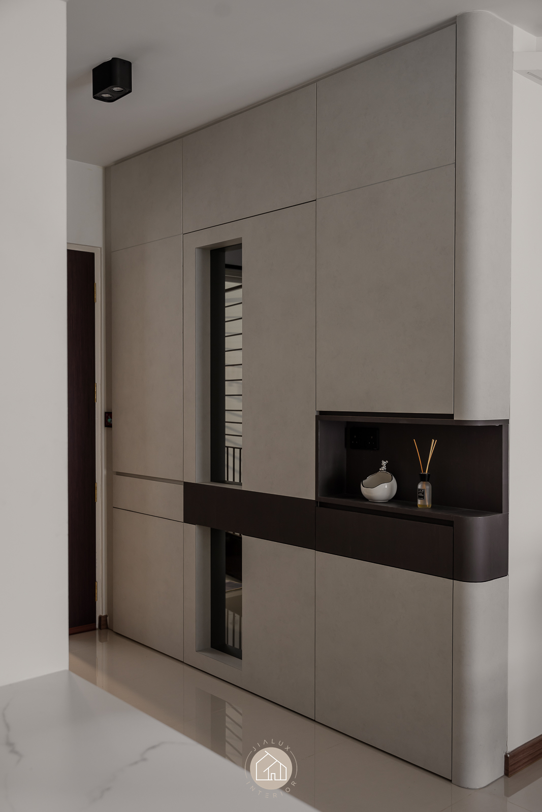 This modern interior is composed in layered greys and deep wood tones, delivering a crisp, architectural look that remains quietly warm. Clean built-ins and integrated storage keep the living and dining zone visually streamlined, allowing the space to feel open, intentional, and effortlessly neat.