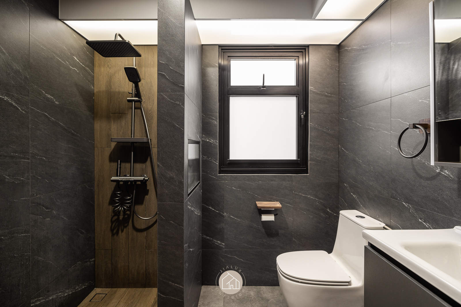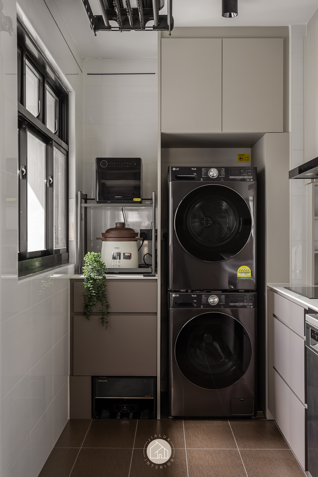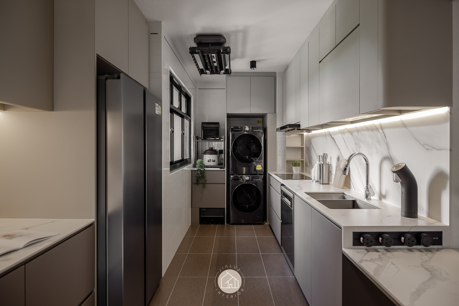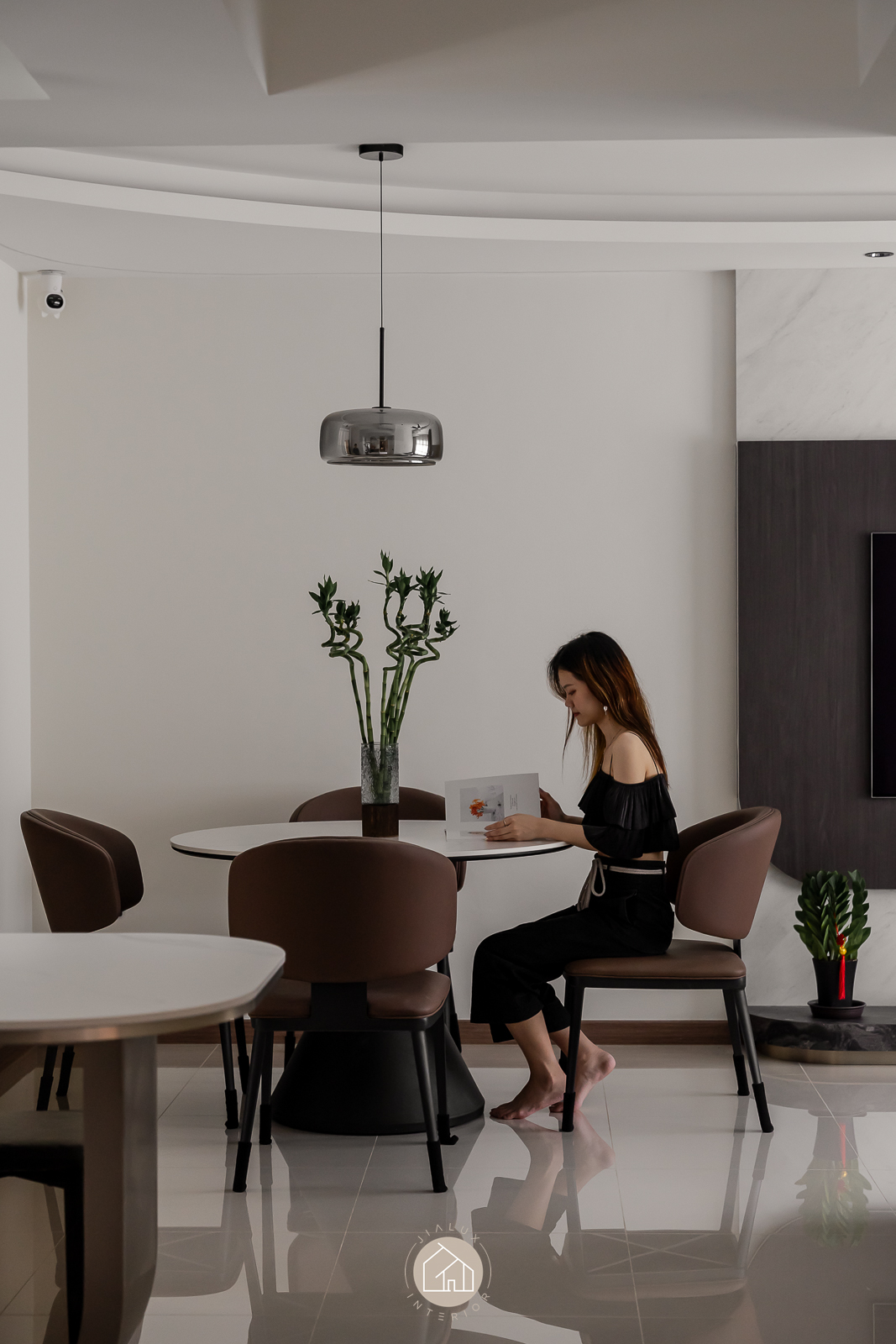 This modern interior is composed in layered greys and deep wood tones, delivering a crisp, architectural look that remains quietly warm. Clean built-ins and integrated storage keep the living and dining zone visually streamlined, allowing the space to feel open, intentional, and effortlessly neat.