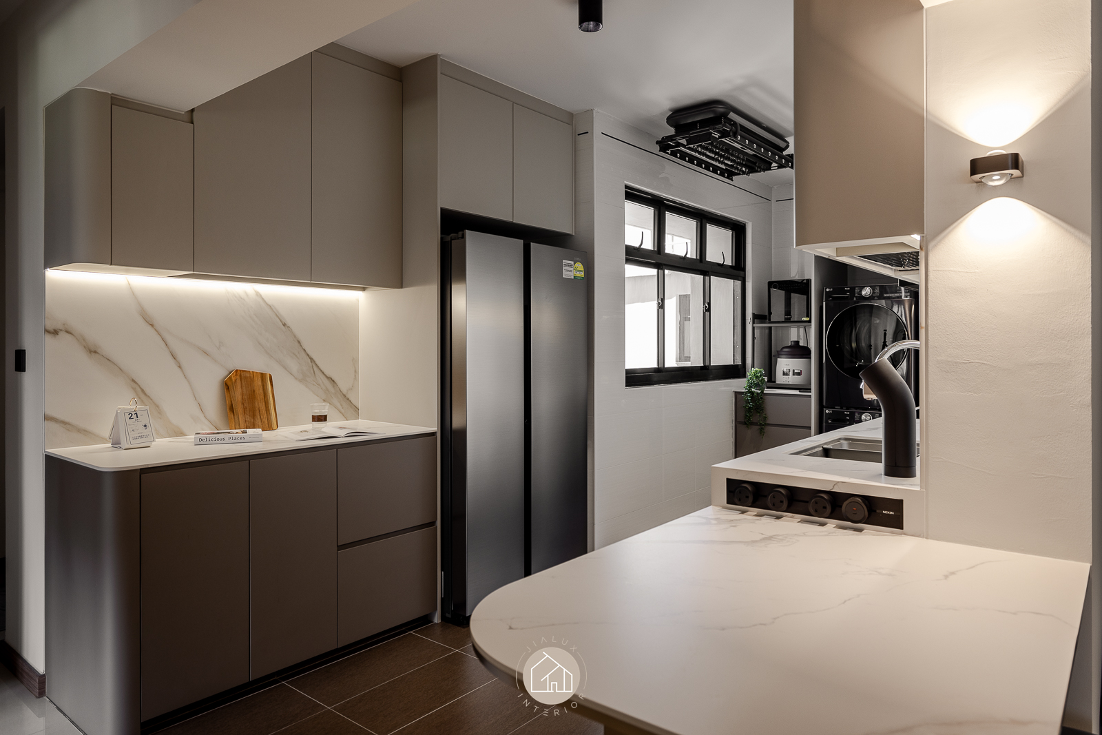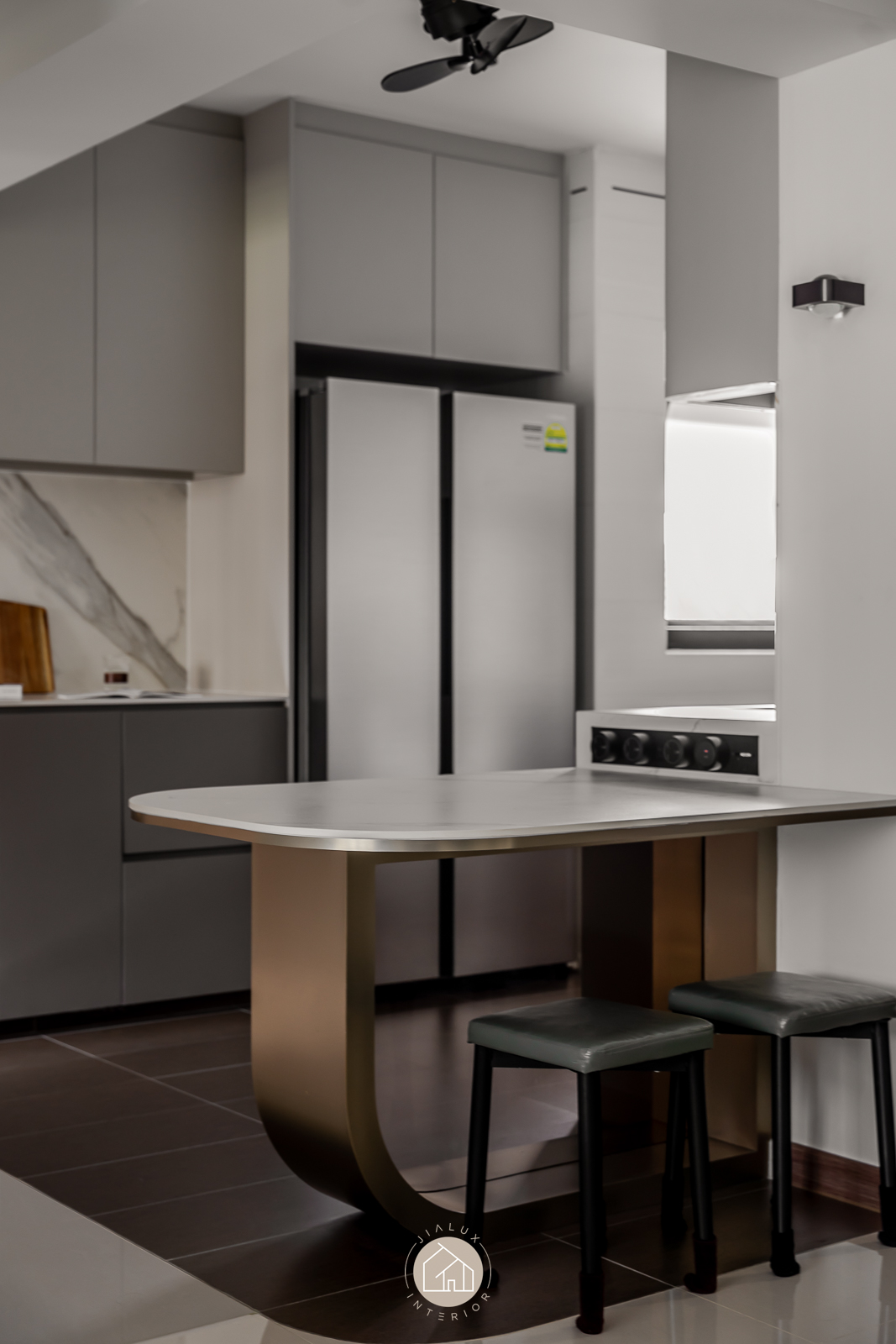 In the kitchen, sleek cabinetry and marble surfaces sharpen the galley layout, while the rounded peninsula softens the geometry and creates a refined, social edge for everyday living.